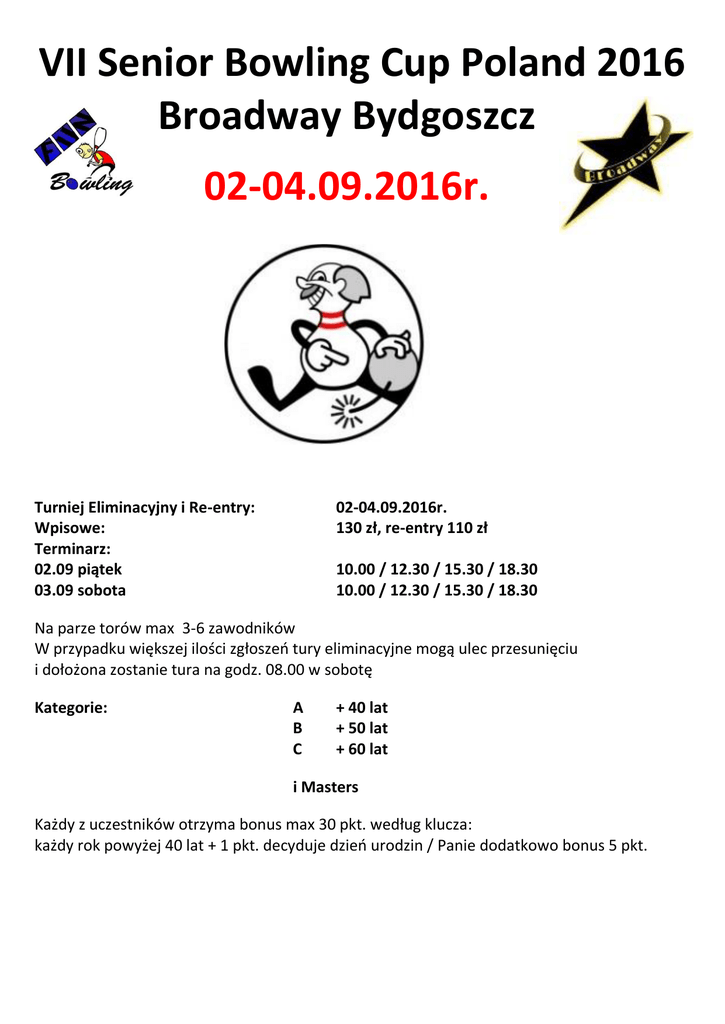 VII Senior Bowling Cup Poland 2016 Broadway Bydgoszcz 02-04.09.2016r. Turniej Eliminacyjny i Re-entry: Wpisowe: Terminarz: 02.09 piątek 03.09 sobota 02-04.09.2016r. 130 zł, re-entry 110 zł 10.00 / 12.30 / 15.30 / 18.30 10.00 / 12.30 / 15.30 / 18.30 Na parze torów max 3-6 zawodników W przypadku większej ilości zgłoszeń tury eliminacyjne mogą ulec przesunięciu i dołożona zostanie tura na godz. 08.00 w sobotę Kategorie: A B C + 40 lat + 50 lat + 60 lat i Masters Każdy z uczestników otrzyma bonus max 30 pkt. według klucza: każdy rok powyżej 40 lat + 1 pkt. decyduje dzień urodzin / Panie dodatkowo bonus 5 pkt. Każdy z uczestników w rundzie eliminacyjnej rozgrywa 6 gier których suma wraz z bonusem zadecyduje o awansie do rundy półfinałowej każdej kategorii. Przejście po 3 grach o 3 tory w prawo i lewo Do rundy półfinałowej każdej kategorii awansuje 10 najlepszych zawodników z eliminacji. , Do Masters kwalifikuje się 7 najlepszych zawodników całego turnieju według wyniku z eliminacji oraz zwycięzcy każdej grupy, w przypadku awansu z pozycji zwycięzca grupy, do Masters kwalifikuje się kolejny zawodnik z listy eliminacyjnej. Remisy: Wyższą pozycję uzyskuje zawodnik z mniejszym hndc, dalej wyższa ostatnia gra, przedostatnia, kolejna itd. 03.09.2016 sobota godz. 21.00 BANKIET - obiadokolacja, napitek i popitek) oraz wspólna zabawa Fun Bowling - osoby towarzyszące opłata 30 zł Finały 04.09.2016r. niedziela Godz. 10.00 : Grupy A/B/C – półfinały 1. Każdy z zawodników rozgrywa 5 gier które doliczone do wyniku z eliminacji dają zajęte miejsce w grupie. Do finału awansuje 4 pierwszych zawodników. Po 3 grach zawodnicy przesuwają się o 2 tory w prawo. Godz. 14.00 FINAŁY: Grupy A/B/C ( od zera) Każdy z zakwalifikowanych zawodników rozegra pojedynek każdy z każdym Bonusy: 20 pkt. wygrana, 10 pkt. remis Grupa A tory 7-10, grupa B tory 3-6 i grupa C tory 1-2 Godz. 15.30 PÓŁ FINAŁ MASTERS: ELIMINATOR 1. Każdy z zawodników rozgrywa 2 gry po których odpadają zawodnicy z pozycji 8-9-10, 2. Każdy z zawodników rozgrywa 2 gry po których odpadają zawodnicy z pozycji 5-6-7, Do rundy finałowej awansuje 4 najlepszych zawodników. Po każdej 1 rundzie zawodnicy przesuwają się o 2 tory w prawo. Godz. 17.00 FINAŁ MASTERS (od zera) Każdy z zakwalifikowanych zawodników rozegra pojedynek każdy z każdym Bonusy: 20pkt. wygrana , 10pkt. remis VII SENIOR BOWLING CUP POLAND 2016 Każdy z uczestników otrzyma koszulkę wraz z nadrukowanymi nazwiskami zwycięzców Masters 2010, 2011, 2012,2013 i 2014 i 2015 w której weźmie udział w turnieju. Dla czołowej czwórki każdej grupy przygotowano specjalne NAGRODY PROSIMY O JAK NAJSZYBSZE ZGŁOSZENIA CO POZWOLI NA DOBÓR ODPOWIEDNI ROZMIARU KOSZULEK. Rejestracja on-line na stronie www.funbowling.pl oraz e-mail prosimy przesyłać na adres e-mail [email protected] przy zgłoszeniu prosimy o podanie: daty urodzin – wzrost, oraz obwód klatki piersiowej w celu wykonania koszulek. Całkowity koszt udziału w Imprezie oraz w bankiecie wynosi 130 zł re-entry 110 zł Wpłat należy dokonać na konto: z podaniem imienia i nazwiska Kerbi Grażyna Martin 62-002 Suchy Las Zielna 3 WBK Nr 93109018960000000114701462 NIECH FUN BĘDZIE Z NAMI :)