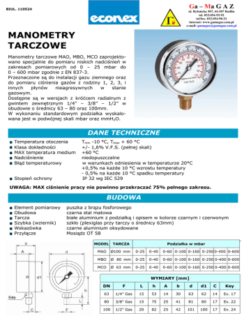 Ga – Ma G A Z BIUL. 110524 ul. Rybnicka 307, 44-307 Radlin tel. 032/454-92-92 tel/fax. 032/454-90-21 internet: www.gamagaz.com.pl e-mail: [email protected] MANOMETRY TARCZOWE Manometry tarczowe MAO, MBO, MCO zaprojektowano specjalnie do pomiaru niskich nadciśnień w zakresach pomiarowych od 0 – 25 mbar do 0 – 600 mbar zgodnie z EN 837-3. Przeznaczone są do instalacji gazu ziemnego oraz do pomiaru ciśnienia gazów z rodziny 1, 2, 3, i innych płynów nieagresywnych w stanie gazowym. Dostępne są w wersjach z króćcem radialnym z gwintem zewnętrznym 1/4” – 3/8” – 1/2” w obudowie o średnicy 63 – 80 oraz 100mm. W wykonaniu standardowym podziałka wyskalowana jest w podwójnej skali mbar oraz mmH2O. DANE TECHNICZNE Temperatura otoczenia Klasa dokładności MAX temperatura medium Nadciśnienie Błąd temperaturowy Stopień ochrony Tmin -10 °C, Tmax + 60 °C +/- 1,6% V.F.S. (pełnej skali) +60 °C niedopuszczalne w warunkach odniesienia w temperaturze 20°C +0,5% na każde 10 °C wzrostu temperatury - 0,5% na każde 10 °C spadku temperatury IP 32 wg IEC 529 UWAGA: MAX ciśnienie pracy nie powinno przekraczać 75% pełnego zakresu. BUDOWA Element pomiarowy Obudowa Tarcza Szybka (wziernik) Wskazówka Przyłącze puszka z brązu fosforowego czarna stal matowa białe aluminium z podziałką i opisem w kolorze czarnym i czerwonym szkło (plexiglas przy tarczy o średnicy 63mm) czarne aluminium oksydowane Mosiądz OT 58 MODEL TARCZA Podziałka w mbar MAO Ø100 mm 0-25 0-40 0-60 0-100 0-160 0-250 0-400 0-600 MBO Ø 80 mm 0-25 0-40 0-60 0-100 0-160 0-250 0-400 0-600 MCO Ø 63 mm 0-25 0-40 0-60 0-100 0-160 0-250 0-400 0-600 WYMIARY [mm] DN F L h A b d d1 C Key 63 1/4" Gas 15 53 14 30 63 62 14 Ex. 17 80 3/8" Gas 15 75 25 41 81 80 17 Ex. 22 100 1/2" Gas 20 82 25 42 101 100 17 Ex. 24 Ga – Ma G A Z ul. Rybnicka 307, 44-307 Radlin tel. 032/454-92-92 tel/fax. 032/454-90-21 internet: www.gamagaz.com.pl e-mail: [email protected] ZAWOREK MANOMETRYCZNY RĘCZNY SAMOPOWROTNY Obsługa: ręczny samopowrotny zaworek manometryczny działa po wciśnięciu przycisku i umożliwia pomiar mierzonego ciśnienia. Po zwolnieniu przycisku grzybek zaworu automatycznie się zamyka i powraca do pozycji spoczynkowej. W warunkach normalnych grzybek zaworu jest zamknięty chroniąc przed przypadkowym nadciśnieniem. DANE TECHNICZNE Obudowa Uszczelnienie Medium Temperatura pracy niklowany mosiądz perbuna NBR gaz, powietrze Tmin -10 °C, Tmax + 70 °C WYMIARY Średnica Max. ciśnienie [bar] 1/4" 5 DIN DVGW 3/8" 5 DIN DVGW 1/2" 5 DIN DVGW Dopuszczenie Średnica A B C 1/4" 23 29 54 3/8" 23 29 54 1/2" 34 50 77,5 Zastrzegamy sobie prawo do wprowadzenia zmian w miarę postępu technicznego. Ga – Ma G A Z ul. Rybnicka 307, 44-307 Radlin tel. 032/454-92-92 tel/fax. 032/454-90-21 internet: www.gamagaz.com.pl e-mail: [email protected]