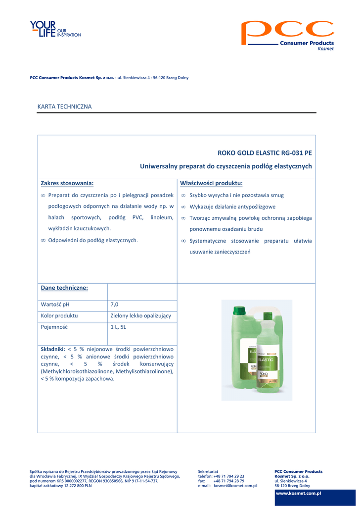 KARTA TECHNICZNA ROKO GOLD ELASTIC RG-031 PE Uniwersalny preparat do czyszczenia podłóg elastycznych Zakres stosowania: Właściwości produktu: • Preparat do czyszczenia po i pielęgnacji posadzek • Szybko wysycha i nie pozostawia smug podłogowych odpornych na działanie wody np. w • Wykazuje działanie antypoślizgowe halach • Tworząc zmywalną powłokę ochronną zapobiega sportowych, podłóg PVC, linoleum, wykładzin kauczukowych. • Odpowiedni do podłóg elastycznych. ponownemu osadzaniu brudu • Systematyczne stosowanie preparatu ułatwia usuwanie zanieczyszczeń Dane techniczne: Wartość pH 7,0 Kolor produktu Zielony lekko opalizujący Pojemność 1 L, 5L Składniki: < 5 % niejonowe środki powierzchniowo czynne, < 5 % anionowe środki powierzchniowo czynne, < 5 % środek konserwujący (Methylchloroisothiazolinone, Methylisothiazolinone), < 5 % kompozycja zapachowa. Zastosowanie i dozowanie Ostrzeżenia i postępowanie Postępowanie: Chronić przed dziećmi. W przypadku zanieczyszczenia oczu natychmiast przemyć dużą ilością Przeznaczony do posadzek podłogowych odpornych na działanie wody. wody. Szczegółowe informacje znajdują się w karcie charakterystyki preparatu ROKO GOLD ELASTIC RG031 PE. Mycie ręczne: stosowanie bieżące 40 - 100 ml/10 L wody Zalecenia Preparat do zastosowań profesjonalnych. Zawsze używać zimnej wody. Czyszczenie maszynowe: 40-100 ml/10 L * dozowanie w zależności od stopnia zabrudzenia Informacje zawarte w niniejszej karcie technicznej podane są w dobrej wierze, w oparciu o aktualną wiedzę, doświadczenie wyniki badań. Zgodność parametrów dostarczonego wyrobu z niniejszą karta techniczną oraz przydatność wyrobu do zamierzonego zastosowania powinny być sprawdzone przed jego użyciem. Zastrzega się prawo wprowadzenie zmian do niniejszej karty technicznej będących skutkiem postępu.