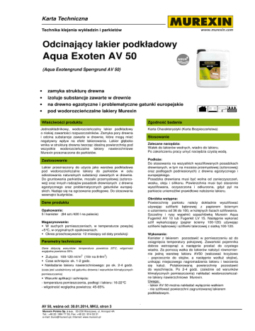 Karta Techniczna Technika klejenia wykładzin i parkietów KLT_AV50 Odcinający lakier podkładowy Aqua Exoten AV 50 (Aqua Exotengrund Sperrgrund AV 50) • zamyka strukturę drewna • izoluje substancje zawarte w drewnie • na drewno egzotyczne i problematyczne gatunki europejskie • pod wodorozcieńczalne lakiery Murexin Właściwości produktu Zgodność badania Jednoskładnikowy, wodorozcieńczalny lakier podkładowy o niskiej zawartości rozpuszczalników. Zamyka pory drewna i odcina substancje zawarte w drewnie, które mogą mieć negatywny wpływ na efekt lakierowania. Lakier głęboko wnika w strukturę drewna tworząc idealną powierzchnię pod wszystkie wodorozcieńczalne lakiery nawierzchniowe Murexin przeznaczone do parkietów. Karta Charakterystyki (Karta Bezpieczeństwa) Stosowanie Zalecane narzędzia: Wałek do lakierów wodnych, wiadro do lakieru. Po zakończeniu pracy umyć narzędzia czystą wodą. Podłoże: Do stosowania na wszystkich wyszlifowanych posadzkach drewnianych, w tym na mozaice przemysłowej (sztorcowej) oraz podłogach podniesionych) z drewna egzotycznego i europejskiego. Posadzka drewniana musi być wolna od zanieczyszczeń, wosku, oleju i silikonu. Powierzchnia musi być starannie wyszlifowana, oczyszczona i odkurzona, gdyż pył na parkiecie uniemożliwi prawidłowe nałożenie lakieru. Zastosowanie Lakier przeznaczony do użycia jako warstwa podkładowa pod wodorozcieńczalne lakiery do parkietów w celu odizolowania naturalnych substancji zawartych w drewnie. Do gruntowania parkietów, mozaiki przemysłowej (sztorcowej) oraz innych rodzajów posadzek drewnianych z drewna egzotycznego oraz problematycznych gatunków europejskich. Nadaje się na ogrzewanie podłogowe. Do stosowania wewnątrz budynków. Obróbka wstępna: Powierzchnię parkietu należy dokładnie wyszlifować używając szlifierki bębnowej z papierem ściernym o uziarnieniu od 36 do 100, w kolejnych fazach szlifowania. Szczeliny i rysy wypełnić szpachlówką Murexin Aqua Fugenkit AV 10 lub Fugenkit LV 15. Następnie wykonać szlif wykańczający (papier ścierny 100-120) używając szlifierki bębnowej i szlifierki talerzowej z siatką 100-120. Dane produktu Opakowanie: 5 l kanister (84 szt./420 l na palecie) Magazynowanie: W suchych pomieszczeniach, w temperaturze powyżej +5°C, w oryginalnych opakowaniach. Okres przechowywania: 12 miesięcy od daty produkcji Wykonanie: Kanister z lakierem pozostawić w pomieszczeniu aż do osiągnięcia temperatury pokojowej. Zawartość pojemnika dobrze wstrząsnąć a następnie przelać do czystego wiadra. Za pomocą wałka do lakierów nałożyć równomiernie jedną warstwę lakieru AV50 (walcować krzyżowo - poprzecznie do słojów, a następnie wzdłuż słojów), unikając miejscowego nagromadzenia lakieru i tworzenia się kałuż. Polakierowaną powierzchnię pozostawić do wyschnięcia. Po 2-4 godz. (zależnie od warunków klimatycznych pomieszczenia) nakładać wodorozcieńczalne lakiery nawierzchniowe Murexin. Uwaga: - lakier AV 50 można nakładać wyłącznie wałkiem - nie szlifować powierzchni zagruntowanej lakierem podkładowym. Parametry techniczne Dane dotyczą warunków: temperatura powietrza 20oC, wilgotność względna powietrza 55%. Zużycie: 100-120 ml/m2 (1litr na 8-9m2) Czas schnięcia: ok. 1-2 godz. Nakładanie lakieru nawierzchniowego: po ok. 2-4 godz. (czas jest uzależniony od gatunku drewna i warunków klimatycznych pomieszczenia) Warunki aplikacji i schnięcia: - temperatura pomieszczenia, podłogi i lakieru: 16-22°C - wilgotność względna powietrza: 45-65% AV 50, ważna od: 30.01.2014, MKU, stron 3 Murexin Polska Sp. z o.o. 03-236 Warszawa, ul. Annopol 4A Tel.: +48 22 / 884 77 55, Fax: +48 22 / 814 53 31 e-mail: [email protected], Internet: www.murexin.pl 1 Karta Techniczna Technika klejenia wykładzin i parkietów KLT_AV50 _______________________________ Dodatkowe informacje: Nie zaleca się wylewania lakieru bezpośrednio na posadzkę drewnianą (należy stosować wiadra do lakierów). W przypadku lakierowania nietypowych gatunków drewna, renowacji starych podłóg lub odnawiania warstw lakierniczych zaleca się przeprowadzenie prób na małej powierzchni parkietu. Optymalna temperatura stosowania: +16oC ÷ +22oC. W okresie letnim wyższa temperatura otoczenia znacznie przyspiesza wysychanie lakierów, co może utrudniać ich rozprowadzanie. Szczególnie należy unikać pracy podczas bezpośredniego nasłonecznienia lub zbytniego miejscowego nagrzania parkietu. W takich przypadkach prace najlepiej przeprowadzać wcześnie rano. Obróbka i lakierowanie parkietu o wilgotności niezgodnej z obowiązującymi normami oraz w nieprawidłowych warunkach klimatycznych panujących w pomieszczeniu, może prowadzić do wystąpienia szkód w posadzce drewnianej. Przy silnym spadku wilgotności powietrza istnieje podwyższone ryzyko tworzenia się szczelin w parkiecie. Zjawisko to jest naturalne dla drewna i nie powstaje pod wpływem działania lakieru. Aby zminimalizować ryzyko zbytniego wysuszenia posadzki drewnianej należy utrzymywać wilgotność powietrza na stałym poziomie, stosując odpowiednie urządzenia nawilżające powietrze. Lakierowanej posadzki drewnianej nie przykrywać folią malarską, nie oklejać taśmami malarskimi ani innymi nieprzepuszczającymi powietrza materiałami. Niniejsza karta techniczna bazuje na rozległym doświadczeniu, została stworzona z najlepszej woli, nie jest prawnie wiążąca i nie jest ofertą w rozumieniu prawa czy też gwarancją wynikającą z zamówienia lub umowy sprzedaży. Aby zminimalizować ryzyko popełnienia błędów wykonawczych w karcie zawarto określone, ograniczone informacje. Naturalnie nie mogą być tam dokładnie opisane wszystkie dotychczasowe i możliwe zastosowania produktu. Zrezygnowano z danych, które dla fachowców są oczywiste. W przypadku niejasności bądź wątpliwości lub ujawnienia jakichkolwiek dodatkowych czynników mogących mieć w