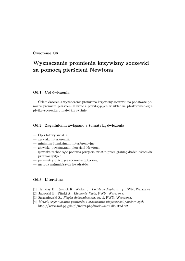 Ćwiczenie O6 Wyznaczanie promienia krzywizny soczewki za pomocą pierścieni Newtona O6.1. Cel ćwiczenia Celem ćwiczenia wyznaczenie promienia krzywizny soczewki na podstawie pomiaru promieni pierścieni Newtona powstających w układzie płaskorównoległa płytka–soczewka o małej krzywiźnie. O6.2. Zagadnienia związane z tematyką ćwiczenia — — — — — Opis falowy światła, zjawisko interferencji, minimum i maksimum interferencyjne, zjawisko powstawania pierścieni Newtona, zjawiska zachodzące podczas przejścia światła przez granicę dwóch ośrodków przezroczystych, — parametry opisujące soczewkę optyczną, — metoda najmniejszych kwadratów. O6.3. Literatura [1] [2] [3] [4] Halliday D., Resnick R., Walker J.: Podstawy fizyki, cz. 4, PWN, Warszawa. Jaworski B., Piński A.: Elementy fizyki, PWN, Warszawa. Szczeniowski S., Fizyka doświadczalna, cz. 4, PWN, Warszawa. Metody wykonywania pomiarów i szacowania niepewności pomiarowych, http://www.mif.pg.gda.pl/index.php?node=mat dla stud v2 226 Ćwiczenie O6 O6.4. Przebieg ćwiczenia i zadania do wykonania Układ doświadczalny Rysunek O6.1 przedstawia zdjęcie układu pomiarowego, który składa się z mikroskopu optycznego 1, źródeł światła o znanej długości fali 2, układu płytka płaskorównoległa–soczewka o dużym promieniu krzywizny 3. Rysunek O6.1. Zdjęcie układu pomiarowego Przebieg doświadczenia Po włączeniu źródła światła należy odczekać, aż do całkowitego rozżarzenia lampy. Następnie należy odpowiednio skierować wiązkę światła i oświetlić układ badanej soczewki i płytki płaskorównoległej. Przez okular zaobserwować pierścienie Newtona i ustawić układ optyczny tak, aby środek krzyża widocznego w okularze znajdował się na środku centralnego pierścienia. Aby znaleźć średnicę Dn n-tego pierścienia należy odczytać położenie pionowej linii krzyża na n-tym ciemnym pierścieniu z prawej i lewej strony. Różnica tych położeń jest równa średnicy Dn n-tego pierścienia. Wyznaczanie promienia krzywizny soczewki za pomocą pierścieni Newtona 227 Zadania do wykonania O6.1. Zmierzyć średnice kilku ciemnych pierścieni Newtona. O6.2. Wyznaczyć promień krzywizny soczewki stosując metodę regresji liniowej. O6.3. Wyznaczyć średni promień krzywizny soczewki na podstawie różnicy kwadratów średnic pierścieni. Uzupełnienie do zadań O6.2 i O6.3 Na podstawie rysunku O6.2 możemy napisać zależność: Rysunek O6.2. Powstawanie pierścieni Newtona rn2 = d (2R − d) , (O6.1) w której R jest promieniem krzywizny soczewki, r promieniem ciemnego pierścienia a d różnicą dróg optycznych promieni. Przyjmując d 2R wyrażenie (O6.1) możemy uprościć do postaci: rn2 = 2dR, (O6.2) z której otrzymujemy d= r2 . 2R (O6.3) 228 Ćwiczenie O6 Po uwzględnieniu warunku na powstanie minimum interferencyjnego dla światła o długości fali λ: λ d=n (O6.4) 2 oraz po podstawieniu Dn r= , (O6.5) 2 gdzie Dn jest średnicą n-tego ciemnego pierścienia, otrzymujemy zależność: Dn2 = 4Rλn, (O6.6) w której n = 1, 2, 3, . . . , k oznacza kolejne ciemne prążki interferencyjne. Wyznaczenie promienia krzywizny soczewki metodą regresji liniowej Podstawiając w równaniu (O6.6) Dn2 = y i 4nλ = x sprowadzamy je do funkcji liniowej. Współczynniki a i b prostej y = ax+b wyznaczamy korzystając z metody najmniejszych kwadratów. Łatwo jest zauważyć, że znając współczynnik a znamy promień krzywizny soczewki R, ponieważ a = R. Wyznaczenie średniego promienia krzywizny soczewki na podstawie różnicy kwadratów średnic pierścieni Newtona Analogicznie do wzoru (O6.6) dla prążka o numerze n + p, możemy napisać: 2 Dn+p = 4Rλ (n + p) . (O6.7) Odejmując stronami równania (O6.7) i (O6.6) otrzymujemy wyrażenie określające promień krzywizny soczewki R, wyrażony poprzez różnicę kwadratów średnic dwóch pierścieni Newtona: 2 Dn+p − Dn2 R= . (O6.8) 4λp W doświadczeniu należy zmierzyć średnicę 4-go, 8-go, 12-go i 16-go ciemnego pierścienia i obliczyć promień krzywizny soczewki kolejno przyjmując n = 4 i p = 4, 8, 12, a następnie obliczyć wartość średnią R. O6.5. Rachunek niepewności W zależności od wybranej metody wyznaczania promienia krzywizny soczewki, niepewność R szacujemy jako odchylenie standardowe od wartości średniej obliczonej na podstawie serii pomiarów (zadanie O6.3), albo wyznaczamy stosując odpowiednie wzory metody najmniejszych kwadratów (zadanie O6.2). Niepewność pomiaru Dn określamy na podstawie podziałki użytego przyrządu.