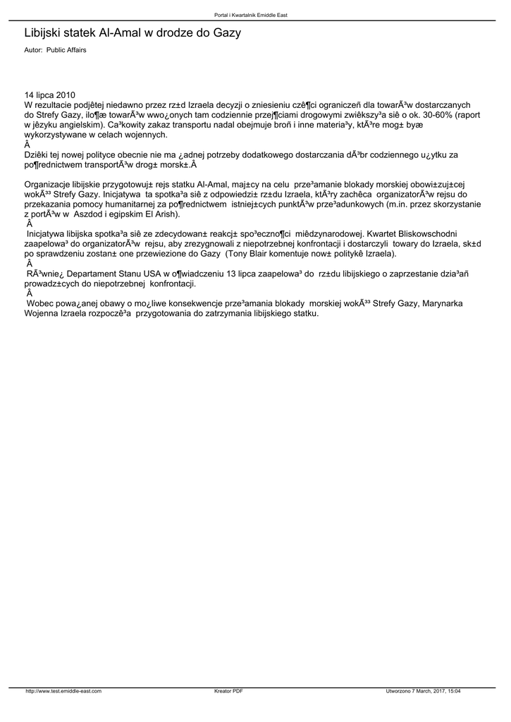 Portal i Kwartalnik Emiddle East Libijski statek Al-Amal w drodze do Gazy Autor: Public Affairs 14 lipca 2010 W rezultacie podjêtej niedawno przez rz±d Izraela decyzji o zniesieniu czê¶ci ograniczeñ dla towarów dostarczanych do Strefy Gazy, ilo¶æ towarów wwo¿onych tam codziennie przej¶ciami drogowymi zwiêkszy³a siê o ok. 30-60% (raport w jêzyku angielskim). Ca³kowity zakaz transportu nadal obejmuje broñ i inne materia³y, które mog± byæ wykorzystywane w celach wojennych.  Dziêki tej nowej polityce obecnie nie ma ¿adnej potrzeby dodatkowego dostarczania dóbr codziennego u¿ytku za po¶rednictwem transportów drog± morsk±. Organizacje libijskie przygotowuj± rejs statku Al-Amal, maj±cy na celu prze³amanie blokady morskiej obowi±zuj±cej wokó³ Strefy Gazy. Inicjatywa ta spotka³a siê z odpowiedzi± rz±du Izraela, który zachêca organizatorów rejsu do przekazania pomocy humanitarnej za po¶rednictwem istniej±cych punktów prze³adunkowych (m.in. przez skorzystanie z portów w Aszdod i egipskim El Arish).  Inicjatywa libijska spotka³a siê ze zdecydowan± reakcj± spo³eczno¶ci miêdzynarodowej. Kwartet Bliskowschodni zaapelowa³ do organizatorów rejsu, aby zrezygnowali z niepotrzebnej konfrontacji i dostarczyli towary do Izraela, sk±d po sprawdzeniu zostan± one przewiezione do Gazy (Tony Blair komentuje now± politykê Izraela).  Równie¿ Departament Stanu USA w o¶wiadczeniu 13 lipca zaapelowa³ do rz±du libijskiego o zaprzestanie dzia³añ prowadz±cych do niepotrzebnej konfrontacji.  Wobec powa¿anej obawy o mo¿liwe konsekwencje prze³amania blokady morskiej wokó³ Strefy Gazy, Marynarka Wojenna Izraela rozpoczê³a przygotowania do zatrzymania libijskiego statku. http://www.test.emiddle-east.com Kreator PDF Utworzono 7 March, 2017, 15:04
