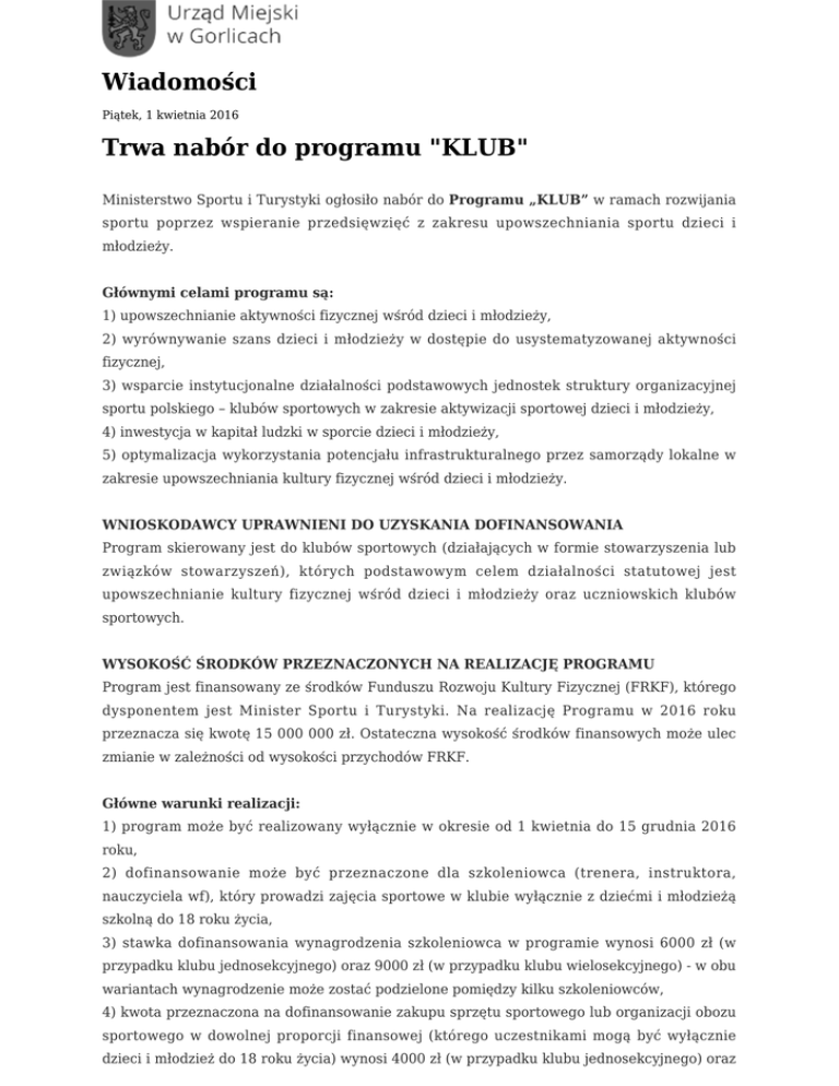 Wiadomości Piątek, 1 kwietnia 2016 Trwa nabór do programu "KLUB" Ministerstwo Sportu i Turystyki ogłosiło nabór do Programu „KLUB” w ramach rozwijania sportu poprzez wspieranie przedsięwzięć z zakresu upowszechniania sportu dzieci i młodzieży. Głównymi celami programu są: 1) upowszechnianie aktywności fizycznej wśród dzieci i młodzieży, 2) wyrównywanie szans dzieci i młodzieży w dostępie do usystematyzowanej aktywności fizycznej, 3) wsparcie instytucjonalne działalności podstawowych jednostek struktury organizacyjnej sportu polskiego – klubów sportowych w zakresie aktywizacji sportowej dzieci i młodzieży, 4) inwestycja w kapitał ludzki w sporcie dzieci i młodzieży, 5) optymalizacja wykorzystania potencjału infrastrukturalnego przez samorządy lokalne w zakresie upowszechniania kultury fizycznej wśród dzieci i młodzieży. WNIOSKODAWCY UPRAWNIENI DO UZYSKANIA DOFINANSOWANIA Program skierowany jest do klubów sportowych (działających w formie stowarzyszenia lub związków stowarzyszeń), których podstawowym celem działalności statutowej jest upowszechnianie kultury fizycznej wśród dzieci i młodzieży oraz uczniowskich klubów sportowych. WYSOKOŚĆ ŚRODKÓW PRZEZNACZONYCH NA REALIZACJĘ PROGRAMU Program jest finansowany ze środków Funduszu Rozwoju Kultury Fizycznej (FRKF), którego dysponentem jest Minister Sportu i Turystyki. Na realizację Programu w 2016 roku przeznacza się kwotę 15 000 000 zł. Ostateczna wysokość środków finansowych może ulec zmianie w zależności od wysokości przychodów FRKF. Główne warunki realizacji: 1) program może być realizowany wyłącznie w okresie od 1 kwietnia do 15 grudnia 2016 roku, 2) dofinansowanie może być przeznaczone dla szkoleniowca (trenera, instruktora, nauczyciela wf), który prowadzi zajęcia sportowe w klubie wyłącznie z dziećmi i młodzieżą szkolną do 18 roku życia, 3) stawka dofinansowania wynagrodzenia szkoleniowca w programie wynosi 6000 zł (w przypadku klubu jednosekcyjnego) oraz 9000 zł (w przypadku klubu wielosekcyjnego) - w obu wariantach wynagrodzenie może zostać podzielone pomiędzy kilku szkoleniowców, 4) kwota przeznaczona na dofinansowanie zakupu sprzętu sportowego lub organizacji obozu sportowego w dowolnej proporcji finansowej (którego uczestnikami mogą być wyłącznie dzieci i młodzież do 18 roku życia) wynosi 4000 zł (w przypadku klubu jednosekcyjnego) oraz 6000 zł (w przypadku klubu wielosekcyjnego), 5) łączna kwota wnioskowanej dotacji w ramach Programu KLUB nie może przekroczyć 10 000 zł – w przypadku klubu jednosekcyjnego oraz 15 000 zł w przypadku klubu posiadającego więcej niż jedną sekcję, 6) kwota dotacji ze środków publicznych udzielanych wnioskodawcy w roku poprzedzającym złożenie wniosku w naborze nie może przekroczyć kwoty 300 tys. zł (brutto) - do wniosku należy dołączyć stosowny bilans finansowy za ostatni rok obrachunkowy oraz sprawozdanie merytoryczne z działalności wnioskodawcy za rok poprzedzający złożenie wniosku, 7) wymagane jest, aby wnioskodawca (klub) prowadził formalnie zarejestrowaną działalność sportową co najmniej 3 lata (rejestracja w KRS bądź w ewidencji prowadzonej przez starostę właściwego ze względu na siedzibę klubu), 8) wymagane jest przedstawienie informacji o ilości sekcji sportowych funkcjonujących w klubie, 9) wymagane jest przedstawienie informacji o liczbie dzieci i młodzieży w klubie do 18 roku życia w podziale na: b) posiadających licencje zawodnicze polskich związków sportowych, c) nie posiadających licencji, d) będących członkami kadry narodowej, 10) wymagane jest przedstawienie informacji o udziale wnioskodawcy w systemie współzawodnictwa sportowego młodzieży uzdolnionej zawierającej w szczególności liczbą punktów uzyskanych w systemie współzawodnictwa sportowego dzieci i młodzieży w roku poprzedzającym złożenie wniosku, 11) w przypadku zaplanowania zakupu sprzętu sportowego, wnioskodawca zobowiązany jest do przedstawienia w załączniku nr 2a do wniosku specyfikacji kompletu sprzętu sportowego, niezbędnego do prowadzenia szkolenia sportowego. TERMIN I MIEJSCE SKŁADANIA WNIOSKÓW 1. Wnioski o dofinansowanie na realizację zadania należy nadsyłać do dnia 15 kwietnia 2016 r. 2. Wniosek wraz z załącznikami musi być sporządzony na formularzach zamieszczonych w systemie elektronicznym AMODIT MSiT. Wypełniony formularz należy przesłać drogą elektroniczną. Jednocześnie po wypełnieniu elektronicznego formularza wniosku wraz z załącznikami należy go wydrukować, podpisać i wysłać pocztą (lub złożyć w siedzibie MSiT) na adres: Ministerstwo Sportu i Turystyki, Departament Sportu dla Wszystkich, 00-082 Warszawa, ul. Senatorska 14 z dopiskiem na kopercie Program „KLUB” – nabór na 2016 r. Wnioski wraz z załącznikami przesłane wyłącznie w wersji papierowej nie będą rozpatrywane, analogicznie, w przypadku przesłania wniosku wyłącznie w wersji elektronicznej. Dokumentacja przesłana w wersji papierowej musi być zgodna z wersją elektroniczną przesłaną w systemie AMODIT. 3. Datą złożenia wniosku o dofinansowanie jest data dostarczenia do siedziby MSiT lub data stempla pocztowego. 4. Wnioski muszą być podpisane przez osoby uprawnione/upoważnione (należy załączyć stosowne upoważnienie) do działania w imieniu wnioskodawcy. 5. W przypadku składania kopii zaświadczeń, wypisów lub innych dokumentów należy opatrzyć je poświadczeniem „za zgodność z oryginałem”. Kopie pozbawione klauzuli „za zgodność z oryginałem” nie będą uwzględniane. 6. Wniosek wraz z załącznikami należy złożyć w jednym egzemplarzu. 7. Wszystkie rubryki formularza wniosku oraz stosownych załączników powinny być wypełnione w sposób wyczerpujący. Więcej informacji TUTAJ