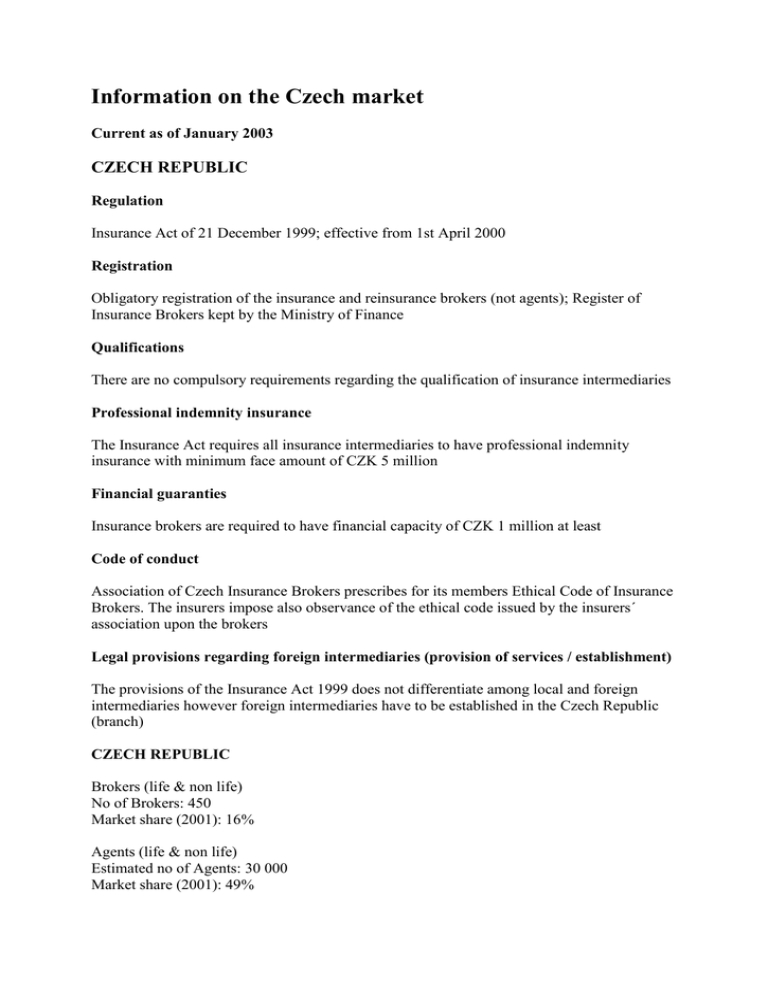 Information on the Czech market Current as of January 2003 CZECH REPUBLIC Regulation Insurance Act of 21 December 1999; effective from 1st April 2000 Registration Obligatory registration of the insurance and reinsurance brokers (not agents); Register of Insurance Brokers kept by the Ministry of Finance Qualifications There are no compulsory requirements regarding the qualification of insurance intermediaries Professional indemnity insurance The Insurance Act requires all insurance intermediaries to have professional indemnity insurance with minimum face amount of CZK 5 million Financial guaranties Insurance brokers are required to have financial capacity of CZK 1 million at least Code of conduct Association of Czech Insurance Brokers prescribes for its members Ethical Code of Insurance Brokers. The insurers impose also observance of the ethical code issued by the insurers´ association upon the brokers Legal provisions regarding foreign intermediaries (provision of services / establishment) The provisions of the Insurance Act 1999 does not differentiate among local and foreign intermediaries however foreign intermediaries have to be established in the Czech Republic (branch) CZECH REPUBLIC Brokers (life & non life) No of Brokers: 450 Market share (2001): 16% Agents (life & non life) Estimated no of Agents: 30 000 Market share (2001): 49% *** Czech Republic Czeska Republika Aktualizacja - grudzień 2003 Regulacje prawne Ustawa Ubezpieczeniowa z 21 grudnia 1999, wchodząca w życie od 1 kwietnia 2000; Rejestracja Obowiązkowa rejestracja brokerów ubezpieczeniowych i reasekuracyjnych (nie dotyczy agentów). Rejestr brokerów prowadzi Ministerstwo Finansów. Kwalifikacje Nie ma obowiązkowych wymogów dotyczących kwalifikacji pośredników ubezpieczeniowych. Profesjonalne ubezpieczenie OC Ustawa ubezpieczeniowa wymaga od wszystkich pośredników ubezpieczeniowych posiadania ubezpieczenia OC zawodowego, minimum 5 milionów czeskich koron. Gwarancje finansowe Od brokerów ubezpieczeniowych wymaga się posiadania finansowego zabezpieczenia w wysokości co najmniej 1 miliona koron. Kodeks postępowania Stowarzyszenie Czeskich Brokerów Ubezpieczeniowych zaleca swoim członkom Kodeks Etyki Brokerów Ubezpieczeniowych. Również ubezpieczyciele narzucają stosowanie kodeksu etyki, wydanego dla brokerów przez stowarzyszenie ubezpieczycieli. Prawne warunki pośredników z poza Unii Ustawa ubezpieczeniowa z 1999 roku nie rozróżnia między lokalnymi i zagranicznymi pośrednikami, niemniej jednak zagraniczni pośrednicy muszą zakładać oddziały w Czechach. Liczba brokerów (życiowi i majątkowi) - 500 udział w rynku - 18% Liczba agentów (życiowi i majątkowi) - około 30 000 udział w rynku - 49%