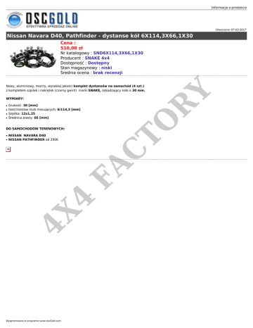Informacje o produkcie Utworzono 07-03-2017 Nissan Navara D40, Pathfinder - dystanse kół 6X114,3X66,1X30 Cena : 510,00 zł Nowy, aluminiowy, mocny, wysokiej jakości komplet dystansów na samochód (4 szt.) z kompletem szpilek i nakrętek (czarny gwint) marki SNAKE, odsadzający koło o 30 mm. ● ● ● Grubość: 30 [mm] Ilość/rozstaw śrub mocujących: 6/114,3 [mm] Szpilka: 12x1,25 Średnica piasty: 66 [mm] DO SAMOCHODÓW TERENOWYCH: ● NISSAN NAVARA D40 NISSAN PATHFINDER od 2006 4X 4 FA C ● TO ● R WYMIARY: Wygenerowano w programie www.oscGold.com Y Nr katalogowy : SND6X114,3X66,1X30 Producent : SNAKE 4x4 Dostępność : Dostępny Stan magazynowy : niski Średnia ocena : brak recenzji