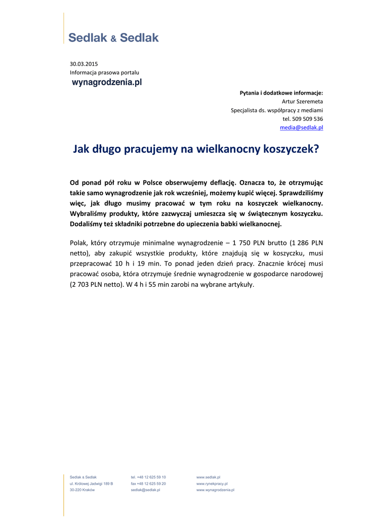 30.03.2015 Informacja prasowa portalu Pytania i dodatkowe informacje: Artur Szeremeta Specjalista ds. współpracy z mediami tel. 509 509 536 [email protected] Jak długo pracujemy na wielkanocny koszyczek? Od ponad pół roku w Polsce obserwujemy deflację. Oznacza to, że otrzymując takie samo wynagrodzenie jak rok wcześniej, możemy kupić więcej. Sprawdziliśmy więc, jak długo musimy pracować w tym roku na koszyczek wielkanocny. Wybraliśmy produkty, które zazwyczaj umieszcza się w świątecznym koszyczku. Dodaliśmy też składniki potrzebne do upieczenia babki wielkanocnej. Polak, który otrzymuje minimalne wynagrodzenie – 1 750 PLN brutto (1 286 PLN netto), aby zakupić wszystkie produkty, które znajdują się w koszyczku, musi przepracować 10 h i 19 min. To ponad jeden dzień pracy. Znacznie krócej musi pracować osoba, która otrzymuje średnie wynagrodzenie w gospodarce narodowej (2 703 PLN netto). W 4 h i 55 min zarobi na wybrane artykuły. Sedlak & Sedlak tel. +48 12 625 59 10 www.sedlak.pl ul. Królowej Jadwigi 189 B fax +48 12 625 59 20 www.rynekpracy.pl 30-220 Kraków [email protected] www.wynagrodzenia.pl Tabela 1. Jak długo musi pracować na koszyczek osoba, która otrzymuje minimalne lub średnie wynagrodzenie* produkt w koszyczku szynka wieprzowa gotowana - za 1kg Jak długo musi pracować na Jak długo musi koszyczek pracować na osoba średnia cena koszyczek osoba otrzymująca w PLN otrzymująca średnie minimalne wynagrodzenie wynagrodzenie w gospodarce narodowej w 2014 roku 24,34 ser twarogowy półtłusty - za 1kg 13,39 cytryny - za 1 kg 5,74 jaja kurze świeże - za 10 szt. 5,20 masło świeże o zawartości tłuszczu ok. 82,5% - za 200 g 4,35 czekolada mleczna - za 100g 3,61 mąka pszenna - za 1kg 2,45 cukier biały kryształ - za 1kg 2,04 czekolada mleczna - za 100g 3,61 wartość koszyka 78,91 Źródło: Opracowanie własne Sedlak & Sedlak na podstawie GUS *ceny produktów ze stycznia 2015 roku na podstawie GUS Sedlak & Sedlak tel. +48 12 625 59 10 www.sedlak.pl ul. Królowej Jadwigi 189 B fax +48 12 625 59 20 www.rynekpracy.pl 30-220 Kraków [email protected] www.wynagrodzenia.pl 4 h 55 min 15,58 10 h 19 min kiełbasa wędzona - za 1kg W wielkanocnym koszyczku nie mogło zabraknąć jajka. Przeciętna cena 10 sztuk to 5,20 PLN. Osoba otrzymująca minimalne wynagrodzenie musi przepracować 41 minut aby kupić jajka. Otrzymujący przeciętne wynagrodzenie na ten sam zakup pracują zaledwie 20 minut. Najdroższa w zestawieniu jest szynka wieprzowa, której kilogram kosztuje 24,34 PLN. Pracownik, który zarabia minimum krajowe, musi przepracować ponad 3 godziny, aby pozwolić sobie na zakup szynki. Wykres 1. Jak długo musi pracować na poszczególne produkty w koszyczku osoba, która otrzymuje minimalne lub średnie wynagrodzenie Źródło: Opracowanie własne Sedlak & Sedlak na podstawie GUS W niewiele ponad 3 h na koszyk wielkanocny zarobi programista .NET. Wynika to z jego ponadprzeciętnych zarobków – 4 247 PLN netto miesięcznie. Ponad Sedlak & Sedlak tel. +48 12 625 59 10 www.sedlak.pl ul. Królowej Jadwigi 189 B fax +48 12 625 59 20 www.rynekpracy.pl 30-220 Kraków [email protected] www.wynagrodzenia.pl dwukrotnie dłużej na te same dobra musi pracować tokarz, którego przeciętne wynagrodzenie wynosi 1 948 PLN netto. Najniższe wynagrodzenie w zestawieniu otrzymuje telemarketer, około 2 000 PLN brutto (1 460 PLN netto). Pracujący w tym zawodzie muszą przepracować 9 h 5 min, żeby zarobić na artykuły wielkanocne. Wykres 2. Jak długo muszą pracować na poszczególne produkty w koszyczku osoby zatrudnione na poszczególnych stanowiskach 9 h 5 min 10,00 8 h 15 min 9,00 8,00 6 h 49 min 6 h 9 min 7,00 5 h 18 min 6,00 5,00 3 h 8 min 4,00 3,00 2,00 1,00 0,00 telemarketer listonosz tokarz ślusarz redaktor programista .NET czas jaki muszą przepracować aby zarobić na koszyk świąteczny Źródło: Opracowanie własne Sedlak & Sedlak na podstawie GUS i Ogólnopolskiego Badania Wynagrodzeń (OBW) przeprowadzonego w 2014 roku Ewelina Jurczak wynagrodzenia.pl Ile powinieneś zarabiać? Weź udział w Ogólnopolskim Badaniu Wynagrodzeń i porównaj swoje zarobki z innymi. Sedlak & Sedlak wyraża zgodę na publikację niniejszego opracowania pod warunkiem powołania się na źródło: wynagrodzenia.pl oraz zamieszczenie pod artykułem aktywnego Sedlak & Sedlak tel. +48 12 625 59 10 www.sedlak.pl ul. Królowej Jadwigi 189 B fax +48 12 625 59 20 www.rynekpracy.pl 30-220 Kraków [email protected] www.wynagrodzenia.pl linku do strony Ogólnopolskiego Badania Wynagrodzeń 2014 (http://wynagrodzenia.pl/obw.php) czcionką nie mniejszą niż czcionka użyta w publikacji. Sedlak & Sedlak tel. +48 12 625 59 10 www.sedlak.pl ul. Królowej Jadwigi 189 B fax +48 12 625 59 20 www.rynekpracy.pl 30-220 Kraków [email protected] www.wynagrodzenia.pl
