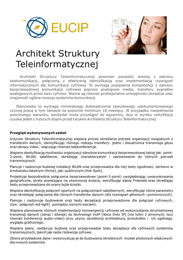 Architekt Struktury Teleinformatycznej Architekt Struktury Teleinformatycznej powinien posiadaæ wiedzê z zakresu telekomunikacji, po³¹czon¹ z efektywn¹ identyfikacj¹ oraz implementacj¹ rozwi¹zañ informatycznych dla komunikacji cyfrowej. To wymaga posiadania kompetencji z zakresu bezprzewodowej komunikacji cyfrowej poprzez analogowe media, transferu sygna³ów analogowych przez sieci cyfrowe. Wa¿ne s¹ równie¿ profesjonalne umiejêtnoœci doradcze oraz znajomoœæ ogólna rozwoju systemów komunikacji. Stanowisko to wymaga minimalnego doœwiadczenia zawodowego udokumentowanego czynn¹ prac¹ w tym temacie na poziomie minimum 18 miesiêcy. W przypadku niespe³nienia powy¿szego warunku, kandydat mo¿e przyst¹piæ do egzaminu, lecz w wyniku certyfikacji uzyska jeden z ni¿szych stopni przed tytu³em Architekta Struktury Teleinformatycznej Przegl¹d wykonywanych zadañ In¿ynier Struktury Teleinformatycznej wspiera proces okreœlania potrzeb organizacji zwi¹zanych z transferem danych, identyfikuj¹c ró¿nego rodzaju transfery: jedno i dwustronna transmisja g³osu oraz obrazu video, w³¹czaj¹c równie¿ telekonferencje. Wspiera identyfikacjê mo¿liwoœci organizacji odnoœnie komunikacji bezprzewodowej takiej jak: point2-point, WLAN, satelitarne, okreœlaj¹c charakterystyki i zastosowanie do ró¿nych potrzeb transmisyjnych. Planuje i nadzoruje budowê instalacji WLAN oraz przeprowadza dla niej testy zgodnoœci, zarówno w œrodowisku lokalnym (firma), jak i publicznym (Hot-Spot). Projektuje bezpoœrednie po³¹czenia bezprzewodowe (point-2-point) uwzglêdniaj¹c uwarunkowania geograficzne, straty powstaj¹ce na utworzonej œcie¿ce, weryfikuj¹c elpisy Fresnela oraz okreœlaj¹c testy przeprowadzane do oceny tej¿e œcie¿ki. Wspiera identyfikacjê po³¹czeñ opartych na po³¹czeniach satelitarnych, weryfikuj¹c ró¿ne parametry oraz okreœlaj¹c po³¹czenia dla ró¿nych transferów danych (dla rozwi¹zañ g³ównych i pomocniczych). Planuje i nadzoruje budowanie oraz testy akceptacji przeprowadzone dla po³¹czeñ cyfrowych, (tzw. po³¹czeñ red-light) pomiêdzy ro¿nymi sieciami. Wspiera planowanie ró¿nych implementacji konwergencji cyfrowej od wykorzystania strumieniowej transmisji danych (obraz i dŸwiêk) do technologii VoIP [Voice Over IP] (nie tylko 2 stronnych, lecz równie¿ konferencji audio-video) przy u¿yciu okreœlonej architektury, protoko³ów i ich ogólnego wygl¹du graficznego. Wspiera plany, nadzoruje budowê oraz przeprowadza testy akceptacji dla cyfrowych systemów transmisyjnych, takich jak radia i telewizje cyfrowe. Zbiera przyk³adowe dane i wykorzystuje je do budowania okreœlonych modeli pilotowych w³aœciwych dla nowych systemów. Uprawdopodabnia ogólny model poprzez przeprowadzanie wiele sesji symulacyjnych, w których kierownictwo, w³aœciciele procesów oraz u¿ytkownicy operacyjni systemu informacyjnego w pe³ni rozumiej¹ i akceptuj¹ sposób w jaki docelowy system ma dzia³aæ. Tworzy wysokiej jakoœci dokumenty oraz pisemne raporty okreœlaj¹ce tematy organizacyjne i/lub techniczne w sposób przejrzysty i zrozumia³y. Wspó³pracuje z pionem informatycznym w celu przeprowadzenia testów (pojedynczych modu³ów, jak równie¿ ca³ego systemu) oraz w celu ekstrakcji danych, transformacji oraz ³adowania. Przeprowadza koñcowe symulacje na prawdziwych danych oraz dokonuje na nich testów zgodnoœci. Planuje oraz wspiera szkolenie dla u¿ytkowników koñcowych danych systemów czy aplikacji. W zgodnoœci z ustalonymi zasadami, wspiera organizacjê Klienta w pierwszych próbach u¿ytkowania nowego systemu oraz przy mierzeniu korzyœci p³yn¹cych z ich zastosowania poprzez przeprowadzanie kontroli poimplemetnacyjnej wdro¿onego systemu. Kluczowe umiejêtnoœci behawioralne Rola In¿yniera Struktury Teleinformatycznej wymaga posiadania dobrej ogólnej wiedzy z zakresu IT, bardzo dobrej umiejêtnoœci porozumiewania siê (zarówno w mowie jak i piœmie) oraz bardzo szeroki zakres bardziej szczegó³owych umiejêtnoœci behawioralnych. Zainteresowanie w innowacjach technologicznych, umiejêtnoœæ zbierania i rozumienia nowych informacji, oraz wra¿liwoœæ organizacyjna i handlowa s¹ wymagane do prawid³owego projektowania, rozlokowywania oraz utrzymywania struktur informatycznych. Zdolnoœci analityczne oraz porównawcze, wyobraŸnia oraz aktywnoœæ s¹ równie¿ wymagane do formu³owania oraz zatwierdzania rozwi¹zañ. Umiejêtnoœæ zwracania uwagi na szczegó³y, logiczne myœlenie, zorientowanie na osi¹ganie wyznaczonych celów, umiejêtnoœæ szybkiego przystosowania siê do panuj¹cych warunków, determinacja, zdolnoœæ planowania oraz kontroli, budowanie grupy i jej przewodzenie s¹ wymagane do osi¹gania wymiernych wyników. Polskie Towarzystwo Informatyczne Zarz¹d G³ówny Al. Solidarnoœci 82A m.5, 01-003 Warszawa tel: +48 22 636 89 87 fax: +48 22 838 47 05 www.eucip.pl [email protected]