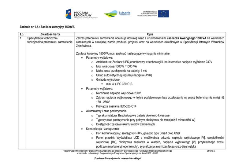 Zadanie nr 1.5.: Zasilacz awaryjny 1500VA Lp. Zwartość karty 1 Specyfikacja techniczna / funkcjonalna przedmiotu zamówienia Opis Zakres przedmiotu zamówienia obejmuje dostawę wraz z uruchomieniem Zasilacza Awaryjnego 1500VA na warunkach określonych w niniejszej Karcie produktu projektu oraz na warunkach określonych w Specyfikacji Istotnych Warunków Zamówienia. Zasilacz Awaryjny 1500VA musi spełniać następujące wymagania minimalne: Parametry wyjściowe: o Architektura: Zasilacz UPS jednofazowy w technologii Line-interactive napięcie wyjściowe 230V o Moc wyjściowa 1000W / 1500 VA o Maks. czas przełączenia na baterię: 4 ms o Układ automatycznej regulacji napięcia (AVR) o Gniazda wyjściowe: min. 4 x IEC 320 C13 Parametry wejściowe: o Nominalne napięcie wejściowe 230V o Zakres napięcia wejściowego w trybie podstawowym bez przełączania na pracę bateryjną nie mniej niż 160 - 286V o Przyłącze zasilania IEC-320-C14 Akumulatory i czas podtrzymania: o Typ akumulatora: Bezobsługowe baterie ołowiowo-kwasowe o Typowy czas podtrzymania przy pełnym obciążeniu nie mniej niż 6 minut (980 W) o Dostępność zestawu akumulatorów zamiennych Komunikacja i zarządzanie: o Port komunikacyjny: szeregowy RJ45, gniazdo typu Smart Slot, USB o Panel przedni: Wyświetlacz LCD z możliwością odczytu napięcia wejściowego [V], częstotliwości wejściowej [Hz], obciążenia zasilacza w Watach, napięcia wyjściowego [V], przybliżonego czasu podtrzymania bateryjnego [minuty], sygnalizacja awarii zasilacza oraz diagnostyka Projekt współfinansowany przez Unię Europejską ze środków Europejskiego Funduszu Rozwoju Regionalnego w ramach Lubuskiego Regionalnego Programu Operacyjnego na lata 2007 – 2013 „Fundusze Europejskie dla rozwoju Lubuskiego” Strona: 1 o Alarm dźwiękowy: Alarm podczas pracy na baterii, znaczny stan wyczerpania baterii Inne: o Typ obudowy: Rack 19” Certyfikaty i zgodność z normami: o Potwierdzenia zgodności Znak CE , EN 50091-1,EN 50091-2 Niezawodność / jakość wytwarzania o do oferty należy załączyć dokumenty potwierdzające, że oferowany sprzęt jest produkowany zgodnie z normami ISO 9001 oraz ISO 14001 2 3 Ilość Prace wdrożeniowe 4 sztuki Do czynności Wykonawcy w ramach uruchomienia Zasilacza Awaryjnego 1500VA należy: Ustalenie z Zamawiającym terminu przeprowadzenia prac Rozpakowanie wyposażenia, sprawdzenie, czy nie wystąpiły uszkodzenia Oznakowanie sprzętu naklejką Sprawdzenie warunków wymaganych do pracy urządzenia (temperatura, zasilanie, dostępne miejsce) Zebranie opakowań, dokumentacji itp. na zakończenie wykonania usługi i oddanie ich do dyspozycji Zamawiającego Sprawdzenie stanu zabezpieczeń wewnętrznych zasilacza Fizyczne podłączenie urządzenia do sieci energetycznej Sprawdzenie i ewentualna regulacja parametrów zasilacza za pomocą Oprogramowania serwisowego Kalibracja parametrów wewnętrznych zasilaczy UPS ze szczególnym naciskiem na poziom napięcia i prądu ładowania akumulatorów oraz wartości napięcia wyjściowego Sporządzenie raportu z przeprowadzonych prac 4 Specyficzne warunki dostaw / prac wdrożeniowych Miejsca dostawy i uruchomienia: Siedziba Zamawiającego: 69-200 Sulęcin, ul. Lipowa 18 Dostarczane urządzenia muszą być fabrycznie nowe (nie wyprodukowane wcześniej niż 6 miesięcy przed datą dostawy) i pochodzić z oficjalnego kanału dystrybucyjnego producenta. Wykonawca zobowiązany jest dołączyć do oferty Projekt współfinansowany przez Unię Europejską ze środków Europejskiego Funduszu Rozwoju Regionalnego w ramach Lubuskiego Regionalnego Programu Operacyjnego na lata 2007 – 2013 „Fundusze Europejskie dla rozwoju Lubuskiego” Strona: 2 oświadczenie, że oferowany do przetargu sprzęt spełnia ten wymóg. Zamawiający zastrzega, by dostarczane urządzenia nie były używane przed ich dostawą i odbiorem. Zamawiający dopuszcza, by urządzenia były rozpakowane i uruchomione przed ich dostarczeniem wyłącznie przez Wykonawcę i wyłącznie w celu weryfikacji działania urządzenia, przy czym jest zobowiązany do poinformowania Zamawiającego o zamiarze rozpakowania sprzętu, a Zamawiający ma prawo inspekcji sprzętu przed jego rozpakowaniem). Wraz ze sprzętem Wykonawca zobowiązany jest dostarczyć oświadczenie producenta potwierdzające datę produkcji urządzeń. 5 Warunki serwisu gwarancyjnego Gwarancja: 36 miesięcy gwarancji producenta urządzenia opartej o świadczenia gwarancyjne producenta realizowanej w miejscu instalacji lub wymiana urządzenia na w pełni sprawne najpóźniej w ciągu 5 dni roboczych od momentu zgłoszenia Serwis urządzeń musi być realizowany przez producenta lub autoryzowanego partnera serwisowego producenta – wymagane oświadczenie Wykonawcy potwierdzające, że serwis będzie realizowany przez Producenta lub autoryzowanego partnera serwisowego producenta (należy dołączyć do oferty). Serwis urządzeń musi być realizowany zgodnie z wymaganiami normy ISO 9001 – do oferty należy dołączyć dokument potwierdzający, że serwis urządzeń będzie realizowany zgodnie z tą normą. 6 Etapy realizacji dostaw oraz prac wdrożeniowych podlegające formalnym odbiorom 1. Dostawa: Formalnemu odbiorowi podlega dostawa do Zamawiającego w ilościach określonych w punkcie 4 niniejszej karty produktu zgodnie z procedurą określoną w Załączniku nr 2 do SIWZ, Podpisany przez Zamawiającego Protokół Odbioru Produktu stanowi podstawę płatności za dostawę dla zadania. Procedurę odbioru dostaw w ramach zadania określa Załącznik nr 2 do SIWZ. 2. Uruchomienie: Formalnemu odbiorowi podlega uruchomienie przedmiotu dostawy zgodnie z procedurą określoną w Załączniku nr 2 do SIWZ, Podpisany przez Zamawiającego Protokół Odbioru uruchomienia potwierdzający zrealizowanie wszystkich prac wdrożeniowych stanowi podstawę płatności. 7 Wymagania odnośnie treści oferty Na potwierdzenie, że oferowany Zasilacz Awaryjny 1500V