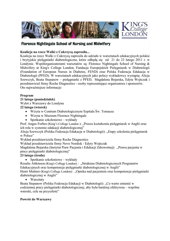 Koalicja na rzecz Walki z Cukrzycą zaprosiła... Koalicja na rzecz Walki z Cukrzycą zaprosiła do udziału w warsztatach edukacyjnych polskie i brytyjskie pielęgniarki diabetologiczne, które odbędą się od 21 do 23 lutego 2011 r. w Londynie. Współorganizatorami warsztatów są: Florence Nightingale School of Nursing & Midwifery at King's College London, Fundacja Europejskich Pielęgniarek w Diabetologii (Foundation of European Nurses in Diabetes, FEND) oraz Polska Federacja Edukacja w Diabetologii (PFED). W warsztatach edukacyjnych jako polscy wykładowcy wystąpią: Alicja Szewczyk, Beata Stepanow – pielęgniarki z PFED, Magdalena Bojarska, Edyta Wojtczak i przedstawiciel firmy Roche Diagnostics - osoby reprezentujące organizatora i sponsorów. Oto najważniejsze informacje: Program 21 lutego (poniedziałek) Wylot z Warszawy do Londynu 22 lutego (wtorek) • Wizyta w Centrum Diabetologicznym Szpitala Św. Tomasza • Wizyta w Muzeum Florence Nightingale • Spotkanie szkoleniowe – wykłady Prof. Angus Forbes (King’s College London ): „Proces kształcenia pielęgniarek w Anglii oraz ich rola w systemie edukacji diabetologicznej” Alicja Szewczyk (Polska Federacja Edukacja w Diabetologii): „Etapy szkolenia pielęgniarek w Polsce” Wykład przedstawiciela firmy Roche Diagnostics Wykład przedstawiciela firmy Novo Nordisk - Edyty Wojtczak Magdalena Bojarska (Instytut Praw Pacjenta i Edukacji Zdrowotnej): „Prawa pacjenta w pracy pielęgniarki diabetologicznej” 23 lutego (środa) • Spotkanie szkoleniowe – wykłady Rosalie Attkinson (King's College London) : „Struktura Diabetologicznych Programów Edukacyjnych oraz kompetencje pielęgniarki diabetologicznej w Anglii” Henri Mulnier (King's College London): „Opieka nad pacjentem oraz kompetencje pielęgniarki diabetologicznej w Anglii” • Warsztaty Beata Stepanow (Polska Federacja Edukacji w Diabetologii): „Co warto zmienić w codziennej pracy pielęgniarki diabetologicznej, aby była bardziej efektywna – wspólne wnioski, cele na przyszłość” Powrót do Warszawy Wykładowcy Prof. Angus Forbes – wykładowca z Florence Nightingale School of Nursing & Midwifery at King's College London; przewodniczący Clinical Diabetes Nursing Fundacji Europejskich Pielęgniarek w Diabetologii (Foundation of European Nurses in Diabetes, FEND), odpowiedzialny za współpracę pomiędzy FEND i Diabetes Centre at King’s College Hospital. Rosarie Attkinson – starsza specjalistka w dziedzinie pielęgniarstwa diabetologicznego, sprawuje opiekę diabetologiczną w Lambeth w południowym Londynie. Wykładowca na King's College w Londynie, gdzie prowadzi programy edukacyjne oraz zajęcia szkoleniowe dla pracowników podstawowej opieki zdrowotnej. Kieruje wdrożeniem programów edukacyjnych dla pacjentów z cukrzycą typu 2. Henri Mulnier – pielęgniarka specjalistka diabetologiczna, wykładowca pielęgniarstwa diabetologicznego w King’s College w Londynie. Zajmuje się w szczególności cukrzycą pierwotną i cukrzycą jako problemem społecznym. Prowadzi badania na temat współistnienia chorób układu sercowo-naczyniowego i cukrzycy. Magdalena Bojarska – wiceprezes Instytutu Praw Pacjenta i Edukacji Zdrowotnej, członek Rady Programowej Koalicji na rzecz Walki z Cukrzycą. Od lat czynnie zaangażowana w działalność organizacji pozarządowych (jest m.in. prezesem Fundacji Pomocy Młodzieży i Dzieciom Niepełnosprawnym „Hej, Koniku” i wiceprezesem Koalicji na rzecz Osób z Niepełnosprawnością). Alicja Szewczyk – pielęgniarka koordynująca w Klinice Endokrynologii i Diabetologii Instytutu Pomnik – Centrum Zdrowia Dziecka w Warszawie. Przewodnicząca Polskiej Federacji Edukacji w Diabetologii (PFED), członek FEND od 2006 r. Wykładowca pielęgniarstwa diabetologicznego na kursach podyplomowych dla pielęgniarek i położnych. Autorka wielu publikacji w czasopismach popularnonaukowych i naukowych. Beata Stepanow – członek zarządu Polskiej Federacji Edukacji w Diabetologii, odpowiedzialna za kontakty z FEND. Współpracuje z samorządami lokalnymi w zakresie prowadzenia edukacji i reedukacji pacjentów z cukrzyca typu 2. Absolwentka międzynarodowego kursu dla pielęgniarek diabetologicznych ENDCUP (European Nurses Diabetes Collaborative University Project), organizowany przez FEND. W ramach współpracy z FEND Polska Federacja Edukacji w Diabetologii bardzo serdecznie dziękuje Anne – Marie Felton – President FEND oraz prof. Angus Forbes z Florence Nightingale School of Nursing & Midwifery at King's College za pomoc w zorganizowaniu warsztatów edukacyjnych. *** FEND – Fundacja Europejskich Pielęgniarek Diabetologicznych (Foundation of European Nurses in Diabetes) – stowarzyszenie pielęgniarek zajmujących się opieką diabetologiczną, badaniami i edukacją; powstała w 1995 r. Misją FEND jest promowanie profesjonalnej opieki diabetologicznej dla osób z cukrzycą w Europie. *** ENDCUP (European Nurses Diabetes Collaborative University Project) – kurs dla pielęgniarek diabetologicznych organizowany przez FEND. *** KOALICJA NA RZECZ WALKI Z CUKRZYCĄ- Koalicja na Rzecz Walki z Cukrzycą powstała w kwietniu 2009 roku z inicjatywy Instytut Praw Pacjenta i Edukacji Zdrowia. Intencją Koalicjantów jest, aby poprzez szeroko zakrojone działania edukacyjne aktywnie wpływać na zwiększanie świadomości społecznej w zakresie cukrzycy, zmianę upraszczającego podejścia do choroby, a także uświadomienie jej interdyscyplinarnego charakteru i współzależności z prowadzonym stylem życia. Więcej o londyńskich warsztatach edukacyjnych w późniejszym terminie.