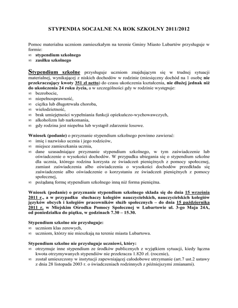 STYPENDIA SOCJALNE NA ROK SZKOLNY 2011/2012 Pomoc materialna uczniom zamieszkałym na terenie Gminy Miasto Lubartów przysługuje w formie: • stypendium szkolnego • zasiłku szkolnego Stypendium szkolne przysługuje uczniom znajdującym się w trudnej sytuacji materialnej, wynikającej z niskich dochodów w rodzinie (miesięczny dochód na 1 osobę nie przekraczający kwoty 351 zł netto) do czasu ukończenia kształcenia, nie dłużej jednak niż do ukończenia 24 roku życia, a w szczególności gdy w rodzinie występuje: • bezrobocie, • niepełnosprawność, • ciężka lub długotrwała choroba, • wielodzietność, • brak umiejętności wypełniania funkcji opiekuńczo-wychowawczych, • alkoholizm lub narkomania, • gdy rodzina jest niepełna lub wystąpił zdarzenie losowe. Wniosek (podanie) o przyznanie stypendium szkolnego powinno zawierać: • imię i nazwisko ucznia i jego rodziców, • miejsce zamieszkania ucznia, • dane uzasadniające przyznanie stypendium szkolnego, w tym zaświadczenie lub oświadczenie o wysokości dochodów. W przypadku ubiegania się o stypendium szkolne dla ucznia, którego rodzina korzysta ze świadczeń pieniężnych z pomocy społecznej, zamiast zaświadczenia albo oświadczenia o wysokości dochodów przedkłada się zaświadczenie albo oświadczenie o korzystaniu ze świadczeń pieniężnych z pomocy społecznej, • pożądaną formę stypendium szkolnego inną niż forma pieniężna. Wniosek (podanie) o przyznanie stypendium szkolnego składa się do dnia 15 września 2011 r., a w przypadku słuchaczy kolegiów nauczycielskich, nauczycielskich kolegiów języków obcych i kolegiów pracowników służb społecznych – do dnia 15 października 2011 r. w Miejskim Ośrodku Pomocy Społecznej w Lubartowie ul. 3-go Maja 24A, od poniedziałku do piątku, w godzinach 7.30 – 15.30. Stypendium szkolne nie przysługuje: • uczniom klas zerowych, • uczniom, którzy nie mieszkają na terenie miasta Lubartowa. Stypendium szkolne nie przysługuje uczniowi, który: • otrzymuje inne stypendium ze środków publicznych z wyjątkiem sytuacji, kiedy łączna kwota otrzymywanych stypendiów nie przekracza 1.820 zł. (rocznie), • został umieszczony w instytucji zapewniającej całodobowe utrzymanie (art.7 ust.2 ustawy z dnia 28 listopada 2003 r. o świadczeniach rodzinnych z późniejszymi zmianami). Wnioskodawcy zobowiązani są do przedstawienia informacji przy składanych wnioskach o wszystkich dochodach NETTO uzyskanych w miesiącu poprzedzającym złożenie wniosku (podania), bądź w przypadku utraty dochodu z miesiąca, w którym dochód ten utracono. Zasiłek szkolny może być przyznany uczniowi znajdującemu się przejściowo w trudnej sytuacji materialnej z powodu zdarzenia losowego. Zasiłek szkolny może być przyznany raz lub kilka razy w roku, niezależnie od otrzymywanego stypendium szkolnego. Wniosek (podanie) o przyznanie zasiłku szkolnego składa się w terminie nie dłuższym niż 2 miesiące od wystąpienia zdarzenia uzasadniającego przyznanie tego zasiłku w Miejskim Ośrodku Pomocy Społecznej w Lubartowie ul. 3-go Maja 24A, od poniedziałku do piątku, w godzinach 7.30 – 15.30. Uwaga! W związku z wejściem w życie Ustawy z dnia 25 marca 2011 r. o ograniczeniu barier administracyjnych dla obywateli i przedsiębiorców (Dz. U. Nr 106, poz. 622), została znowelizowana m.in. ustawa o systemie oświaty w zakresie przyznawania pomocy materialnej uczniom. W wyniku wejścia w życie zmian ustawowych, od dnia 1 lipca 2011 roku: 1. dokumentem potwierdzającym wysokość osiąganych dochodów może być nie tylko, tak jak dotychczas, zaświadczenie o wysokości osiągniętych dochodów lecz również oświadczenie, przy czym w takim przypadku w oświadczeniu konieczne jest dopisanie klauzuli, o której mowa w art. 90n ust. 5a ustawy o systemie oświaty o następującej treści: „Jestem świadomy odpowiedzialności karnej za złożenie fałszywego oświadczenia”, 2. w przypadku ubiegania się o stypendium szkolne dla ucznia, którego rodzina korzysta ze świadczeń pieniężnych z pomocy społecznej zamiast zaświadczenia lub oświadczenia o wysokości dochodów można przedłożyć zaświadczenie lub oświadczenie o korzystaniu ze świadczeń pieniężnych z pomocy społecznej, przy czym w takim przypadku w oświadczeniu konieczne jest dopisanie klauzuli, o której mowa w art. 90n ust. 5a ustawy o systemie oświaty o następującej treści: „Jestem świadomy odpowiedzialności karnej za złożenie fałszywego oświadczenia”. FORMY STYPENDIUM SZKOLNEGO (z wyłączeniem świadczenia pieniężnego) Formami stypendium szkolnego są: 1. całkowite lub częściowe pokrycie kosztów udziału w zajęciach edukacyjnych, w tym wyrównawczych, wykraczających poza zajęcia realizowane w szkole w ramach planu nauczania, a także udziału w zajęciach edukacyjnych realizowanych poza szkołą dodatkowych lekcjach języków obcych, zajęciach dla dyslektyków i dysgrafików, zajęciach: sportowych, tanecznych i muzycznych, 2. pomoc rzeczowa o charakterze edukacyjnym, obejmująca: a. zakup podręczników szkolnych do klasy, do której uczeń uczęszcza, według obowiązującego wykazu w danej szkole, b. zakup lektur szkolnych, encyklopedii, słowników, atlasów i innych książek pomocniczych w realizacji procesu dydaktycznego, c. zakup pomocy dydaktycznych i naukowych, komputera, części do komputera, edukacyjnych programów komputerowych, całkowitego lub częściowego pokrycia kosztów opłaty za korzystanie z Internetu, d. zakup zeszytów i przyborów szkolnych, tornistrów, plecaków, e. zakup stroju sportowego wymaganego na zajęciach wychowania fizycznego, w tym: dresu sportowego, spodenek sportowych, getrów, koszulki gimnastycznej, obuwia sportowego, skarpet sportowych, stroju pływackiego (czepka, okularów, kostiumu kąpielowego), f. innych pomocy dydaktycznych niezbędnych na danym etapie (profilu) kształcenia w