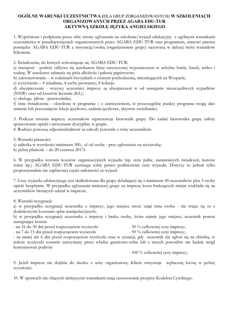 OGÓLNE WARUNKI UCZESTNICTWA (DLA GRUP ZORGANIZOWANYCH) W SZKOLENIACH ORGANIZOWANYCH PRZEZ AGABA EDU-TUR AKTYWNĄ SZKOŁĘ JĘZYKA ANGIELSKIEGO 1. Wypełniona i podpisana przez obie strony zgłoszenie na szkolenie/wyjazd edukacyjny z ogólnymi warunkami uczestnictwa w przedsięwzięciach organizowanych przez AGABA EDU-TUR oraz programem, stanowi umowę pomiędzy AGABA EDU-TUR a instytucją/osobą (organizatorem grupy) nazywaną w dalszej treści warunków Klientem. 2. Świadczenia, do których zobowiązuje się AGABA EDU-TUR: a) transport - podróż odbywa się autokarem klasy turystycznej wyposażonym w uchylne fotele, barek, wideo i toaletę. W autokarze zabrania się picia alkoholu i palenia papierosów; b) zakwaterowanie – w rodzinach brytyjskich o różnym pochodzeniu, mieszkających na Wyspach; c) wyżywienie – 4 śniadania, 4 suche prowianty, 4 kolacje; d) ubezpieczenie - wszyscy uczestnicy imprezy są ubezpieczeni w od następstw nieszczęśliwych wypadków (NNW) oraz od kosztów leczenia (KL); e) obsługa pilota - przewodnika; f) inne świadczenia - określone w programie ( z zastrzeżeniem, iż poszczególne punkty programu mogą ulec zmianie lub przesunięciu: lekcje językowe, zadania językowe, aktywne zwiedzanie). 3. Podczas trwania imprezy uczestników reprezentuje kierownik grupy. Do zadań kierownika grupy należy sprawowanie opieki i utrzymanie dyscypliny w grupie. 4. Rodzice ponoszą odpowiedzialność za szkody powstałe z winy uczestników. 5. Warunki płatności: a) zaliczka w wysokości minimum 300,- zł od osoby - przy zgłoszeniu na wycieczkę; b) pełna płatność – do 20 czerwca 2017r. 6. W przypadku wzrostu kosztów organizacyjnych wyjazdu (np. ceny paliw, zamawianych świadczeń, kursów walut itp.) AGABA EDU-TUR zastrzega sobie prawo podniesienia ceny wyjazdu. Dotyczy to jednak tylko proporcjonalnie nie zapłaconej części należności za wyjazd. 7. Ceny wyjazdu edukacyjnego jest skalkulowana dla grupy składającej się z minimum 40 uczestników plus 3 osoby opieki bezpłatnie. W przypadku zgłoszenia mniejszej grupy na imprezę koszt brakujących miejsc rozkłada się na uczestników biorących udział w imprezie. 8. Warunki rezygnacji: a) w przypadku rezygnacji uczestnika z imprezy, jego miejsce może zająć inna osoba - nie wiąże się to z dodatkowymi kosztami opłat manipulacyjnych; b) w przypadku rezygnacji uczestnika z imprezy i braku osoby, która zajmie jego miejsce, uczestnik ponosi następujące koszta: - na 16 do 30 dni przed rozpoczęciem wycieczki - 30 % całkowitej ceny imprezy; - na 7 do 15 dni przed rozpoczęciem wycieczki - 50 % całkowitej ceny imprezy; - na mniej niż 6 dni przed rozpoczęciem wycieczki oraz w sytuacji, gdy uczestnik nie zgłosi się na zbiórkę, w trakcie wycieczki zostanie zatrzymany przez władze graniczno-celne lub z innych powodów nie będzie mógł kontynuować podróży - 100 % całkowitej ceny imprezy; 9. Jeżeli impreza nie dojdzie do skutku z winy organizatora, Klient otrzymuje wysokości. wpłaconą kwotę w pełnej 10. W sprawach nie objętych niniejszymi warunkami mają zastosowanie przepisy Kodeksu Cywilnego.