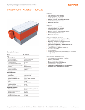 Systemy odciągowe stacjonarne i centralne 911600240.tif System 9000 - Nr.kat.:91 1400 220 Korzyści » » » » » duże ilości dymu /pyłu lub kurzu miejsca kształcenia, jak również ścieżki robotów spawalniczych spawarki laserowe, plazmowe oraz gazowe możliwa instalacja na zewnątrz spawalnie i szlifiernie Korzyści » » » » » duże ilości dymu /pyłu lub kurzu miejsca kształcenia, jak również ścieżki robotów spawalniczych spawarki laserowe, plazmowe oraz gazowe możliwa instalacja na zewnątrz spawalnie i szlifiernie Cechy charakterystyczne » » » » » » » » Dane techniczne Nr.kat. system automatycznego oczyszczania filtra, sterowany zmiennym ciśnieniem sterowanie za pomocą ekranu dotykowego wkłady filtrujące KemTex® ePTFE wiele wersji sprawdzonych również przez W3/IFA zbiorczy pojemnik na pył z podnośnikiem na sprężone powietrze modułowa konstrukcja uchwyty żurawia automatyczna regulacja objętości przepływu powietrza ( opcjonalnie) 91 1400 220 Filtr Dodatkowe wyposażenie Stopień filtracji 1 Metoda filtracyjna Filtr samoczyszczący Proces eksploatacyjny Dysze rotacyjne Powierzchnia filtra ok. 20 m² Liczba elementów filtracyjnych 11 Całkowita powierzchnia filtracyjna 220 m² Typ filtra Wkład nabojowy Materiał filtracyjny Membrana ePTFE Stopień oczyszczania > 99,99 % klasa pyłu M » » » » » automatyczne usuwanie pyłu – DustEvac regulacja podciśnienia system włączania/wyłączania zewnętrznego napięcia zasilającego separator iskier – SparkTrap obudowa chroniąca przed działaniem warunków atmosferycznych do instalacji na zewnątrz Dane podstawowe Moc ssąca 7 000 - 10 080 m³/h Podciśnienie 1 100 - 1 700 Pa Max. wzrost ciśnienia 2 500 Pa Wymiary (szer.x głęb.x wys.) 2 826 x 1 864 x 2 670 mm Ciężar 1.580 kg Silnik 15 kW Napięcie przyłącza 3 x 400 V / 50 Hz Prąd znamionowy 26,5 A Poziom ciśnienia akustycznego 65 dB(A) Dodatkowe informacje Typ wentylatora Wentylator radialny, z przekładnią pasową Zaopatrzenie w podciśnienie 5 - 6 bar Wylot powietrza 560 mm Wlot powietrza 560 mm Pojemność pojemnika na pył 2 x 192 l Kemper GmbH • Von-Siemens-Str. 20 • 48691 Vreden • Telefon +49 (0)25 64 68-0 • Fax +49 (0)25 64 68-120 • [email protected] www.kemper.eu Systemy odciągowe stacjonarne i centralne TZ_VA_911600240 TZ_SA_911600240 TZ_DS_911600240 TZ_IA_911600240 Dane techniczne Wymiary A 1 047 mm B 2 271 mm C 2 670 mm D 2 996 mm E 560 mm F 1 864 mm G 1 524 mm H 1 314 mm I 4 939 mm J 400 mm K 4 239 mm L 707 mm M 560 mm N 1 347 mm Kemper GmbH • Von-Siemens-Str. 20 • 48691 Vreden • Telefon +49 (0)25 64 68-0 • Fax +49 (0)25 64 68-120 • [email protected] www.kemper.eu Systemy odciągowe stacjonarne i centralne Wykres ciśnienie-objętość 3000 2500 2000 1500 1000 500 0 4.000 5.000 6.000 7.000 8.000 9.000 10.000 11.000 12.000 13.000 14.000 charakterystyka wentylatora użytkowy wzrost ciśnienia zalecany zakres użycia Kemper GmbH • Von-Siemens-Str. 20 • 48691 Vreden • Telefon +49 (0)25 64 68-0 • Fax +49 (0)25 64 68-120 • [email protected] www.kemper.eu