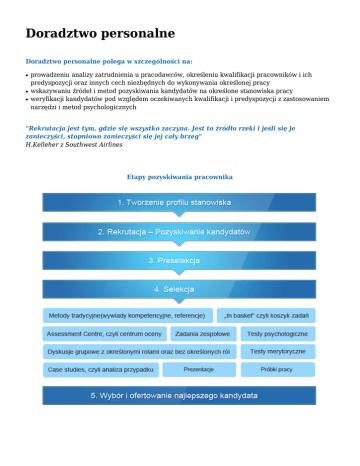 Doradztwo personalne Doradztwo personalne polega w szczególności na: ● ● ● prowadzeniu analizy zatrudnienia u pracodawców, określeniu kwalifikacji pracowników i ich predyspozycji oraz innych cech niezbędnych do wykonywania określonej pracy wskazywaniu źródeł i metod pozyskiwania kandydatów na określone stanowiska pracy weryfikacji kandydatów pod względem oczekiwanych kwalifikacji i predyspozycji z zastosowaniem narzędzi i metod psychologicznych "Rekrutacja jest tym, gdzie się wszystko zaczyna. Jest to źródło rzeki i jeśli się je zanieczyści, stopniowo zanieczyści się jej cały brzeg" H.Kelleher z Southwest Airlines Etapy pozyskiwania pracownika