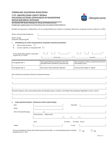 FORMULARZ ZGŁOSZENIA ROSZCZENIA Z TYT. UBEZPIECZENIA UTRATY ŹRÓDŁA DOCHODU/LECZENIA SZPITALNEGO W NASTĘPSTWIE NIESZCZĘŚLIWEGO WYPADKU Dla Klientów PKO Banku Polskiego SA, którzy są Posiadaczami kart kredytowych wydawanych przez Powszechną Kasę Oszczędności Bank Polski S.A. Wszelkie terminy pisane z wielkiej litery, o ile nie zostały zdefiniowane odrębnie w niniejszym dokumencie, przyjmują znaczenie nadane im w OWU. Numer Umowy Karty Kredytowej Numer szkody (Uzupełnia Ubezpieczyciel) 1. INFORMACJE NA TEMAT ZGŁASZANEGO ZDARZENIA UBEZPIECZENIOWEGO A. Utrata źródła dochodu B. Leczenie szpitalne w następstwie NW - Proszę podać datę zgodnie z poniższym opisem dot. lit. A lub B - r. - Pierwsza data - r. Druga data W przypadku pkt. A dzień wypowiedzenia zatrudnienia lub dzień wyrejestrowania Działalności gospodarczej dzień otrzymania statusu osoby Bezrobotnej lub Poszukującej pracę W przypadku pkt. B data zajścia Nieszczęśliwego Wypadku pierwszy dzień pobytu w szpitalu Opis okoliczności powstania Zdarzenia ubezpieczeniowego: Placówki medyczne, które sprawowały opiekę nad Ubezpieczonym w związku z zaistniałym Nieszczęśliwym Wypadkiem (nazwa i adres): 2. DANE UBEZPIECZONEGO (POSIADACZ KARTY KREDYTOWEJ) Imię Nazwisko PESEL Adres korespondencyjny Kod pocztowy Ulica Telefon Miejscowość Nr domu Nr lokalu Poczta E-mail W procesie likwidacji szkody, jako preferowany kanał kontaktu ze strony Ubezpieczyciela wskazuję powyższy adres E-mail TAK NIE Strona 1/3 3. DANE OSOBY ZGŁASZAJĄCEJ ROSZCZENIE, JAK WYŻEJ Imię Nazwisko PESEL Adres korespondencyjny Kod pocztowy Miejscowość Ulica Nr domu Telefon Nr lokalu E-mail W procesie likwidacji szkody, jako preferowany kanał kontaktu ze strony Ubezpieczyciela wskazuję powyższy adres E-mail 4. 5. Poczta RODZAJ ŹRÓDŁA DOCHODU Stosunek Pracy Renta / emerytura TAK NIE Wykonywanie Działalności gospodarczej Inna praca zarobkowa (umowa o dzieło, zlecenie, agencyjna) ZAŁĄCZONO WYMAGANE DO OBSŁUŻENIA SZKODY DOKUMENTY I INFORAMCJE (ZAZNACZ X, JEŚLI ZAŁĄCZONO DOKUMENT) Roszczenie: Utrata źródła dochodu (jeżeli zaznaczono pkt. A) Świadectwo pracy z ostatniego miejsca zatrudnienia lub oświadczenie pracodawcy o rozwiązaniu Stosunku pracy lub zakończenie Innej pracy zarobkowej. Ostatnia umowa na podstawie której zawarto Stosunek Pracy lub inny dokument potwierdzający zatrudnienie. Zaświadczenie o zakończeniu wykonywania Działalności gospodarczej (dotyczy tylko osób fizycznych, które prowadziły Działalność gospodarczą). Decyzja z Urzędu Pracy o przyznaniu statusu osoby Bezrobotnej lub statusu osoby Poszukującej pracy. Zaświadczenie z Urzędu Pracy potwierdzające status Bezrobotnego lub dowód pobrania zasiłku dla bezrobotnych, obejmujący okres wymagalności kolejnej spłaty Salda Zadłużenia. Roszczenie: Leczenie szpitalne w wyniku NW (jeżeli zaznaczono pkt. B) Dokumentacja medyczna dot. Leczenia szpitalnego (tzn. określająca rodzaj i przyczynę choroby). Karta informacyjna leczenia szpitalnego / wypis ze szpitala. Dokument potwierdzający okoliczności Nieszczęśliwego wypadku (protokoły powypadkowe policji lub dokumenty sporządzone przez prokuraturę, sąd, straż pożarną lub służby BHP, jeśli było prowadzone postępowanie dotyczące wypadku), Kopia prawa jazdy, jeżeli Nieszczęśliwy wypadek był wypadkiem komunikacyjnym i Ubezpieczony był kierującym pojazdem (w przypadku braku prawa jazdy wymagany jest sporządzony przez policję lub prokuraturę dokument zawierający informację, że Ubezpieczony prowadził pojazd mając odpowiednie uprawnienia) Uwaga! Ubezpieczyciel uprawniony jest do wystąpienia o przedłożenie innych niż wymienione powyżej dokumentów lub informacji w celu ustalenia odpowiedzialności ubezpieczeniowej, o ile są one niezbędne do dalszego prowadzenia postępowania. Kopie dokumentów powinny być potwierdzone za zgodność z oryginałem przez: pracownika Banku, pracownika Ubezpieczyciela, urzędnika administracji państwowej / samorządowej lub notariusza. Upoważniam PKO TU S.A. do zasięgania informacji o moim stanie zdrowia w zakresie niezbędnym do przyznania świadczenia i jego wysokości, a placówki medyczne do udzielania tych informacji. TAK NIE (Dotyczy sytuacji, w której osobą zgłaszającą roszczenie jest Ubezpieczony) r. Data (dd-mm-rrrr) Miejscowość Czytelny podpis osoby zgłaszającej roszczenie Strona 2/3 Poniższą część wypełnia Pracownik Banku 6. INFORMACJE O KARCIE Numer Umowy Karty Kredytowej Data wymagalności spłaty Salda zadłużenia Kwota Sumy Ubezpieczenia (Saldo zadłużenia z dnia wskazanego w OWU § 10.1) Średnia kwota Salda zadłużenia z Cyklu Rozliczeniowego poprzedzającego dzień opisany w OWU § 10.1 Przyznane świadczenie proszę przekazać przelewem na poniższy rachunek Karty kredytowej wydanej przez PKO Bank Polski (zgodnie z cesją złożoną we Deklaracji Przystąpienia): r. Data (dd-mm-rrrr) Miejscowość Podpis i pieczęć Upoważnionego Pracownika Banku Obowiązkiem Pracownika Banku jest dołączenie do formularza zgłoszenia roszczenia: kopii Deklaracji Przystąpienia wraz z aktualnymi danymi Ubezpieczonego (o ile zmiana danych nastąpiła w trakcie trwania umowy ubezpieczenia). PKO Towarzystwo Ubezpieczeń Spółka Akcyjna z siedzibą w Warszawie, przy ul. Chłodnej 52, 00-872 Warszawa wpisana do rejestru przedsiębiorców przez Sąd Rejonowy dla m. st. Warszawy w Warszawie, XII Wydział Gospodarczy Krajowego Rejestru Sądowego pod nr KRS 0000551487., NIP 527-27-34-144, kapitał zakładowy: 25 000 000,00 zł, wpłacony w całości. Infolinia: 81 535 67 66, www.pkoubezpieczenia.pl. Strona 3/3