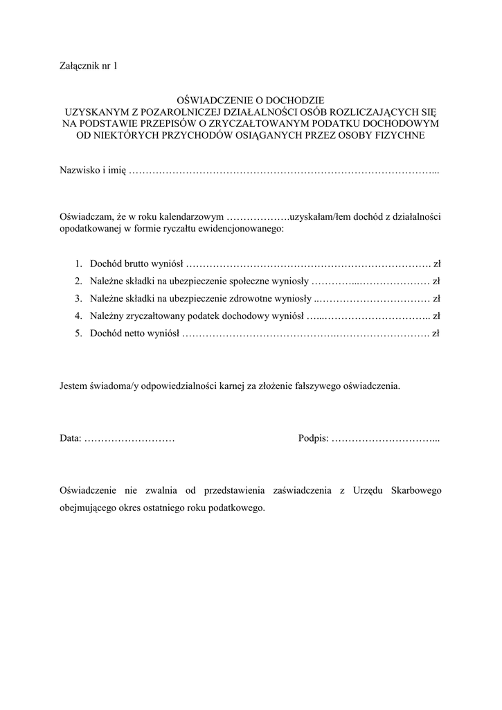 Załącznik nr 1 OŚWIADCZENIE O DOCHODZIE UZYSKANYM Z POZAROLNICZEJ DZIAŁALNOŚCI OSÓB ROZLICZAJĄCYCH SIĘ NA PODSTAWIE PRZEPISÓW O ZRYCZAŁTOWANYM PODATKU DOCHODOWYM OD NIEKTÓRYCH PRZYCHODÓW OSIĄGANYCH PRZEZ OSOBY FIZYCHNE Nazwisko i imię ………………………………………………………………………………... Oświadczam, że w roku kalendarzowym ……………….uzyskałam/łem dochód z działalności opodatkowanej w formie ryczałtu ewidencjonowanego: 1. Dochód brutto wyniósł ………………………………………………………………. zł 2. Należne składki na ubezpieczenie społeczne wyniosły …………...………………… zł 3. Należne składki na ubezpieczenie zdrowotne wyniosły ..…………………………… zł 4. Należny zryczałtowany podatek dochodowy wyniósł …...………………………….. zł 5. Dochód netto wyniósł ……………………………………….………………………. zł Jestem świadoma/y odpowiedzialności karnej za złożenie fałszywego oświadczenia. Data: ……………………… Podpis: …………………………... Oświadczenie nie zwalnia od przedstawienia zaświadczenia z Urzędu Skarbowego obejmującego okres ostatniego roku podatkowego.