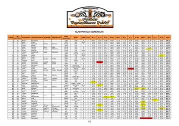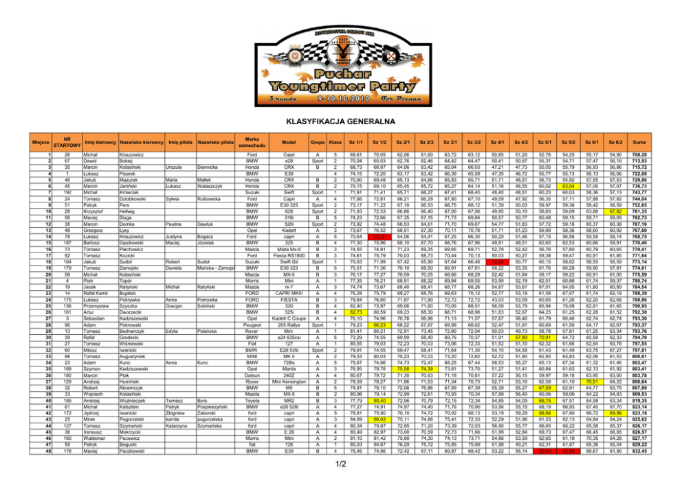 KLASYFIKACJA GENERALNA Miejsce 1 2 3 4 5 6 7 8 9 10 11 12 13 14 15 16 17 18 19 20 21 22 23 24 25 26 27 28 29 30 31 32 33 34 35 36 37 38 39 40 41 42 43 44 45 46 47 48 NR Imię kierowcy Nazwisko kierowcy STARTOWY 26 67 35 1 46 45 192 24 51 28 56 38 48 78 187 73 92 164 179 58 4 19 14 175 136 161 3 96 13 39 27 60 98 23 189 180 129 32 33 185 61 172 25 127 36 160 59 178 Michał Dawid Marcin Łukasz Jakub Marcin Michał Tomasz Patryk Krzysztof Maciej Marcin Grzegorz Łukasz Bartosz Tomasz Tomasz Jakub Tomasz Michał Piotr Jacek Rafał Kamil Łukasz Przemysław Artur Sebastian Adam Tomasz Rafał Tomasz Milosz Tomasz Adam Szymon Marcin Andrzej Robert Wojciech Andrzej Michał Jędrzej Mirek Tomasz Ireneusz Waldemar Patryk Maciej Krauzowicz Bokiej Kolasiński Pisarek Mazurek Janiński Kmieciak Dziobkowski Pers Hellwig Śluga Domka Łysy Krauzowicz Gęsikowski Piechowicz Kozicki Sudoł Zamojski Kolasiński Topór Ratyński Bujalski Pokrywka Szyszka Dworzecki Kadziszewski Piotrowski Bednarczyk Grodecki Wiśniewski Iwanicki Augustyniak Kunc Kadziszewski Ptak Humiński Abramczyk Kolasiński Woźniaczek Kalsztein Iwanicki Pogorzelski Szymański Mokrzycki Pacewicz Bogucki Paczkowski Imię pilota Nazwisko pilota Urszula Siennicka Maria Łukasz Małłek Walaszczyk Sylwia Rutkowska Paulina Gawluk Justyna Maciej Bogacz Józwiak Robert Daniela Sudoł Mańska - Zamojska Michał Ratyński Anna Gracjan Pokrywka Sobiński Edyta Polańska Anna Kunc Tomasz Patryk Zbigniew kamila Katarzyna Byra Pospieszyński Zaborski pogorzelska Szymańska Marka samochodu Model Ford BMW Honda BMW Honda Honda Suzuki Ford BMW BMW BMW BMW Opel Ford BMW Mazda Ford Suzuki BMW Mazda Morris Mazda FORD FORD BMW BMW Opel Peugeot Rover BMW Fiat BMW MINI BMW Opel Datsun Rover BMW Mazda Toyota BMW ford ford ford BMW Morris fiat BMW Capri e28 CRX E30 CRX CRX Swift Capri E30 325 628 318i 520i Kadett capri 325 Miata Mx-5 Fiesta RS1800 Swift Gti E30 323 MX-5 Mini rx-7 CAPRI MKIII FIESTA 320 325i Kadett C Coupe 205 Rallye Mini e24 635csi 127 E28 535i MK II 728is Manta 240Z Mini Kensington M5 MX-5 MR2 e28 528i capri capri capri E 28 Mini 126 E30 Grupa Klasa A Sport B B B Sport A Sport Sport B Sport A A B B B Sport B B A A A B B B A Sport A A A Sport A A A A A B B B A A A A A A A B 5 2 2 4 2 2 1 4 2 2 5 2 3 5 4 3 3 1 5 3 1 3 4 3 4 4 4 1 1 5 1 2 2 5 3 4 2 5 2 3 4 5 3 4 4 2 1 4 1/2 Sz 1/1 Sz 1/2 Sz 2/1 Sz 2/2 Sz 3/1 Sz 3/2 Sz 4/1 Sz 4/2 Sz 5/1 Sz 5/2 Sz 6/1 Sz 6/2 Suma 68,61 70,04 68,73 74,15 70,90 70,15 71,91 77,66 73,17 71,83 74,23 73,92 73,67 70,64 77,30 74,55 74,61 75,03 75,51 76,17 77,35 74,74 76,28 79,84 62,40 82,73 76,10 79,23 81,41 73,29 80,55 79,91 79,53 75,67 76,95 80,67 78,59 74,91 80,96 77,79 77,27 78,81 84,89 80,34 80,49 81,10 85,03 76,46 70,05 65,03 68,87 72,20 69,48 69,10 71,41 72,81 71,22 72,53 72,66 74,48 76,52 102,91 75,96 74,91 75,79 71,99 71,36 77,27 76,21 73,67 75,79 76,80 73,97 80,59 74,96 86,23 80,21 74,55 79,03 74,55 80,03 74,86 79,78 79,72 78,27 79,10 79,14 80,40 74,91 75,80 86,03 79,87 82,97 81,42 84,67 74,86 62,06 62,76 64,06 63,17 65,13 65,45 65,71 66,21 67,10 66,86 67,35 68,53 68,51 64,06 68,10 71,23 70,03 67,42 70,10 70,59 68,91 68,40 69,27 71,97 69,06 69,23 70,78 68,22 72,91 69,99 72,23 69,47 70,23 74,73 75,58 71,30 71,96 72,06 72,99 72,96 74,97 70,10 75,11 72,85 73,00 75,80 76,29 72,42 61,60 62,46 63,42 63,42 64,86 65,72 66,27 66,29 66,53 66,40 67,15 64,61 67,30 64,41 67,70 69,35 68,73 65,90 68,50 70,05 68,22 68,41 68,76 71,90 71,60 68,30 66,96 67,67 73,45 68,40 70,03 68,41 70,03 72,47 74,39 70,63 71,53 76,86 72,61 70,79 74,40 74,72 74,86 71,20 70,59 74,30 75,72 67,11 63,72 64,42 65,04 66,39 65,83 65,27 67,41 67,80 68,75 67,00 71,73 71,70 70,11 67,25 68,76 69,65 70,44 67,64 69,91 68,66 69,84 68,77 69,63 72,72 70,05 68,71 71,13 69,99 72,80 69,76 73,06 71,64 73,20 68,25 73,81 71,18 71,34 67,89 70,93 72,15 71,76 70,02 75,41 73,39 72,73 74,13 75,85 69,87 63,12 64,47 66,03 65,59 65,71 64,14 68,40 67,10 68,12 67,06 69,84 69,67 70,78 66,30 67,96 69,71 70,13 66,48 67,91 68,29 69,55 68,26 70,12 72,72 68,51 68,98 71,57 68,62 72,04 70,37 72,33 71,30 72,62 67,44 73,70 70,81 70,73 67,39 70,34 72,34 70,90 68,13 72,33 72,03 71,66 73,71 75,89 68,42 50,85 50,41 47,21 47,35 51,71 51,16 48,40 49,09 51,39 49,95 50,57 54,77 51,71 50,29 49,91 52,79 50,03 72,60 58,22 52,42 53,99 54,87 52,77 43,03 56,09 51,83 57,67 52,47 50,03 51,91 51,52 54,10 52,72 58,53 51,27 57,22 52,71 55,39 57,99 54,85 53,56 53,19 52,29 56,90 51,99 54,66 51,98 53,22 51,20 50,67 47,73 46,72 48,51 48,55 48,51 47,92 50,03 50,10 50,77 51,83 51,23 51,46 49,01 52,42 50,27 50,77 53,35 51,84 52,19 53,67 53,19 53,09 53,79 52,67 56,40 51,91 49,73 57,89 51,10 54,58 51,90 55,27 51,41 56,15 53,10 55,27 56,40 54,09 55,15 59,29 51,96 55,77 52,84 53,59 49,21 56,14 52,76 55,31 55,05 55,77 56,73 60,02 60,23 56,35 59,97 58,83 60,48 57,72 59,89 57,15 62,60 56,76 59,38 60,15 61,76 59,17 62,51 67,01 61,58 60,65 65,94 64,23 61,79 60,69 58,78 70,91 62,32 61,43 62,93 65,13 60,84 59,97 62,58 67,59 60,06 68,15 68,19 68,84 61,53 66,65 69,73 62,65 62,31 82,69 54,25 54,71 55,79 55,13 55,92 63,04 60,03 57,11 59,36 59,09 59,15 59,18 58,36 56,56 62,53 57,60 59,47 58,02 60,28 59,22 60,86 64,05 67,07 61,26 75,08 61,25 60,46 61,50 57,81 64,72 61,66 61,40 63,83 67,34 61,63 59,18 61,10 62,91 59,06 67,51 66,93 67,60 62,13 66,22 67,47 61,18 61,87 82,69 55,17 57,47 56,93 56,13 57,55 57,06 58,36 57,88 58,42 63,88 59,71 60,37 58,60 59,58 60,66 60,79 60,91 58,55 59,90 60,91 61,74 61,80 61,74 62,20 62,81 62,26 62,74 64,17 61,25 60,58 62,94 63,75 62,06 61,32 62,13 63,95 70,51 64,77 64,22 64,98 67,40 66,72 64,84 65,58 66,45 70,35 65,36 66,67 54,90 56,18 56,86 56,06 57,53 57,07 57,13 57,82 58,59 67,82 59,09 60,38 60,92 58,14 59,91 60,65 61,85 58,59 57,81 61,00 59,37 60,89 62,19 62,68 61,65 61,52 62,74 62,67 63,34 62,33 60,78 67,27 61,53 61,46 61,92 63,00 64,22 63,75 64,83 63,34 67,70 69,96 64,24 65,37 66,65 64,28 65,04 61,90 708,29 713,93 715,72 722,08 729,86 736,73 743,77 744,04 752,65 761,35 762,73 767,16 767,60 768,