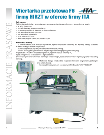 INFORMACJE PRASOWE Wiertarka przelotowa F6 firmy HIRZT w ofercie firmy ITA 4 Opis maszyny Elektroniczna wiertarka z automatycznym przesuwem obrabianego elementu i wierceniem od spodu. – w pełni elastyczna – natychmiastowe oczyszczenie otworu – prawa strona płyty nie styka się ze stołem roboczym – nie potrzebny fachowy personel – nie potrzebne ustawianie – pole robocze 600 mm – wiercenie płyty od spodu, od przodu i z tyłu. Konstrukcja maszyny Z normalizowanej stali o dużych wymiarach, wymiar większy niż potrzebny dla wysokiej precyzji przesuwu w osiach w długim okresie eksploatacji. Dzięki dużej konstrukcji nie potrzebne mocowanie do podłogi. Docisk boczny przez gumowe rolki dla prostego i dokładnego pozycjonowania płyty. Programator z PC Office na oddzielnej konsoli, wyświetlacz LCD kolorowy 9”, mysz, zintegrowana karta sieciowa i 2 gniazda USB. Środowisko graficzne całkowicie rozwinięte w technologii „object oriented” łatwo wykorzystywane w dowolnej aplikacji. Możliwość dialogu z najbardziej rozpowszechnionymi programami graficznymi oraz automatyzacji. Kompatybilne z systemami operacyjnymi Windows 9x/NT4/ /2000/XP. Przemysł Drzewny, październik 2008 4 KOMPOZYCJA MASZYNY 1°. Oś „X” Kontrola ruchu w pozycji X chwytaka trzymającego płytę. Automatyczne sterowanie ponownego pobrania płyty z funkcją kontrolną DANGER ZONE sterowaną przez CN. Kontrola aktywności wstecznej enkodera . 2° Oś „Y” Kontrola ruchu głowicy wiertarskiej z kontrolą aktywności wstecznej enkodera, programowania prędkości i przyśpieszenia 3° Oś “Z” Kontrola przesuwu, wykonanie wiercenia wrzecionami pionowymi. Wiercenie wrzecionami pionowymi odbywa się przy szybkim zbliżaniu i wierceniu, prędkość programowana zgodnie ze średnicą narzędzi. Przesuw sterowany z programu z kontrolą aktywności wstecznej enkodera. 5 Przemysł Drzewny, październik 2008 INFORMACJE PRASOWE Możliwość zintegrowania funkcji graficznych i operacyjnych specyficznych dla użytkownika. Systemy optymalizacji interfejsów dedykowanych. Nowy system CAD/CAM właściciela; Zintegrowany system CAD/CAM umożliwia wykonywanie sparametryzoawnych rysunków 3D i ich tłumaczenie na programy ISO. Dokleja uproszczone instrumenty dostosowane do specyficznych typów obróbki . Istnieje możliwość integrowania na rysunku informacji technologicznych i konstrukcyjnych specyficznych dla maszyny ( detale mechaniczne, prędkości ) konfigurowanych w różnych dziedzinach zastosowania. Gwarancja łączenia z innymi systemami CAD przez import/ eksport rysunków w różnych formatach: DXF (Auto CAD), CID (właściciela). Istnieje możliwość, przez specyficzne „narzędzia”, przetwarzanie samodzielnie odwzorowanych profili, przez digitalizatory z eliminacją błędów próbki i konwersją prostych profili dających się realizować w rzeczywistości. Instrumenty rysujące, informacje technologiczne, przetwarzanie i konstruowanie programów ISO całkowicie konfigurowane przez script w języku „C”. Tele-obsługa: przez wszechstronne oprogramowanie dostępne w sprzedaży można kontrolować na odległość wszystkie fukcje maszyny dla pełnej i skutecznej obsługi. 5