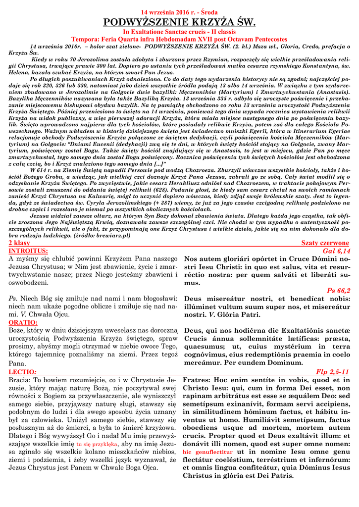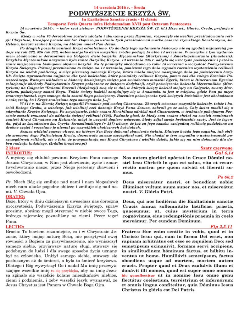 14 września 2016 r. - Środa PODWYŻSZENIE KRZYŻA ŚW. In Exaltatione Sanctae crucis - II classis Tempora: Feria Quarta infra Hebdomadam XVII post Octavam Pentecostes 14 września 2016r. – kolor szat zielone- PODWYŻSZENIE KRZYŻA ŚW. (2. kl.) Msza wł., Gloria, Credo, prefacja o Krzyżu Św. Kiedy w roku 70 Jerozolima została zdobyta i zburzona przez Rzymian, rozpoczęły się wielkie prześladowania religii Chrystusa, trwające prawie 300 lat. Dopiero po ustaniu tych prześladowań matka cesarza rzymskiego Konstantyna, św. Helena, kazała szukać Krzyża, na którym umarł Pan Jezus. Po długich poszukiwaniach Krzyż odnaleziono. Co do daty tego wydarzenia historycy nie są zgodni; najczęściej podaje się rok 320, 326 lub 330, natomiast jako dzień wszystkie źródła podają 13 albo 14 września. W związku z tym wydarzeniem zbudowano w Jerozolimie na Golgocie dwie bazyliki: Męczenników (Martyrium) i Zmartwychwstania (Anastasis). Bazylika Męczenników nazywana była także Bazyliką Krzyża. 13 września 335 r. odbyło się uroczyste poświęcenie i przekazanie miejscowemu biskupowi obydwu bazylik. Na tę pamiątkę obchodzono co roku 13 września uroczystość Podwyższenia Krzyża Świętego. Później przeniesiono to święto na 14 września, ponieważ tego dnia wypada rocznica wystawienia relikwii Krzyża na widok publiczny, a więc pierwszej adoracji Krzyża, która miała miejsce następnego dnia po poświęceniu bazylik. Święto wprowadzono najpierw dla tych kościołów, które posiadały relikwie Krzyża, potem zaś dla całego Kościoła Powszechnego. Ważnym wkładem w historię dzisiejszego święta jest świadectwo mniszki Egerii, która w Itinerarium Egeriae relacjonuje obchody Podwyższenia Krzyża połączone ze świętem dedykacji, czyli poświęcenia kościoła Męczenników (Martyrium) na Golgocie: "Dniami Eucenii (dedykacji) zwą się te dni, w których święty kościół stojący na Golgocie, zwany Martyrium, poświęcony został Bogu. Także święty kościół znajdujący się w Anastasis, to jest w miejscu, gdzie Pan po męce zmartwychwstał, tego samego dnia został Bogu poświęcony. Rocznica poświęcenia tych świętych kościołów jest obchodzona z całą czcią, bo i Krzyż znaleziono tego samego dnia [...]" W 614 r. na Ziemię Świętą napadli Persowie pod wodzą Chozroeza. Zburzyli wówczas wszystkie kościoły, także i kościół Bożego Grobu, a wiedząc, jak wielkiej czci doznaje Krzyż Pana Jezusa, zabrali go ze sobą. Cały świat modlił się o odzyskanie Krzyża Świętego. Po zwycięstwie, jakie cesarz Herakliusz odniósł nad Chozroezem, w traktacie pokojowym Persowie zostali zmuszeni do oddania świętej relikwii (628). Podanie głosi, że kiedy sam cesarz chciał na swoich ramionach zanieść Krzyż Chrystusa na Kalwarię, mógł to uczynić dopiero wówczas, kiedy zdjął swoje królewskie szaty. Jest to legenda, gdyż ze świadectwa św. Cyryla Jerozolimskiego (+ 387) wiemy, że już za jego czasów czcigodną relikwię podzielono na drobne części i rozesłano je niemal po wszystkich okolicznych kościołach. Jezusa widział zawsze ołtarz, na którym Syn Boży dokonał zbawienia świata. Dlatego każda jego cząstka, tak obficie zroszona Jego Najświętszą Krwią, doznawała zawsze szczególnej czci. Nie chodzi w tym wypadku o autentyczność poszczególnych relikwii, ale o fakt, że przypominają one Krzyż Chrystusa i wielkie dzieło, jakie się na nim dokonało dla dobra rodzaju ludzkiego. (źródło: brewiarz.pl) 2 klasy Szaty czerwone Gal 6,14 Nos autem gloriári opórtet in Cruce Dómini nostri Iesu Christi: in quo est salus, vita et resurréctio nostra: per quem salváti et liberáti sumus. Ps 66,2 Ps. Niech Bóg się zmiłuje nad nami i nam błogosławi: Deus misereátur nostri, et benedícat nobis: niech nam ukaże pogodne oblicze i zmiłuje się nad na- illúminet vultum suum super nos, et misereátur mi. V. Chwała Ojcu. nostri. V. Glória Patri. ORATIO: Boże, który w dniu dzisiejszym uweselasz nas doroczną Deus, qui nos hodiérna die Exaltatiónis sanctæ uroczystością Podwyższenia Krzyża świętego, spraw Crucis ánnua sollemnitáte lætíficas: præsta, prosimy, abyśmy mogli otrzymać w niebie owoce Tego, quaesumus; ut, cuius mystérium in terra którego tajemnicę poznaliśmy na ziemi. Przez tegoż cognóvimus, eius redemptiónis praemia in coelo mereámur. Per eundem Dominum. Pana. LECTIO: Flp 2,5-11 Bracia: To bowiem rozumiejcie, co i w Chrystusie Je- Fratres: Hoc enim sentíte in vobis, quod et in zusie, który mając naturę Bożą, nie poczytywał swej Christo Iesu: qui, cum in forma Dei esset, non równości z Bogiem za przywłaszczenie, ale wyniszczył rapinam arbitrátus est esse se æquálem Deo: sed samego siebie, przyjąwszy naturę sługi, stawszy się semetípsum exinanívit, formam servi accipiens, podobnym do ludzi i dla swego sposobu życia uznany in similitudinem hóminum factus, et hábitu inbył za człowieka. Uniżył samego siebie, stawszy się ventus ut homo. Humiliávit semetípsum, factus posłusznym aż do śmierci, a była to śmierć krzyżowa. oboediens usque ad mortem, mortem autem Dlatego i Bóg wywyższył Go i nadał Mu imię przewyż- crucis. Propter quod et Deus exaltávit illum: et szające wszelkie imię tu się przyklęka, aby na imię Jezu- donávit illi nomen, quod est super omne nomen: sa zginało się wszelkie kolano mieszkańców niebios, hic genuflectitur ut in nomine Iesu omne genu ziemi i podziemia, i żeby wszelki język wyznawał, że flectátur coeléstium, terréstrium et infernórum: Jezus Chrystus jest Panem w Chwale Boga Ojca. et omnis lingua confiteátur, quia Dóminus Iesus Christus in glória est Dei Patris. INTROITUS: A myśmy się chlubić powinni Krzyżem Pana naszego Jezusa Chrystusa; w Nim jest zbawienie, życie i zmartwychwstanie nasze; przez Niego jesteśmy zbawieni i oswobodzeni. GRADUALE: Flp 2,8-9 Chrystus stał się dla nas posłusz