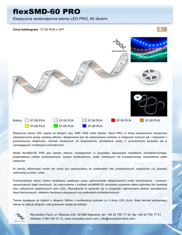 flexSMD-60 PRO Elastyczna wodoodporna taśma LED PRO, 60 diod/m Cena katalogowa 57,00 PLN z VAT Kolory 57,00 PLN 57,00 PLN 57,00 PLN 57,00 PLN 57,00 PLN 57,00 PLN 57,00 PLN 57,00 PLN Elastyczna taśma LED oparta na diodach typu SMD 3528 marki Epistar. Seria PRO, w której zastosowano obustronne zabezpieczenie grubą warstwą silikonu, dedykowana jest do wykorzysania zarówno w miejscach suchych jak i miejscach o podwyższonej wilgotności, również narażonych na bezpośrednie zachlapanie wodą. Z powodzeniem sprawdzi się w wymagających instalacjach zewnętrznych. Model flexSMD-60 PRO jest bardzo dobrym rozwiązaniem w przypadku planowania oświetlenia architektonicznego, podświetlenia sufitów podwieszanych, tynków strukturalnych, półek meblowych lub krawędziowego rozświetlenia półek szklanych. W branży reklamowej model ten może być wykorzystany do podświetleń liter przestrzennych, kasetonów czy grawerki wykonanej na plexi i szkle. Funkcjonalność taśmy można dodatkowo zwiększyć przez wykorzystanie dedykowanych profili aluminiowych - prostych, wpuszczanych bądź narożnych. Jej wykorzstanie z profilem archiBAR-25 umożliwia uzyskanie efektu jednolitej linii świetlnej (bez widocznych pojedynczych diod LED). Rozwiązanie to sprawdzi się w przypadku wykonywania otoków zewnętrznych stacji benzynowych, obiektów handlowo-usługowych czy podkreśleń architektonicznych. Taśma występuje na rolkach o długości 500cm z możliwością podziału co 3 diody LED (5cm). Biały laminat pokrywający taśmę na całej jej długości, zdecydowanie nadaje jej estetyki. Revolution-Tech, ul. Gliwicka 234, 40-860 Katowice, tel. +48 32 750 17 30, fax +48 32 750 17 41 Infolinia: 0 801 08 14 15, www.revolution-tech.com, [email protected] 1/2 Cechami wyróżniającymi produkt jest bardzo wysoka jakość wykonania (potwierdzona czteroletnią gwarancją), minimalne spadki jasności w czasie oraz gwarancja zgodności temperatury barwowej dla każdej z diod. Do każdej rolki dołaczany jest zestaw konektorów połączeniowych o wysokim stopniu szczelności IP65 oraz nakładek silikonowych, umożliwiających utrzymanie szczelności taśmy po jej przecięciu na krótsze sekcje. Dedykowana do instalacji, w których liczy się niezawodność. Specyfikacje Ilość diod LED w sekcji/module 3 szt Ilość sekcji/modułów na metr 20 szt Ilość diod LED na metr 60 szt Dystans cięcia 5 cm Maksymalna długość odcinka 5m Typ diody LED SMD 3528 Średni czas życia diody 50 000 godz. Wodoszczelność tak Współczynnik ochrony IP IP65 Obudowa silikon Jednostka sprzedaży metry Wymiary 100,0 / 1,0 / 0,3 cm Waga 0,07 kg Waga brutto (z opakowaniem) 0,08 kg Gwarancja 48 m-cy WW NW CW R A Y G B Napięcie 12 V 12 V 12 V 12 V 12 V 12 V 12 V 12 V Prąd DC DC DC DC DC DC DC DC Natężenie 0,4 A 0,4 A 0,4 A 0,4 A 0,4 A 0,4 A 0,4 A 0,4 A Pobór mocy 4,8 W 4,8 W 4,8 W 4,8 W 4,8 W 4,8 W 4,8 W 4,8 W Strumień świetlny 300 lm 320 lm 360 lm 120 lm 120 lm 150 lm 270 lm 72 lm 140 ° 140 ° 140 ° 140 ° 140 ° 140 ° 140 ° 140 ° 625 nm 600 nm 591 nm 525 nm 470 nm 3 000 K 4 000 K 6 500 K Kąt świecenia Fala świetlna Temperatura barwowa Revolution-Tech, ul. Gliwicka 234, 40-860 Katowice, tel. +48 32 750 17 30, fax +48 32 750 17 41 Infolinia: 0 801 08 14 15, www.revolution-tech.com, [email protected] 2/2