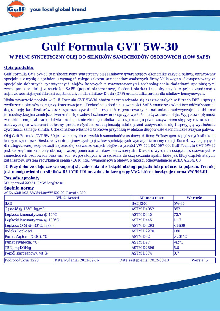 Gulf Formula GVT 5W-30 W PEŁNI SYNTETYCZNY OLEJ DO SILNIKÓW SAMOCHODÓW OSOBOWYCH (LOW SAPS) Opis produktu Gulf Formula GVT 5W-30 to niskoemisyjny syntetyczny olej silnikowy gwarantujący ekonomikę zużycia paliwa, opracowany specjalnie z myślą o spełnieniu wymagań całego zakresu samochodów osobowych firmy Volkswagen. Skomponowany ze specjalnie dobranych syntetycznych olejów bazowych z zaawansowanymi technologicznie dodatkami spełniającymi wymagania średniej zawartości SAPS (popiół siarczanowy, fosfor i siarka) tak, aby uzyskać pełną zgodność z najnowocześniejszymi filtrami cząstek stałych dla silników Diesla (DPF) oraz katalizatorami dla silników benzynowych. Niska zawartość popiołu w Gulf Formula GVT 5W-30 obniża nagromadzanie się cząstek stałych w filtrach DPF i sprzyja wydłużeniu okresów pomiędzy konserwacjami. Technologia średniej zawartości SAPS zmniejsza szkodliwe oddziaływanie i degradację katalizatorów oraz wydłuża żywotność urządzeń regenerowanych, natomiast nadzwyczajna stabilność termooksydacyjna zmniejsza tworzenie się osadów i szlamów oraz sprzyja wydłużeniu żywotności oleju. Wyjątkowa płynność w niskich temperaturach ułatwia uruchamianie zimnego silnika i zabezpiecza go przed zużywaniem się przy rozruchach a nadzwyczajne własności ochrony przed zużyciem zabezpieczają silnik przed zużywaniem się i sprzyjają wydłużeniu żywotności samego silnika. Udoskonalone własności tarciowe przynoszą w efekcie długotrwałe ekonomiczne zużycie paliwa. Olej Gulf Formula GVT 5W-30 jest zalecany do wszystkich samochodów osobowych firmy Volkswagen napędzanych silnikami benzynowymi oraz Diesla, w tym do najnowszych pojazdów spełniających wymagania normy emisji Euro 4, wymagających dla długotrwałej eksploatacji najbardziej zaawansowanych olejów, o jakości VW 504 00/ 507 00. Gulf Formula GVT 5W-30 jest szczególnie zalecany dla najnowszej generacji silników benzynowych i Diesla o wysokich osiągach stosowanych w samochodach osobowych oraz van’ach, wyposażonych w urządzenia do oczyszczania spalin takie jak filtry cząstek stałych, katalizatory, system recyrkulacji spalin (EGR), itp., wymagających olejów, o jakości odpowiadającej ACEA A3/B4, C3. !!! Przy doborze oleju zawsze sugeruj się zaleceniami z książki obsługi pojazdu lub producenta pojazdu. Ten olej jest nieodpowiedni do silników R5 i V10 TDI oraz do silników grupy VAG, które obowiązuje norma VW 506.01. Posiada aprobaty MB-Approval 229.51, BMW Longlife-04 Spełnia normy ACEA A3/B4/C3, VW 504.00/VW 507.00, Porsche C30 Właściwości SAE Gęstość @ 15°C, kg/m3 Lepkość kinematyczna @ 40°C Lepkość kinematyczna @ 100°C Lepkość CCS @ -30°C, mPa.s Indeks Lepkości Punkt Zapłonu (COC), °C Punkt Płynięcia, °C TBN, mgKOH/g Popiół siarczanowy, wt % Kod produktu: 1223 Data wydania: 2013-09-16 Metoda testu SAE J300 ASTM D4052 ASTM D445 ASTM D445 ASTM D5293 ASTM D2270 ASTM D92 ASTM D97 ASTM D2896 ASTM D874 Data zastąpienia: 2012-08-13 Wartość 5W-30 852 73.7 11.7 <6600 180 >201°C -42°C 5.5 0.7 Wersja: 6