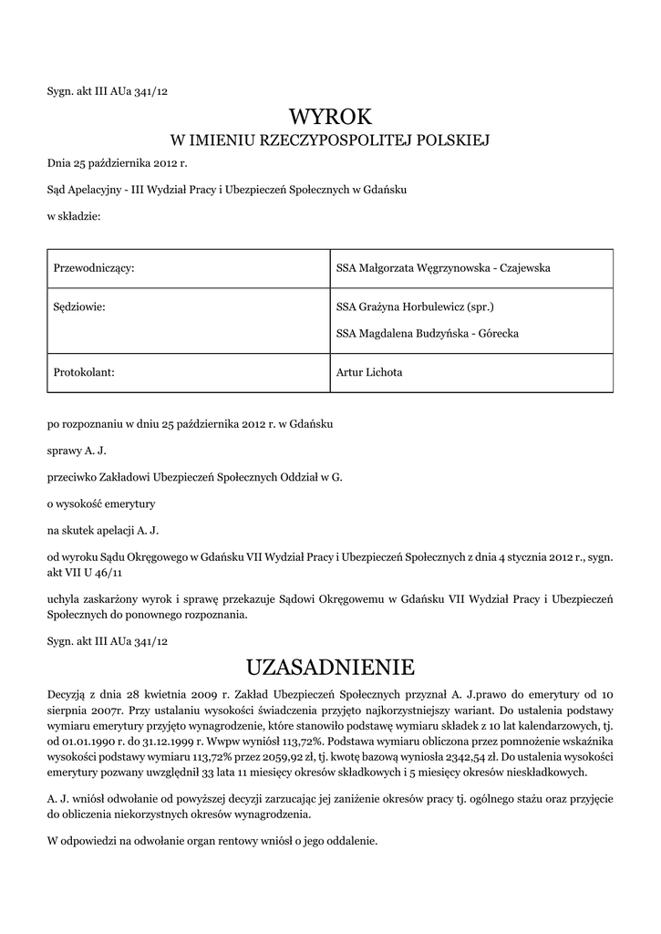 Sygn. akt III AUa 341/12 WYROK W IMIENIU RZECZYPOSPOLITEJ POLSKIEJ Dnia 25 października 2012 r. Sąd Apelacyjny - III Wydział Pracy i Ubezpieczeń Społecznych w Gdańsku w składzie: Przewodniczący: SSA Małgorzata Węgrzynowska - Czajewska Sędziowie: SSA Grażyna Horbulewicz (spr.) SSA Magdalena Budzyńska - Górecka Protokolant: Artur Lichota po rozpoznaniu w dniu 25 października 2012 r. w Gdańsku sprawy A. J. przeciwko Zakładowi Ubezpieczeń Społecznych Oddział w G. o wysokość emerytury na skutek apelacji A. J. od wyroku Sądu Okręgowego w Gdańsku VII Wydział Pracy i Ubezpieczeń Społecznych z dnia 4 stycznia 2012 r., sygn. akt VII U 46/11 uchyla zaskarżony wyrok i sprawę przekazuje Sądowi Okręgowemu w Gdańsku VII Wydział Pracy i Ubezpieczeń Społecznych do ponownego rozpoznania. Sygn. akt III AUa 341/12 UZASADNIENIE Decyzją z dnia 28 kwietnia 2009 r. Zakład Ubezpieczeń Społecznych przyznał A. J.prawo do emerytury od 10 sierpnia 2007r. Przy ustalaniu wysokości świadczenia przyjęto najkorzystniejszy wariant. Do ustalenia podstawy wymiaru emerytury przyjęto wynagrodzenie, które stanowiło podstawę wymiaru składek z 10 lat kalendarzowych, tj. od 01.01.1990 r. do 31.12.1999 r. Wwpw wyniósł 113,72%. Podstawa wymiaru obliczona przez pomnożenie wskaźnika wysokości podstawy wymiaru 113,72% przez 2059,92 zł, tj. kwotę bazową wyniosła 2342,54 zł. Do ustalenia wysokości emerytury pozwany uwzględnił 33 lata 11 miesięcy okresów składkowych i 5 miesięcy okresów nieskładkowych. A. J. wniósł odwołanie od powyższej decyzji zarzucając jej zaniżenie okresów pracy tj. ogólnego stażu oraz przyjęcie do obliczenia niekorzystnych okresów wynagrodzenia. W odpowiedzi na odwołanie organ rentowy wniósł o jego oddalenie. Na rozprawie w dniu 18 listopada 2009r. A. J. wskazał, że wnosi o zaliczenie do stażu pracy okresów od stycznia 1982 r. do 31 grudnia 1983 r., od 18 czerwca 1984 r. do 31 grudnia 1985r. oraz od 1 stycznia 1987 r. do 31 grudnia 1988r. Na rozprawie w dniu 21 grudnia 2011 r. A. J. oświadczył, że podtrzymuje swoje roszczenie o zaliczenie okresu pracy w (...) w czasie zatrudnienia w byłej NRD oraz innych okresów wskazanych przez niego. Ubezpieczony wskazał, że w NRD pracował 4 lata i nie ma za ten okres wynagrodzenia. Wyrokiem z dnia 4 stycznia 2012 r. Sąd Okręgowy w Gdańsku VIII Wydział Pracy i Ubezpieczeń Społecznych oddalił odwołanie. Uzasadniając swoje stanowisko Sąd wskazał, iż A. J. w okresie od 1 września 1969 r. do 12 października 1990r. pracował na podstawie umowy o pracę w Zakładach (...) w G. na stanowisku elektromonter. W okresie zatrudnienia był kierowany na budowy eksportowe w NRD. A. J. w dniu 10 sierpnia 2007 r. złożył w Zakładzie Ubezpieczeń Społecznych wniosek o emeryturę do którego dołączył kserokopie kartotek płacowych za okres zatrudnienia w Zakładzie (...)-1990r. oraz zarobki zastępcze za czas eksportu pracownika w kraju za okres zatrudnienia 1979, 1980, 1982, 1983, 1984, 1985, 1987, 1988, 1989r. na nazwiska S. G., H. K., H. W.. A. J. nie otrzymywał wynagrodzenia w kraju za okresy: 01.01.1978 r. -31.09.1978 r., 01.06.1979 r. - 31.07.1980 r., 01.01.1982 r. - 31.12.1982 r., 01.01.1983 r. -31.12.1983 r., 01.07.1984 r. - 31.12.1985 r., 01.01.1987 r. - 31.12.1988 r. Za wskazane okresy nie ma informacji o uiszczeniu składek na ubezpieczenie społeczne. W książeczce ubezpieczeniowej wskazano zarobki A. J. w Przedsiębiorstwie (...) za lata 1969-1973. Decyzją z 30 października 2007r. Zakład Ubezpieczeń Społecznych odmówił A. J. prawa do emerytury z tytułu pracy w szczególnych warunkach z uwagi na nieudokumentowanie 15 lat pracy w szczególnych warunkach. Zakład nie uwzględnił okresu pracy od 1 kwietnia 1969 r. do 12 października 1990 r. jako pracy w szczególnych warunkach. Na skutek odwołania złożonego przez A. J. od powyższej decyzji Sąd Okręgowy w Gdańsku zmienił zaskarżoną decyzję i przyznał A. J. prawo do emerytury od dnia złożenia wniosku. Decyzją z 28 kwietnia 2009 r. Zakład Ubezpieczeń Społecznych przyznał A. J. prawo do emerytury od 10 sierpnia 2007r., do ustalenia podstawy jej wymiaru przyjmując wynagrodzenie, które stanowiło podstawę wymiaru składek z 10 lat kalendarzowych, tj. od 01.01. 1990 r. do 31.12.1999r. Wskaźnik wysokości podstawy wymiaru wyniósł 113,72%. Podstawa wymiaru obliczona przez pomnożenie wskaźnika wysokości podstawy wymiaru 113,72% przez 2059,92 zł, tj. kwotę bazową wyniosła 2342,54 zł. Do ustalenia wysokości emerytury Zakład uwzględnił 33 lata 11 miesięcy okresów składkowych i 5 miesięcy okresów nieskładkowych. Zakład uznał za udowodnione okresy: 01.09.1961 r. - 24.08.1963 r., 02.03.1965 r. - 18.04.1968 r., 17.05.1968 r. - 21.08.1969 r., 01.09.1969 r. - 31.12.1977 r., 01.10.1978 r.-31.05.1979 r., 01.08.1980 r. - 31.12.1980 r., 01.01.1981 r. - 31.12.1981 r., 01.01.1984 r. -17.06.1984 r., 01.01.1986 r. - 31.12.1986 r., 01.05.1989 r. - 12.10.1990 r., 13.10.1990 r. -30.11.2000 r., 19.03.2001 r.- 31.12.2002 r., 05.11.2001 r., 23.02.2002 r. 04.03.2002 r., 09.12.2002 r. - 13.12.2002 r., 23.12.2002 r., 09.02.2004 r. - 30.11.2005 r., 02.01.2006 r.-30.06.2007 r., 03.02.2006 r. - 30.06.2006 r. W przedmiotowej sprawie wnioskodawca zarzucił organowi rentowemu zaniżenie stażu pracy oraz przyjęcie do obliczenia świadczenia niekorzystnych okresów wynagrodzenia, tj. z kolejnych 10 lat, zamiast z 20 lat kalendarzowych wybranych z całego okresu podlegania ubezpieczeniu społecznemu. Co do zarzutu wnioskodawcy zaniżenia stażu pracy Sąd Okręgowy stwierdził, że ubezpieczony wykazał, iż w spornych okresach świadczył pracę na tzw. budowach eksportowych, której to okoliczności organ rentowy nie kwestionował. Wskazanych przez ubezpieczonego okresów nie można jednak zaliczyć do okresów, z których wynagrodzenie przyjmuje się do ustalenia podstawy wymiaru. Na podstawie przedłożonej p