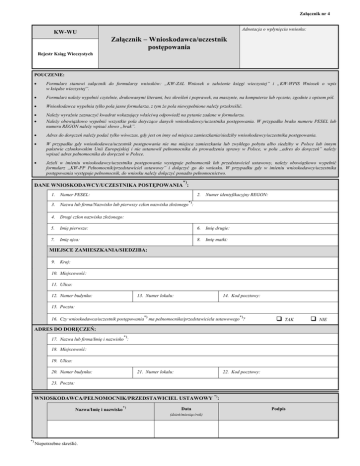 Załącznik nr 4 Adnotacja o wpłynięciu wniosku: KW-WU Załącznik – Wnioskodawca/uczestnik postępowania Rejestr Ksiąg Wieczystych POUCZENIE: Formularz stanowi załącznik do formularzy wniosków: „KW-ZAL Wniosek o założenie księgi wieczystej” i „KW-WPIS Wniosek o wpis w księdze wieczystej”. Formularz należy wypełnić czytelnie, drukowanymi literami, bez skreśleń i poprawek, na maszynie, na komputerze lub ręcznie, zgodnie z opisem pól. Wnioskodawca wypełnia tylko pola jasne formularza, z tym że pola niewypełnione należy przekreślić. Należy wyraźnie zaznaczyć kwadrat wskazujący właściwą odpowiedź na pytanie zadane w formularzu. Należy obowiązkowo wypełnić wszystkie pola dotyczące danych wnioskodawcy/uczestnika postępowania. W przypadku braku numeru PESEL lub numeru REGON należy wpisać słowo „brak”. Adres do doręczeń należy podać tylko wówczas, gdy jest on inny od miejsca zamieszkania/siedziby wnioskodawcy/uczestnika postępowania. W przypadku gdy wnioskodawca/uczestnik postępowania nie ma miejsca zamieszkania lub zwykłego pobytu albo siedziby w Polsce lub innym państwie członkowskim Unii Europejskiej i nie ustanowił pełnomocnika do prowadzenia sprawy w Polsce, w polu „adres do doręczeń” należy wpisać adres pełnomocnika do doręczeń w Polsce. Jeżeli w imieniu wnioskodawcy/uczestnika postępowania występuje pełnomocnik lub przedstawiciel ustawowy, należy obowiązkowo wypełnić formularz „KW-PP Pełnomocnik/przedstawiciel ustawowy” i dołączyć go do wniosku. W przypadku gdy w imieniu wnioskodawcy/uczestnika postępowania występuje pełnomocnik, do wniosku należy dołączyć ponadto pełnomocnictwo. *) DANE WNIOSKODAWCY/UCZESTNIKA POSTĘPOWANIA : 1. Numer PESEL: 2. Numer identyfikacyjny REGON: *) 3. Nazwa lub firma/Nazwisko lub pierwszy człon nazwiska złożonego : 4. Drugi człon nazwiska złożonego: 5. Imię pierwsze: 6. Imię drugie: 7. Imię ojca: 8. Imię matki: MIEJSCE ZAMIESZKANIA/SIEDZIBA: 9. Kraj: 10. Miejscowość: 11. Ulica: 12. Numer budynku: 13. Numer lokalu: 14. Kod pocztowy: 15. Poczta: *) *) 16. Czy wnioskodawca/uczestnik postępowania ma pełnomocnika/przedstawiciela ustawowego ? TAK ADRES DO DORĘCZEŃ: *) 17. Nazwa lub firma/Imię i nazwisko : 18. Miejscowość: 19. Ulica: 20. Numer budynku: 21. Numer lokalu: 22. Kod pocztowy: 23. Poczta: *) WNIOSKODAWCA/PEŁNOMOCNIK/PRZEDSTAWICIEL USTAWOWY : Nazwa/Imię i nazwisko *) Data (dzień/miesiąc/rok) *) Niepotrzebne skreślić. Podpis NIE