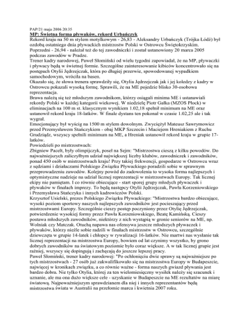 PAP/21 maja 2006 20:35 MP: Świetna forma pływaków, rekord Urbańczyk Rekord kraju na 50 m stylem motylkowym - 26,83 - Aleksandry Urbańczyk (Trójka Łódź) był ozdobą ostatniego dnia pływackich mistrzostw Polski w Ostrowcu Świętokrzyskim. Poprzedni - 26,94 - naleŜał teŜ do tej zawodniczki i został ustanowiony 20 marca 2005 podczas zawodów w Pradze. Trener kadry narodowej, Paweł Słomiński od wielu tygodni zapowiadał, Ŝe na MP, pływaczki i pływacy będą w świetnej formie. Szczególne zainteresowanie kibiców koncentrowało się na postępach Otylii Jędrzejczak, która po długiej przerwie, spowodowanej wypadkiem samochodowym, wróciła na basen. Okazało się, Ŝe słowa trenera sprawdziły się, Otylia Jędrzejczak jak i jej koledzy z kadry w Ostrowcu pokazali wysoką formę. Sprawili, Ŝe na ME pojedzie blisko 30-osobowa reprezentacja. Brawa naleŜą się teŜ młodszym zawodnikom, którzy osiągali minima ME i ustanawiali rekordy Polski w kaŜdej kategorii wiekowej. W niedzielę Piotr Gałka (MZOS Płock) w eliminacjach na 100 m st. klasycznym wynikiem 1.02,18 spełnił minimum na ME oraz ustanowił rekord kraju 18-latków. W finale dystans ten pokonał w czasie 1.02,25 ale i tak wygrał. Emocjonujący był wyścig na 1500 m stylem dowolnym. ZwycięŜył Mateusz Sawrymowicz przed Przemysławem Stańczykiem - obaj MKP Szczecin i Maciejem Hreniakiem z Ruchu Grudziądz, wszyscy spełnili minimum na ME, a Hreniak ustanowił rekord kraju w grupie 17latków. Powiedzieli po mistrzostwach: Zbigniew Pacelt, były olimpijczyk, poseł na Sejm: "Mistrzostwa cieszą z kilku powodów. Do najwaŜniejszych zaliczyłbym udział największej liczby klubów, zawodniczek i zawodników, ponad 450 osób w mistrzostwach kraju! Przy takiej frekwencji, gospodarze w Ostrowcu wraz z sędziami i działaczami Polskiego Związku Pływackiego poradzili sobie w sprawnym przeprowadzeniu zawodów. Kolejny powód do zadowolenia to wysoka forma najlepszych i optymistyczne nadzieje na udział licznej reprezentacji w mistrzostwach Europy. Tak licznej ekipy nie pamiętam. I co równie obiecujące - start sporej grupy młodych pływaczek i pływaków w finałach imprezy. To będą następcy Otylii Jędrzejczak, Pawła Korzeniowskiego i Przemysława Stańczyka i innych kadrowiczów Polski. Krzysztof Usielski, prezes Polskiego Związku Pływackiego: "Mistrzostwa bardzo obiecujące, wysoki poziom sportowy naszych najlepszych zawodników jest pocieszający przed mistrzostwami Europy. Szczególnie cieszy postęp poczyniony przez Otylię Jędrzejczak, potwierdzenie wysokiej formy przez Pawła Korzeniowskiego, Beatę Kamińską. Cieszy postawa młodszych zawodników, niektórzy z nich wystąpią w gronie seniorów na ME, np. Wolniak czy Matczak. Otuchą napawa nas ofensywa jeszcze młodszych pływaczek i pływaków, którzy nieźle sobie radzili w finałach mistrzostw w Ostrowcu, szczególnie dziewczęta w grupie 14-latek i chłopcy w rywalizacji 16-latków. Nie martwi nas wysłanie tak licznej reprezentacji na mistrzostwa Europy, bowiem od lat czynimy wszystko, by grono dobrych zawodników na światowym poziomie było coraz większe. A w tak licznej grupie jest raźniej, wszyscy się dopingują i zachęcają do jeszcze lepszej pracy. Paweł Słomiński, trener kadry narodowej: "Po ochłonięciu dwie sprawy są najwaŜniejsze po tych mistrzostwach - 27 osób juŜ zakwalifikowało się na mistrzostwa Europy w Budapeszcie, najwięcej w kronikach związku, a co równie waŜne - forma naszych gwiazd pływania jest bardzo dobra. Nie tylko Otylia, której za ten wielomiesięczny wysiłek naleŜy się szacunek i uznanie, ale ma ona duŜo większe cele - uzyskanie w Budapeszcie na ME rezultatów na miarę światową. NajpowaŜniejszym sprawdzianem dla niej i innych reprezentantów będą mistrzostwa świata w Australii na przełomie marca i kwietnia 2007 roku. Wyniki: kobiety 100 m st. dowolnym 1. Katarzyna Kowalczyk (MZOS Płock) 57,27 2. Sonia Bochyńska (Junior Kluczbork) 58,02 3. Agata Zwiejska (Delfin Toruń) 58,25 4. Kamila Włostowska (11-tka Jelenia Góra) 58,28 5. Agnieszka Solan (AZS AWF Warszawa) 58,91 6. Alina Biskupska (Astromal Akwawit Leszno) 58,95 7. Magdalena Fijałkowska (AZS Katowice) 59,34 100 m st. klasycznym 1. Beata Kamińska (AZS AWF Gdańsk) 1.09,49 (min.ME) 2. Katarzyna Dulian (Victoria Racibórz) 1.11,23 3. Katarzyna Dembniak (Victoria Racibórz) 1.11,99 4. Iwona Prędecka (Dwory Unia Oświęcim) 1.12,03 5. Luiza Hryniewicz (Trójka Łódź) 1.12,41 6. Anna Bielawska (AZS AWF Gdańsk) 1.13,90 7. Monika Marczak (MOSM Tychy) 1.14,26 8. Paulina Szydło (Juvenia Wrocław) 1.14,67 50 m st. motylkowym 1. Aleksandra Urbańczyk (Trójka Łódź) 26,83 (min.ME, RP) 2. Agata Korc (AZS AWF Wrocław) 27,25 (min.ME) 3. Małgorzata Gembicka (AZS AWF Wrocław) 27,91 4. Beata Suchorska (Olimpia Poznań) 28,39 5. Anna Dowgiert (Juvenia Białystok) 28,51 6. Dominika śak (Skra Bełchatów) 28,54 7. Agata Nowak (Słowianka Gorzów) 28,81 8. Agnieszka Gapińska (AZS AWF Warszawa) 28,94 800 m st. dowolnym 1. Katarzyna Baranowska (MKP Szczecin) 8.52,14 2. Justyna Hampel (KSZO Ostrowiec) 8.52,80 3. Iga Kalinowska (MKP Szczecin) 8.53,03 4. Aleksandra Bernat (Warta Poznań) 9.01,51 5. Angelika Oleksy (AZS AWF Warszawa) 9.04,01 6. Katarzyna Siuda (Unia Oświęcim) 9.15,13 7. Aleksandra Majda (MKP Szczecin) 9.16,57 8. Aleksandra Kamińska (BUKS Warszawa) 9.20,29 sztafeta 4x100 m st. zmiennym 1. AZS AWF Warszawa 4.20,16 2. Polonia Warszawa 4.22,26 3. Dwory-Unia Oświęcim 4.24,68 4. AZS AWF Wrocław 4.24,75 5. Trójka Łódź 4.26,08 6. Novita Zielona Góra 4.46,52 7. Zryw Opole 4.32,69 8. Victoria Racibórz 4.33,55 męŜczyźni 100 m st. dowolnym 1. Michał Witkowski (AZS AWF Warszawa) 50,25 2. Marcin Babuchowski (Trójka Łódź) 50,88 3. Kajetan Załuski (Novita Zielona Góra) 51,37 4. Marcin Unold (AZS Katowice) 51,45 5. Mateusz Haas (Jordan Kraków) 51,73 6. Michał Winiewicz (Śląsk Wrocław) 51,98 7. Dawid Zi