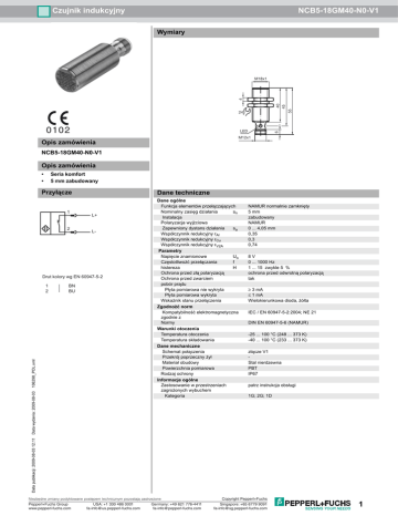 Czujnik indukcyjny NCB5-18GM40-N0-V1 Wymiary 55 40 45 4 M18x1 24 0 102 6 LED M12x1 Opis zamówienia NCB5-18GM40-N0-V1 Opis zamówienia • • Seria komfort 5 mm zabudowany Przyłącze 1 2 Dane techniczne L+ L- Drut kolory wg EN 60947-5-2 Data publikacji: 2009-08-03 12:11 Data wydania: 2009-08-03 106298_POL.xml 1 2 BN BU Dane ogólne Funkcja elementów przełączających Nominalny zasięg działania sn Instalacja Polaryzacja wyjżciowa Zapewniony dystans działania sa Współczynnik redukcyjny rAl Współczynnik redukcyjny rCu Współczynnik redukcyjny rV2A Parametry Napięcie znamionowe Uo Częstotliwożć przełączania f histereza H Ochrona przed złą polaryzacją Ochrona przed zwarciem pobór prądu Płyta pomiarowa nie wykryta Płyta pomiarowa wykryta Wskażnik stanu przełączenia Zgodnożć norm Kompatybilność elektromagnetyczna zgodnie z Normy Warunki otoczenia Temperatura otoczenia Temperatura składowania Dane mechaniczne Schemat połączenia Przekrój poprzeczny żył Materiał obudowy Powierzchnia pomiarowa Rodzaj ochrony Informacje ogólne Zastosowanie w przestrzeniach zagrożonych wybuchem Kategoria Niezbêdne zmiany podyktowane postêpem technicznym pozostaj¹ zastrze¿one Pepperl+Fuchs Group USA: +1 330 486 0001 Germany: +49 621 776-4411 www.pepperl-fuchs.com [email protected] [email protected] NAMUR normalnie zamknięty 5 mm zabudowany NAMUR 0 ... 4,05 mm 0,35 0,3 0,74 8V 0 ... 1000 Hz 1 ... 15 zwykle 5 % ochrona przed odwrotną polaryzacją tak ≥ 3 mA ≤ 1 mA Wielokierunkowa dioda, żółta IEC / EN 60947-5-2:2004; NE 21 DIN EN 60947-5-6 (NAMUR) -25 ... 100 °C (248 ... 373 K) -40 ... 100 °C (233 ... 373 K) złącze V1 Stal nierdzewna PBT IP67 patrz instrukcja obsługi 1G; 2G; 1D Copyright Pepperl+Fuchs Singapore: +65 6779 9091 [email protected] 1 Czujnik indukcyjny NCB5-18GM40-N0-V1 ATEX 1G Instrukcja obsługi Urządzenia elektryczne dla przestrzeni zagrożonych wybuchem Kategoria urządzenia 1G do użytku w przestrzeniach zagrożonych wybuchem gazu, oparów, mgły. zgodność z wytycznymi 94/9/EG Zgodnożć norm EN 60079-0:2006, EN 60079-11:2007, EN 60079-26:2007 Zabezpieczenie przed zapłonem - wykonanie iskrobezpieczne ograniczenie przez następujące warunki Oznakowanie CE Znak Ex zaświadczenie EG dot. sprawdzenia danego typu modelu Przyporządkowany typ 0102 ¬ II 1G Ex ia IIC T6 PTB 00 ATEX 2048 X NCB5-18GM...-N0... Efektywna pojemność wewnętrzna Ci Efektywna indukcyjność wewnętrzna Li ≤ 95 nF ; Uwzględniona długość kabla 10 m. Informacje ogólne Urządzenie należy używać zgodnie z danymi katalogowymi oraz danymi zawartymi w tej instrukcji obsługi. Należy przestrzegać certyfikatu badania prototypu WE. Należy przestrzegać warunków szczególnych! Dyrektywa 94/9EG i tym samym certyfikaty badania prototypu WE obowiązują wyłącznie podczas eksploatacji urządzeń elektrycznych w warunkach atmosferycznych. Używanie w temperaturze otoczenia >60 °C było przetestowane w przypadku gorących powierzchni zgodnie z certyfikatem. W przypadku używania poza warunkami atmosferycznymi, należy uwzględnić zmniejszenie minimalnej dopuszczalnej energii zapłonowej. Maksymalna dopuszczalna temperatura otoczenia Zakres temperatury, w zależności od klasy temperaturowej, podany jest w certyfikacie badania prototypu WE. Uwaga: Należy korzystać z tabeli temperatur dla kategorii 1!!! Wartożci podane w tabeli temperatur dla kategorii 1 pomniejszone są o 20% zgodnie z EN 11271:2007. Instalacja, uruchomienie Należy przestrzegać przepisów prawnych i/lub rozporządzeń i norm regulujących użycie lub też użycia zgodnego z przeznaczeniem. Iskrobezpieczność urządzeń jest gwarantowana jedynie w przypadku podłączenia z urządzeniem przynależnym, które posiada zaświadczenie o wykonaniu iskrobezpiecznym. Przynależne urządzenie musi spełniać wymagania kategorii "ia". Ze względu na niebezpieczeństwo zapłonu, do którego może dojść wskutek błędów oraz/lub prądów fazowych w systemie wyrównania potencjałów, należy odizolować galwanicznie obwód prądu zasilającego od prądu sygnałowego. Zastosowanie przynależnego urządzenia bez izolacji galwanicznej dozwolone jest tylko wtedy, gdy spełnione są odpowiednie wymagania normy IEC 6007914. Konserwacja, serwis Nie wolno dokonywać żadnych zmian przy urządzeniach przeznaczonych do pracy w przestrzeniach zagrożonych wybuchem. Wykonywanie napraw tych urządzeń nie jest możliwe. ≤ 100 µH ; Uwzględniona długość kabla 10 m. Szczególne warunki Podczas zastosowania w temperaturze poniżej -20°C chronić czujnik przed uderzeniem poprzez zabudowę w dodatkową obudowę. Wyładowanie elektrostatyczne Należy unikać wyładowań elektrostatycznych metalowych elementów obudowy. Uniknięcie niebezpiecznego wywyładowania elektrostatycznego metalowych komponentów obudowy możliwe jest przez ich uziemienie. Data publikacji: 2009-08-03 12:11 Data wydania: 2009-08-03 106298_POL.xml Ochrona przed uszkodzeniami mechanicznymi 2 Niezbêdne zmiany podyktowane postêpem technicznym pozostaj¹ zastrze¿one Pepperl+Fuchs Group USA: +1 330 486 0001 Germany: +49 621 776-4411 www.pepperl-fuchs.com [email protected] [email protected] Copyright Pepperl+Fuchs Singapore: +65 6779 9091 [email protected] Czujnik indukcyjny NCB5-18GM40-N0-V1 ATEX 2G Instrukcja obsługi Urządzenia elektryczne dla przestrzeni zagrożonych wybuchem Kategoria urządzenia 2G do użytku w przestrzeniach zagrożonych wybuchem gazu, oparów i mgły. zgodność z wytycznymi 94/9/EG Zgodnożć norm EN 60079-0:2006, EN 60079-11:2007 Zabezpieczenie przed zapłonem - wykonanie iskrobezpieczne ograniczenie przez następujące warunki Oznakowanie CE Znak Ex zaświadczenie EG dot. sprawdzenia danego typu modelu Przyporządkowany typ Efektywna pojemność wewnętrzna Ci Efektywna indukcyjność wewnętrzna Li Informacje ogólne 0102 ¬ II 1G Ex ia IIC T6 PTB 00 ATEX 2048 X NCB5-18GM...-N0... ≤ 95 nF ; Uwzględniona długość kab