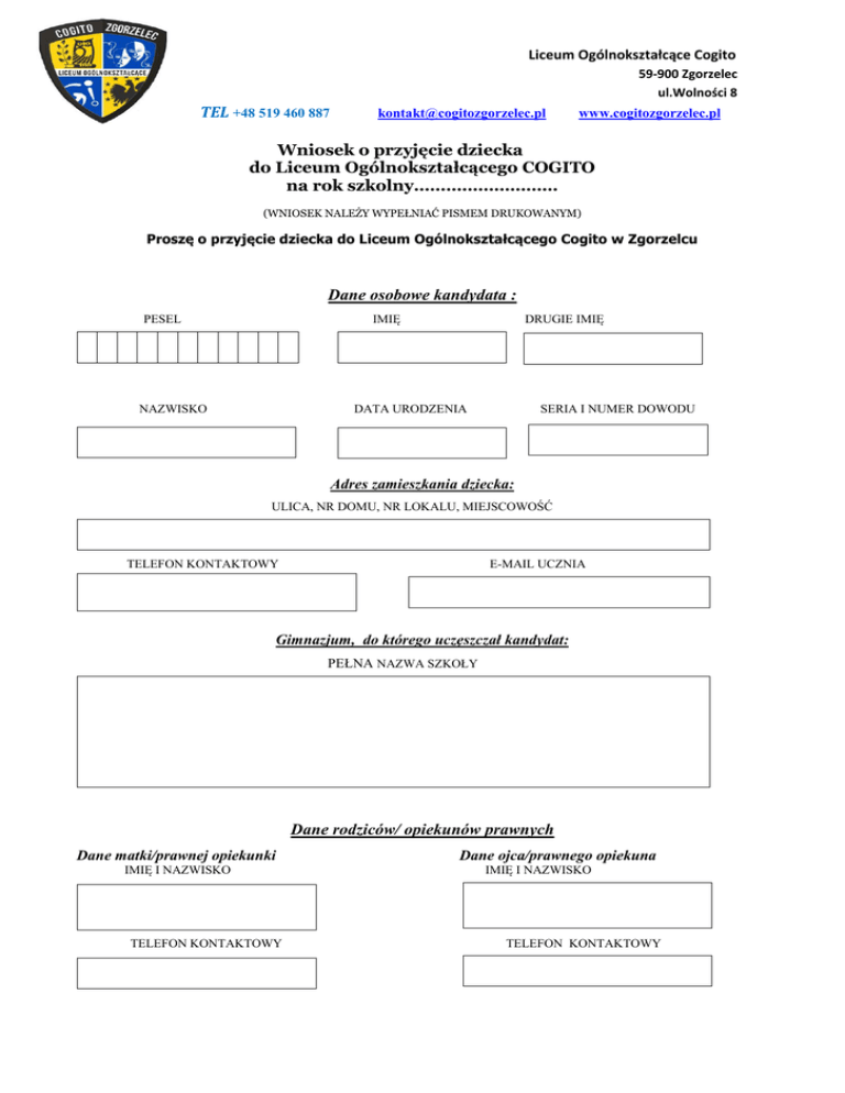 Liceum Ogólnokształcące Cogito 59-900 Zgorzelec ul.Wolności 8 TEL +48 519 460 887 [email protected] www.cogitozgorzelec.pl Wniosek o przyjęcie dziecka do Liceum Ogólnokształcącego COGITO na rok szkolny……………………… (WNIOSEK NALEŻY WYPEŁNIAĆ PISMEM DRUKOWANYM) Proszę o przyjęcie dziecka do Liceum Ogólnokształcącego Cogito w Zgorzelcu Dane osobowe kandydata : IMIĘ PESEL NAZWISKO DRUGIE IMIĘ DATA URODZENIA SERIA I NUMER DOWODU Adres zamieszkania dziecka: ULICA, NR DOMU, NR LOKALU, MIEJSCOWOŚĆ TELEFON KONTAKTOWY E-MAIL UCZNIA Gimnazjum, do którego uczęszczał kandydat: PEŁNA NAZWA SZKOŁY Dane rodziców/ opiekunów prawnych Dane matki/prawnej opiekunki IMIĘ I NAZWISKO TELEFON KONTAKTOWY Dane ojca/prawnego opiekuna IMIĘ I NAZWISKO TELEFON KONTAKTOWY Liceum Ogólnokształcące Cogito 59-900 Zgorzelec ul.Wolności 8 TEL +48 519 460 887 [email protected] ADRES E-MAIL www.cogitozgorzelec.pl ADRES E-MAIL ADRES ZAMELDOWANIA ADRES ZAMELDOWANIA Wybieram jako rozszerzony język: □ język angielski □język niemiecki Wybieram jako drugi język: □język angielski □język hiszpański □język niemiecki □język rosyjski (kółka językowe z języków: włoskiego / hiszpańskiego / rosyjskiego, będą ustalone na początku roku szkolnego na podstawie liczby chętnych gdyż mają formę zajęć nieobowiązkowych) Wybieram następujące przedmioty rozszerzone (min.2 max.3) : □ język polski □ historia □ WOS ………………………………………….. data i podpis rodzica/prawnego opiekuna □ fizyka □ informatyka □ matematyka □ chemia □ biologia □ geografia ...................................................... data i podpis ucznia Wyrażam zgodę na przetwarzanie danych osobowych zawartych we wniosku w celu przeprowadzenia procedury rekrutacji do szkoły, w tym w systemach informatycznych. Nadto w przypadku zakończenia rekrutacji z wynikiem pozytywnym wyrażam zgodę na przekazanie tych danych szkole oraz organowi założycielskiemu i organowi uprawnionemu do nadzoru nad jednostkami oświatowymi w zakresie związanym z procesem kształcenia i przetwarzania tych danych przez te podmioty. Przetwarzanie danych odbywać się będzie zgodnie z ustawą o ochronie danych osobowych (t.j. Dz. U. z 2002 r. Nr 101, poz. 926 z późniejszymi zmianami). Przyjmuję do wiadomości, że przysługuje mi prawo wglądu do przetwarzanych danych osobowych i ich poprawiania w siedzibie właściwej szkoły. Jestem świadomy odpowiedzialności karnej za złożenie fałszywego oświadczenia i oświadczam, że dane przedłożone w niniejszym wniosku są zgodne ze stanem faktycznym oraz zobowiązuję się do niezwłocznego powiadomienia dyrektora szkoły o zmianie danych zawartych we wniosku. Data przyjęcia wniosku …………………………………………………..….. podpis rodzica/prawnego opiekuna