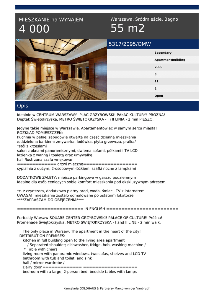 MIESZKANIE na WYNAJEM 4 000 Warszawa, Śródmieście, Bagno 55 m2 5317/2095/OMW Secondary ApartmentBuilding 2009 3 11 2 Open Opis Idealnie w CENTRUM WARSZAWY- PLAC GRZYBOWSKI! PAŁAC KULTURY! PRÓŻNA! Deptak Świętokrzyska, METRO ŚWIĘTOKRZYSKA - I i II LINIA - 2 min PIESZO. Jedyne takie miejsce w Warszawie. Apartamentowiec w samym sercu miasta! ROZKŁAD POMIESZCZEŃ: kuchnia w pełnej zabudowie otwarta na część dzienną mieszkania /oddzielona barkiem; zmywarka, lodówka, płyta grzewcza, pralka/ *stół z krzesłami salon z oknami panoramicznymi, dwiema sofami, półkami i TV LCD łazienka z wanną i toaletą oraz umywalką hall /lustrzana szafa wnękowa/ ============= drzwi mleczne================== sypialnia z dużym, 2-osobowym łóżkiem, szafki nocne z lampkami DODATKOWE ZALETY: miejsce parkingowe w garażu podziemnym Idealne dla osób ceniących sobie komfort mieszkania pod ekskluzywnym adresem. *c. z czynszem, dodatkowo płatny prąd, woda, śmieci, TV z internetem UWAGA!: mieszkanie zostało odmalowane po ostatnim lokatorze ****ZAPRASZAM DO OBEJRZENIA**** ====================== IN ENGLISH ======================== Perfectly Warsaw-SQUARE CENTER GRZYBOWSKI! PALACE OF CULTURE! Próżna! Promenade Świętokrzyska, METRO ŚWIĘTOKRZYSKA - I and II LINE - 2 min walk. The only place in Warsaw. The apartment in the heart of the city! DISTRIBUTION PREMISES: kitchen in full building open to the living area apartment / Separated shoulder; dishwasher, fridge, hob, washing machine / * Table with chairs living room with panoramic windows, two sofas, shelves and LCD TV bathroom with tub and toilet, and sink hall / mirror wardrobe / Dairy door ============= ================== bedroom with a large, 2-person bed, bedside tables with lamps Kancelaria GOLDHAUS & Partnerzy Marco von der Vanbrugh ADDITIONAL FEATURES: parking space in the underground garage Ideal for people who appreciate comfort of living under exclusive address. * C. with the rent, extra pay electricity, water, garbage, TV and internet WARNING !: apartment was repainted after the last Lokator **** WELCOME TO SEE **** 111/ Krystian Rzeźnik tel. +48/792-181-880 email: [email protected] Kancelaria GOLDHAUS & Partnerzy Marco von der Vanbrugh Powered by TCPDF (www.tcpdf.org)