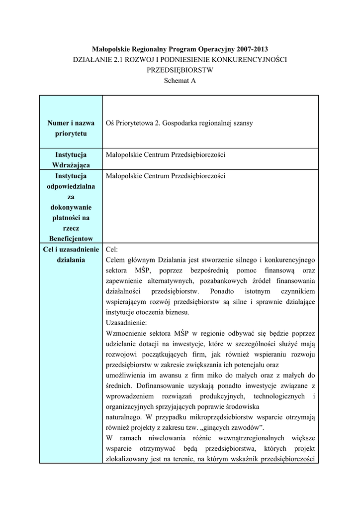 Małopolskie Regionalny Program Operacyjny 2007-2013 DZIAŁANIE 2.1 ROZWOJ I PODNIESIENIE KONKURENCYJNOŚCI PRZEDSIĘBIORSTW Schemat A Numer i nazwa priorytetu Instytucja Wdrażająca Instytucja odpowiedzialna za dokonywanie płatności na rzecz Beneficjentow Cel i uzasadnienie działania Oś Priorytetowa 2. Gospodarka regionalnej szansy Małopolskie Centrum Przedsiębiorczości Małopolskie Centrum Przedsiębiorczości Cel: Celem głównym Działania jest stworzenie silnego i konkurencyjnego sektora MŚP, poprzez bezpośrednią pomoc finansową oraz zapewnienie alternatywnych, pozabankowych źródeł finansowania działalności przedsiębiorstw. Ponadto istotnym czynnikiem wspierającym rozwój przedsiębiorstw są silne i sprawnie działające instytucje otoczenia biznesu. Uzasadnienie: Wzmocnienie sektora MŚP w regionie odbywać się będzie poprzez udzielanie dotacji na inwestycje, które w szczególności służyć mają rozwojowi początkujących firm, jak również wspieraniu rozwoju przedsiębiorstw w zakresie zwiększania ich potencjału oraz umożliwienia im awansu z firm miko do małych oraz z małych do średnich. Dofinansowanie uzyskają ponadto inwestycje związane z wprowadzeniem rozwiązań produkcyjnych, technologicznych i organizacyjnych sprzyjających poprawie środowiska naturalnego. W przypadku mikroprzędsiebiorstw wsparcie otrzymają również projekty z zakresu tzw. „ginących zawodów”. W ramach niwelowania różnic wewnątrzregionalnych większe wsparcie otrzymywać będą przedsiębiorstwa, których projekt zlokalizowany jest na terenie, na którym wskaźnik przedsiębiorczości (liczba przedsiębiorstw na 1000 mieszkańców) mierzony na poziomie powiatu wynosi poniżej 75% średniej dla województwa małopolskiego (wg danych GUS). W tym celu każdorazowo w ramach procedury naboru wniosków o dofinansowanie projektów przygotowywana będzie aktualna mapa obrazująca wartość wskaźnika przedsiębiorczości w Województwie Małopolskim, w podziale na poszczególne powiaty. Ponadto wsparciem objęte zostaną wspólne inicjatywy przedsiębiorców polegające na tworzeniu oraz rozwijaniu powiązań i sieci współpracy, w tym klastrów. Taka forma współpracy przedsiębiorców poszerzy ich rynki zbytu, umożliwi dostęp do nowych rozwiązań technologicznych, przyczyni się do efektywniejszego wykorzystywania wspólnych zasobów. Przykładowe rodzaje projektow Schemat A: Bezpośrednie wsparcie inwestycji w MŚP 1. Projekty inwestycyjne poprawiające konkurencyjność przedsiębiorstwa, związane z unowocześnieniem sposobu działania jak i oferty poprzez: - rozbudowę i nabycie przedsiębiorstwa, - działania mające na celu dokonywanie zasadniczych zmian produkcji bądź procesu produkcyjnego, - zmianę stosowanych rozwiązań produkcyjnych, technologicznych, organizacyjnych na sprzyjające poprawie środowiska naturalnego oraz BHP, - unowocześnienie wyposażenia niezbędnego do prowadzenia działalności gospodarczej przedsiębiorstwa, - zmianę wyrobu i usługi, w tym także zmianę w sposobie świadczenia usług, - modernizację środków produkcji. Wyłączenia dla działania 2.1 - projekty przedsiębiorstw z branży handlu detalicznego i branży turystycznej. Wsparcie projektów z branży turystycznej w ramach działania 3.1 MRPO; - osoby podlegające ubezpieczeniu w KRUS – wsparcie w ramach PROW; - wsparcie nie będzie mogło być udzielone przed upływem ustalonego okresu karencji (2 lata) podmiotom, które rozpoczęły działalność gospodarczą uzyskując wsparcie z EFS (warunek dotyczy projektów realizowanych w perspektywie finansowej 2007 – 2013). Wyłączenia dla schematu A: - projekty mikro i małych przedsiębiorstw prowadzących działalność gospodarczą nie dłużej niż rok polegające na świadczeniu usług drogą elektroniczną oraz wytworzeniu produktów cyfrowych niezbędnych do świadczenia tych usług. Lista wydatkow kwalifikowalnych w ramach działania Do wydatków kwalifikowanych zaliczane będą: Schemat A: 1. Zakup prawa własności gruntów do wysokości 10% całkowitych wydatków kwalifikujących się do objęcia wsparciem pod warunkiem, że: - istnieje bezpośredni związek pomiędzy tym zakupem, a celami przedsięwzięcia objętego wsparciem, - przedsiębiorca przedstawi opinię rzeczoznawcy majątkowego potwierdzającą, że cena zakupu nie przekracza wartości rynkowej, określonej na dzień zakupu, - zbywca musi dostarczyć oświadczenie, iż zgodnie z jego najlepszą wiedzą, grunt w przeciągu poprzednich 7 lat od zakupu przez beneficjenta nie był nabyty z udziałem dotacji krajowych lub wspólnotowych. 2. Zakup prawa własności nieruchomości zabudowanej do 50% całkowitych wydatków kwalifikujących się do objęcia wsparciem pod warunkiem, że: - istnieje bezpośredni związek między zakupem, a celami przedsięwzięcia objętego wsparciem, - przedsiębiorca przedstawi opinię rzeczoznawcy majątkowego potwierdzającą, że cena zakupu nie przekracza wartości rynkowej nieruchomości, określonej na dzień zakupu, - zbywca musi dostarczyć oświadczenie, iż zgodnie z jego najlepszą wiedzą, nieruchomość w przeciągu poprzednich 7 lat od dnia zakupu przez beneficjenta nie była nabyta z udziałem dotacji krajowych lub wspólnotowych. 3. Zakup robot, materiałów budowlanych, budowa, przebudowa i remont budynków pod warunkiem, że działania te są niezbędnym elementem projektu, a ich dofinansowanie nie przekroczy 50% całkowitych wydatków kwalifikujących się do objęcia wsparciem. Łączny koszt działań określonych w pkt. 1, 2 i 3, nie może przekroczyć 50% całkowitych wydatków kwalifikujących się do objęcia wsparciem. 4. Spłatę wartości początkowej przez korzystającego, należną finansującemu z tytułu leasingu środków trwałych, prowadzącego do przeniesienia własności tych środków na korzystającego (Beneficjenta), do wysokości wartości początkowej środka trwałego z dnia