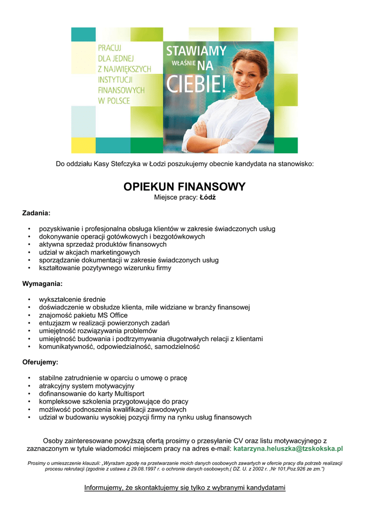 Do oddziału Kasy Stefczyka w Łodzi poszukujemy obecnie kandydata na stanowisko: OPIEKUN FINANSOWY Miejsce pracy: Łódź Zadania: • • • • • • pozyskiwanie i profesjonalna obsługa klientów w zakresie świadczonych usług dokonywanie operacji gotówkowych i bezgotówkowych aktywna sprzedaż produktów finansowych udział w akcjach marketingowych sporządzanie dokumentacji w zakresie świadczonych usług kształtowanie pozytywnego wizerunku firmy Wymagania: • • • • • • • wykształcenie średnie doświadczenie w obsłudze klienta, mile widziane w branży finansowej znajomość pakietu MS Office entuzjazm w realizacji powierzonych zadań umiejętność rozwiązywania problemów umiejętność budowania i podtrzymywania długotrwałych relacji z klientami komunikatywność, odpowiedzialność, samodzielność Oferujemy: • • • • • • stabilne zatrudnienie w oparciu o umowę o pracę atrakcyjny system motywacyjny dofinansowanie do karty Multisport kompleksowe szkolenia przygotowujące do pracy możliwość podnoszenia kwalifikacji zawodowych udział w budowaniu wysokiej pozycji firmy na rynku usług finansowych Osoby zainteresowane powyższą ofertą prosimy o przesyłanie CV oraz listu motywacyjnego z zaznaczonym w tytule wiadomości miejscem pracy na adres e-mail: [email protected] Prosimy o umieszczenie klauzuli: „Wyrażam zgodę na przetwarzanie moich danych osobowych zawartych w ofercie pracy dla potrzeb realizacji procesu rekrutacji (zgodnie z ustawa z 29.08.1997 r. o ochronie danych osobowych,( DZ. U. z 2002 r. ,Nr 101,Poz.926 ze zm.”) Informujemy, że skontaktujemy się tylko z wybranymi kandydatami