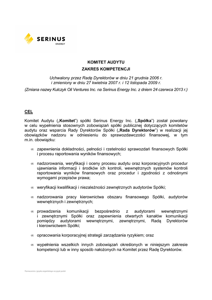KOMITET AUDYTU ZAKRES KOMPETENCJI Uchwalony przez Radę Dyrektorów w dniu 21 grudnia 2006 r. i zmieniony w dniu 27 kwietnia 2007 r. i 12 listopada 2009 r. (Zmiana nazwy Kulczyk Oil Ventures Inc. na Serinus Energy Inc. z dniem 24 czerwca 2013 r.) CEL Komitet Audytu („Komitet”) spółki Serinus Energy Inc. („Spółka”) został powołany w celu wypełnienia stosownych zobowiązań spółki publicznej dotyczących komitetów audytu oraz wsparcia Rady Dyrektorów Spółki („Rada Dyrektorów”) w realizacji jej obowiązków nadzoru w odniesieniu do sprawozdawczości finansowej, w tym m.in. obowiązku: • zapewnienia dokładności, pełności i rzetelności sprawozdań finansowych Spółki i procesu raportowania wyników finansowych; • nadzorowania, weryfikacji i oceny procesu audytu oraz korporacyjnych procedur ujawniania informacji i środków ich kontroli, wewnętrznych systemów kontroli raportowania wyników finansowych oraz procedur i zgodności z odnośnymi wymogami przepisów prawa; • weryfikacji kwalifikacji i niezależności zewnętrznych audytorów Spółki; • nadzorowania pracy kierownictwa obszaru finansowego Spółki, audytorów wewnętrznych i zewnętrznych; • prowadzenia komunikacji bezpośrednio z audytorami wewnętrznymi i zewnętrznymi Spółki oraz zapewnienia otwartych kanałów komunikacji pomiędzy audytorami wewnętrznymi, zewnętrznymi, Radą Dyrektorów i kierownictwem Spółki; • opracowania korporacyjnej strategii zarządzania ryzykiem; oraz • wypełnienia wszelkich innych zobowiązań określonych w niniejszym zakresie kompetencji lub w inny sposób nałożonych na Komitet przez Radę Dyrektorów. Tłumaczenie z języka angielskiego na język polski SKŁAD, PROCEDURY I ORGANIZACJA 1. Komitet składa się z nie mniej niż trzech członków Rady Dyrektorów, z których każdy musi być „niezależny” (pojęcie definiowane okresowo w wymaganiach lub wytycznych dla działalności komitetu audytu zgodnie ze stosownymi przepisami dotyczącymi papierów wartościowych, w tym Zarządzenia Krajowego NI 52-110 Audit Committees [Komitety Audytu] („NI 52-110”) i „finansowo biegły” (w rozumieniu NI 52-110). Skład Komitetu powinien również spełniać wszelkie inne wymagania, które mogą okresowo obowiązywać organy zajmujące się papierami wartościowymi, w tym te, o których mowa w NI 52-110. 2. Jeżeli członek Komitetu zasiada w składzie komitetu audytu więcej niż trzech publicznych spółek, w tym Spółki, Rada Dyrektorów musi ocenić, czy nie osłabi to zdolności tej osoby do efektywnego wypełniania jego obowiązków jako członka Komitetu. 3. Rada Dyrektorów, na swoim spotkaniu organizacyjnym odbywającym się przy okazji corocznego posiedzenia akcjonariuszy Spółki, mianuje członków Komitetu na rok następny. Jeżeli Rada Dyrektorów nie ustanowi składu Komitetu, to osoby, które były członkami Komitetu w roku bezpośrednio poprzedzającym ostatnie coroczne posiedzenie akcjonariuszy Spółki, jeśli pozostają na stanowisku dyrektora Spółki i nadal są uprawnione do zasiadania w Komitecie, należy uznać za ponownie wybrane do składu Komitetu. W dowolnym momencie Rada Dyrektorów może usunąć lub wyznaczyć zastępstwo za każdego członka Komitetu oraz wypełnić wakat w jego składzie. PRZEWODNICZĄCY KOMITETU 4. Jeżeli Rada Dyrektorów nie wyznaczy przewodniczącego Komitetu, członkowie Komitetu wybierają przewodniczącego („Przewodniczący”) spośród siebie. 5. Przewodniczący zapewnia przywództwo Komitetowi i dba o wywiązywanie się Komitetu z jego obowiązków nałożonych jego mandatem. 6. Obowiązki Przewodniczącego: (a) zapewnienie ogólnego przywództwa w celu podniesienia efektywności działań Komitetu; (b) podejmowanie wszystkich uzasadnionych kroków celem zapewnienia, że zadania i obowiązki Komitetu, wynikające z jego mandatu, są dobrze rozumiane przez członków Komitetu i możliwie jak najskuteczniej realizowane; 2 (c) wspieranie etycznego i odpowiedzialnego sposobu podejmowania decyzji przez Komitet i jego indywidualnych członków; (d) przewodzenie Komitetowi w sposób efektywny, nadzorując wszystkie aspekty zarządzania Komitetem, który wypełnia obowiązki nałożone jego mandatem; (e) nadzorowanie struktury, składu, członkostwa i działań delegowanych do Komitetu; (f) dopilnowanie przeprowadzenia co najmniej czterech posiedzeń Komitetu rocznie, oraz dalszych posiedzeń, jeżeli wymaga tego efektywna realizacja jego obowiązków; (g) sporządzanie planu każdego spotkania Komitetu; (h) przewodniczenie wszystkim posiedzeniom Komitetu; jeżeli Przewodniczący jest nieobecny na posiedzeniu, to obecni na nim członkowie Komitetu wybierają niezależnego członka Komitetu, który będzie przewodniczył posiedzeniu; (i) zachęcanie członków Komitetu do zadawania pytań i wyrażania własnych spostrzeżeń na posiedzeniach; (j) skuteczne niwelowanie rozbieżności podglądów i konstruktywne dążenie do podjęcia decyzji i osiągnięcia porozumienia; (k) zapewnienie odrębnych, systematycznych i posiedzeń Komitetu bez udziału kierownictwa; (l) zapewnienie odrębnych, systematycznych, zamkniętych posiedzeń Komitetu z audytorami wewnętrznymi i zewnętrznymi, bez udziału kierownictwa; (m) zapewnienie odrębnych, systematycznych, zamkniętych posiedzeń Komitetu z personelem wewnętrznym lub konsultantami zewnętrznymi, wedle potrzeb lub uznania i bez udziału kierownictwa; (n) po każdym posiedzeniu Komitetu – sporządzanie sprawozdań dla Rady Dyrektorów dotyczących działań i zaleceń Komitetu; (o) zadbanie o to, aby dokumentacja będąca w posiadaniu Komitetu, każdorazowo była dostępna na wniosek każdego dyrektora Spółki; 3 tajnych („in camera”) (p) zapewnienie członkom Komitetu, poprzez podjęcie wszystkich stosownych kroków, dostępu do pisemnej informacji i sprawozdań kierownictwa celem wypełnienia mandatu Komitetu; (q) zapewnienie efektywnej wsp