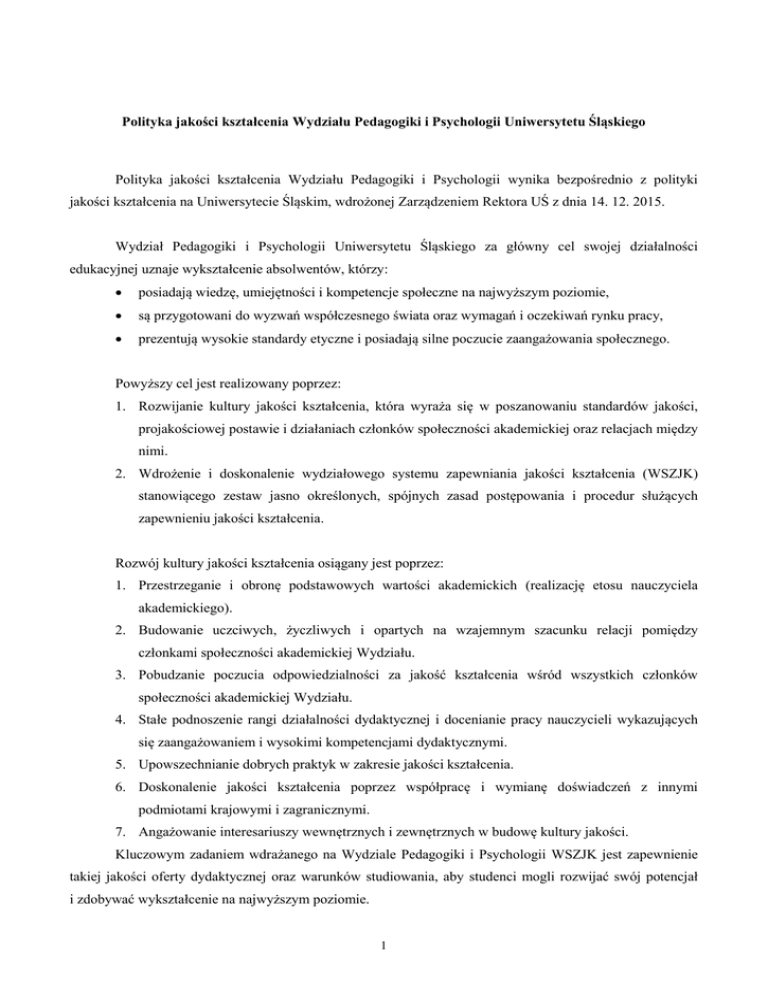 Polityka jakości kształcenia Wydziału Pedagogiki i Psychologii Uniwersytetu Śląskiego Polityka jakości kształcenia Wydziału Pedagogiki i Psychologii wynika bezpośrednio z polityki jakości kształcenia na Uniwersytecie Śląskim, wdrożonej Zarządzeniem Rektora UŚ z dnia 14. 12. 2015. Wydział Pedagogiki i Psychologii Uniwersytetu Śląskiego za główny cel swojej działalności edukacyjnej uznaje wykształcenie absolwentów, którzy: posiadają wiedzę, umiejętności i kompetencje społeczne na najwyższym poziomie, są przygotowani do wyzwań współczesnego świata oraz wymagań i oczekiwań rynku pracy, prezentują wysokie standardy etyczne i posiadają silne poczucie zaangażowania społecznego. Powyższy cel jest realizowany poprzez: 1. Rozwijanie kultury jakości kształcenia, która wyraża się w poszanowaniu standardów jakości, projakościowej postawie i działaniach członków społeczności akademickiej oraz relacjach między nimi. 2. Wdrożenie i doskonalenie wydziałowego systemu zapewniania jakości kształcenia (WSZJK) stanowiącego zestaw jasno określonych, spójnych zasad postępowania i procedur służących zapewnieniu jakości kształcenia. Rozwój kultury jakości kształcenia osiągany jest poprzez: 1. Przestrzeganie i obronę podstawowych wartości akademickich (realizację etosu nauczyciela akademickiego). 2. Budowanie uczciwych, życzliwych i opartych na wzajemnym szacunku relacji pomiędzy członkami społeczności akademickiej Wydziału. 3. Pobudzanie poczucia odpowiedzialności za jakość kształcenia wśród wszystkich członków społeczności akademickiej Wydziału. 4. Stałe podnoszenie rangi działalności dydaktycznej i docenianie pracy nauczycieli wykazujących się zaangażowaniem i wysokimi kompetencjami dydaktycznymi. 5. Upowszechnianie dobrych praktyk w zakresie jakości kształcenia. 6. Doskonalenie jakości kształcenia poprzez współpracę i wymianę doświadczeń z innymi podmiotami krajowymi i zagranicznymi. 7. Angażowanie interesariuszy wewnętrznych i zewnętrznych w budowę kultury jakości. Kluczowym zadaniem wdrażanego na Wydziale Pedagogiki i Psychologii WSZJK jest zapewnienie takiej jakości oferty dydaktycznej oraz warunków studiowania, aby studenci mogli rozwijać swój potencjał i zdobywać wykształcenie na najwyższym poziomie. 1 WSZJK obejmuje w szczególności: 1. Wyznaczanie standardów jakości i tworzenie jednolitych zasad zapewniania jakości kształcenia. 2. Rozszerzanie i uatrakcyjnianie oferty edukacyjnej Wydziału poprzez dbałość o wysoką jakość i doskonalenie programów kształcenia prowadzonych kierunków studiów na wszystkich stopniach kształcenia. 3. Dbałość o wysoką jakość procesu kształcenia. 4. Zapobieganie zjawiskom patologicznym w procesie dydaktycznym oraz wspieranie zwalczania tych zjawisk. 5. Doskonalenie jakości kształcenia poprzez działania upowszechniające dobre praktyki, szkolenia wewnętrzne oraz efektywną współpracę przedstawicieli społeczności akademickiej Wydziału. 6. Monitorowanie poziomu satysfakcji studentów z procesu kształcenia oraz poziomu satysfakcji absolwentów ze studiów. 7. Monitorowanie współpracy z interesariuszami zewnętrznymi i wewnętrznymi oraz wykorzystywanie tych relacji na rzecz podnoszenia jakości kształcenia. 8. Działania zmierzające do zapewnienia wysokiej jakości kadry dydaktycznej. 9. Monitorowanie zasobów wsparcia dydaktycznego i materialnego udzielanego studentom i doktorantom. Za realizację polityki jakości kształcenia na Wydziale Pedagogiki i Psychologii odpowiedzialna jest cała społeczność akademicka Wydziału: władze Wydziału, Instytutów, Katedr i Zakładów, osoby zaangażowane w pracę Wydziałowego Zespołu ds. Jakości Kształcenia, Kierunkowych Zespołów Zapewniania Jakości Kształcenia, zespołów pomocniczych KZZJK, nauczyciele akademiccy, pracownicy administracji, studenci, doktoranci i słuchacze studiów podyplomowych. 2