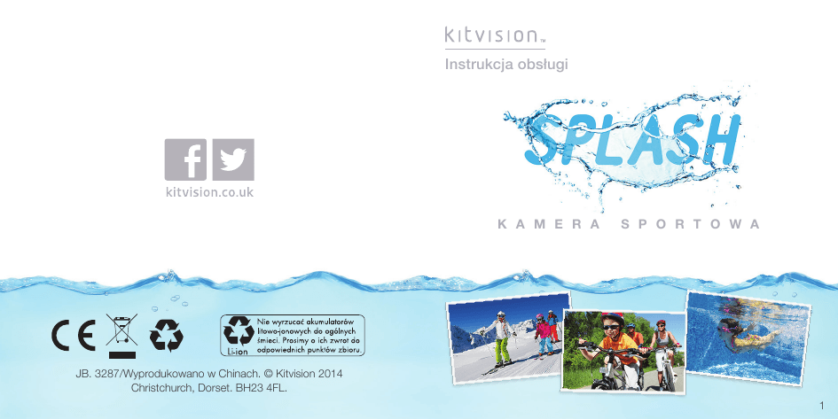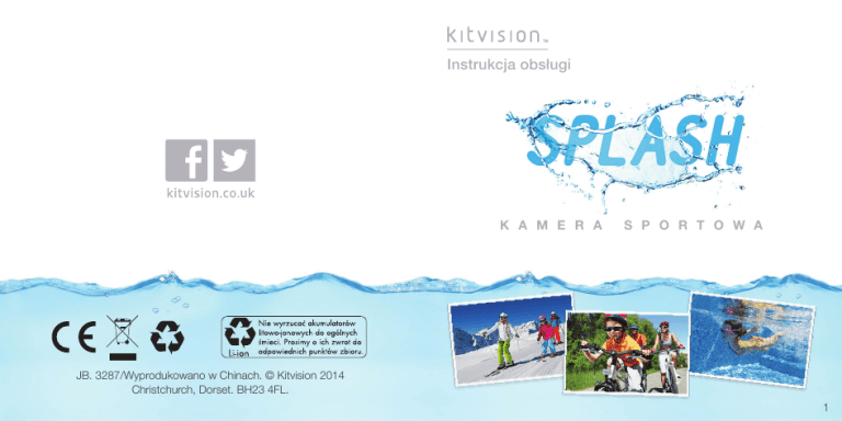 Instrukcja obsługi K A M E R A S P O R T O W A JB. 3287/Wyprodukowano w Chinach. © Kitvision 2014 Christchurch, Dorset. BH23 4FL. 1 Główne funkcje • Obraz Spis treści Główne funkcje 3 Zawartość pudełka 3 Funkcje4 Instrukcje użytkowania Zmiana ustawień kamery 13 Podłączanie kamery 20 Wodoodporna obudowa 23 Uchwyty 24 Specyfikacja Dbanie o Splash Usuwanie problemów 2 6 32 34 35 • Tryb Full HD 1080p robienia zdjęć 12 Mpix • Wodoodporność 15 metrów do Zawartość pudełka • Kamera sportowa Splash • Wodoodporna • Uchwyt obudowa rowerowy • Wentylowany do kasku • Przylepny uchwyt uchwyt do płaskich powierzchni • 2x podkładki samoprzylepne 3M • Uchwyt hakowy • Adapter do uchwytów • Adapter do statywu • Adapter 90 stopni • Instrukcja • Kabel obsługi USB 3 Funkcje 1. Przycisk zasilania/migawki 8. Gwint statywu 2. Wskaźnik stanu 9. Przycisk reset 3. Obiektyw 10.Przycisk trybu 4. Gniazdo Micro USB 11.Wodoodporna obudowa 5. Gniazdo kart Micro SD/TF 12.Klips zabezpieczający 6. Mikrofon 13.Wodoodporny przycisk zasilania/migawki 7. Wyświetlacz LCD 2. 1. 3. 7. 4. 6. 5. 13. 14.Gniazdo Micro HDMI 12. 10. 14. 9. 8. 4 11. 5 Instrukcje użytkowania Włączanie i wyłączanie 1. Wciśnij przycisk ZASILANIA (1), aby włączyć kamerę. 2. Wciśnij i przytrzymaj przycisk ZASILANIA (1), aby wyłączyć kamerę. Ładowanie akumulatora Kamera posiada wbudowany akumulator litowy wielokrotnego ładowania. Prosimy o pełne naładowanie baterii przed pierwszym użyciem. 1. Wyłącz kamerę. 2. Podłącz jeden koniec kabla USB do kamery, a drugi do komputera lub ładowarki USB. 3. Wskaźnik zaświeci się na czerwono w trakcie ładowania. 4. Gdy bateria będzie w pełni naładowana, wskaźnik zgaśnie. Wkładanie karty pamięci Kamera Splash nie posiada wbudowanej pamięci. Aby było możliwe nagrywanie lub robienie zdjęć, należy najpierw wyposażyć kamerę w kartę Micro SD (co najmniej klasy 4). 1. Upewnij się, że kamera jest wyłączona. 2. Włóż swoją kartę pamięci do gniazda TF/Micro SD (5). Kamera używa systemu plików FAT32. Jeśli karta Micro SD jest niekompatybilna, będzie wymagane jej sformatowanie. 3. Aby poprawnie sformatować kartę, przejdź do sekcji „Zmiana ustawień kamery” w dalszej części tej instrukcji i postępuj zgodnie ze wskazówkami opisanymi w „Ogólnych ustawieniach”. Uwaga: Obudowa kamery może się nagrzać po długotrwałym użyciu. Jest to normalne. 6 7 Zmiana trybu kamery Kamera posiada 3 różnych trybów: Tryb zdjęć, tryb nagrywania i tryb odtwarzania. 1. Wciśnij kilkukrotnie przycisk TRYBU (10), aby przełączać się pomiędzy ustawieniami. 8 Tryb nagrywania Służy do nagrywania filmów Tryb zdjęć Służy do robienia zdjęć Tryb odtwarzania Służy do podglądu plików Nagrywanie filmów 1. Po włączeniu kamera automatycznie przejdzie ona do trybu nagrywania. Jeśli będzie wybrany inny tryb, wciśnij przycisk TRYBU (10), aby przejść do trybu nagrywania. 2. Użyj wyświetlacza LCD (7), aby zobaczyć podgląd sceny, a następnie wciśnij przycisk MIGAWKI (1), aby rozpocząć nagrywanie. 3. Na ekranie LCD (7) będzie wyświetlana informacja o długości nagrywania. 4. Wciśnij przycisk MIGAWKI (1) jeszcze raz, aby zakończyć nagrywanie. Uwaga: Kamera automatycznie zakończy nagrywanie, gdy karta pamięci będzie pełna lub wyczerpie się bateria. 9 Nagrywanie filmów z dźwiękiem W przypadku nagrywania z założoną obudową wodoodporną dźwięk będzie rejestrowany, ale będzie ledwo słyszalny. Dla osiągnięcia najlepszych wyników, kamery powinno się używać bez obudowy. Używając kamery bez obudowy należy zachować szczególną ostrożność, aby jej nie zamoczyć. Odtwarzanie plików 1. Włącz kamerę i wciśnij przycisk TRYBU (10), aby przełączyć ją w tryb robienia zdjęć. 2. Wciśnij i przytrzymaj przycisk TRYBU (10), a kamera przejdzie przez wszystkie pliki na karcie Micro SD. Puść przycisk TRYBU (10), a zaznaczenie zatrzyma się na wybranym pliku. Robienie zdjęć 1. Włącz kamerę i wciśnij przycisk TRYBU (10), aby przełączyć ją w tryb robienia zdjęć. 2. Użyj wyświetlacza LCD (7), aby zobaczyć podgląd sceny, a następnie wciśnij przycisk MIGAWKI (1), aby zrobić zdjęcie. 3. Po wykonaniu zdjęcia, zostanie ono na chwilę pokazane na wyświetlaczu LCD (7). 10 11 Podgląd plików wideo 1. Po wybraniu pliku wideo wciśnij przycisk migawki (1). 2. Wyświetlacz LCD (7) pokaże opcje „Delete” (Usuń) oraz „Play” (Odtwórz). 3. Wciśnij przycisk trybu (10), aby wybrać „Delete” (Usuń) albo „Play” (Odtwórz). 4. Aby obejrzeć wideo, wciśnij przycisk migawki (1) i wybierz „Play” (Odtwórz). 5. Aby zatrzymać wideo, wciśnij przycisk trybu (10). 6. Aby usunąć plik, wciśnij przycisk migawki (1) i wybierz „Delete” (Usuń). Następnie wciśnij przycisk trybu (10) i wybierz „Yes” (Tak) - zatwierdź przyciskiem migawki (1). Zmiana ustawień kamery Ogólne ustawienia 1. Aby przejść do menu ogólnych ustawień, wciśnij i przytrzymaj przycisk trybu (10) będąc w trybie nagrywania lub zdjęć. 2. Wciśnij przycisk migawki (1), aby wybrać menu ogólnych ustawień z górnego paska nawigacyjnego. 3. Wciśnij przycisk trybu (10), aby wejść do tego menu. 4. Przycisk trybu (10) pozwoli przewijać dostępne ustawienia, a przycisk migawki (1) ich wybór/zmianę. Usuwanie zdjęć Oglądając zdjęcie możesz je usunąć, jeśli sobie tego życzysz. 1. Wciśnij przycisk migawki (1), a następnie trybu (10), aby wybrać „Yes” (Tak) - zatwierdź operację przyciskiem migawki (1). 12 13 Ustawienia kamery 14 MENU FUNKCJE Date (Data) Ta funkcja może zostać użyta w celu dodania daty do nagrywanych filmów i robionych zdjęć. Aby ustawić datę, wybierz opcję „Set Date” (Ustaw datę) i wciśnij przycisk migawki (1). Edytuj każde ustawienie używając przycisków migawki (1) oraz trybu (10). Po zakończeniu wciśnij i przytrzymaj przycisk tryb