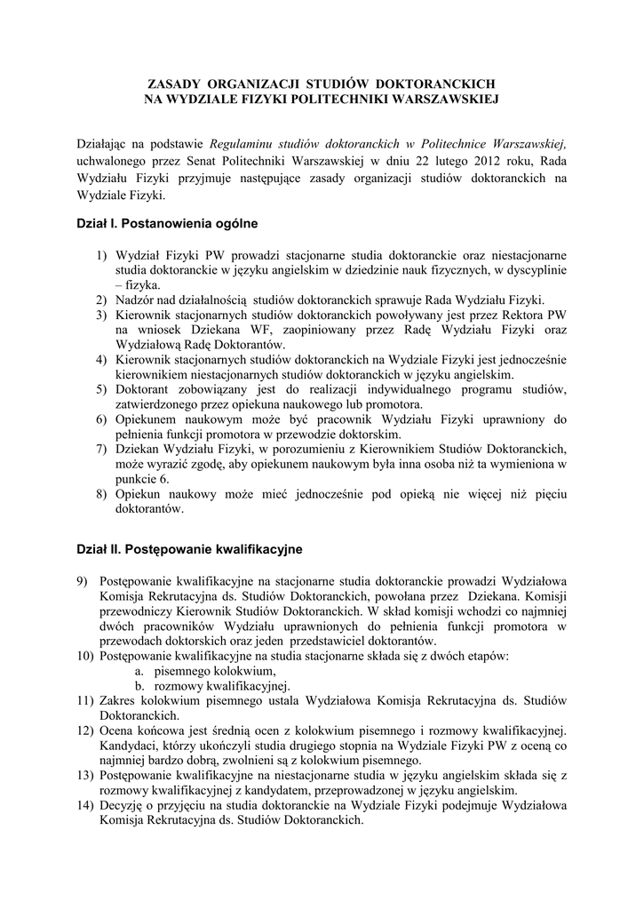 ZASADY ORGANIZACJI STUDIÓW DOKTORANCKICH NA WYDZIALE FIZYKI POLITECHNIKI WARSZAWSKIEJ Działając na podstawie Regulaminu studiów doktoranckich w Politechnice Warszawskiej, uchwalonego przez Senat Politechniki Warszawskiej w dniu 22 lutego 2012 roku, Rada Wydziału Fizyki przyjmuje następujące zasady organizacji studiów doktoranckich na Wydziale Fizyki. Dział I. Postanowienia ogólne 1) Wydział Fizyki PW prowadzi stacjonarne studia doktoranckie oraz niestacjonarne studia doktoranckie w języku angielskim w dziedzinie nauk fizycznych, w dyscyplinie – fizyka. 2) Nadzór nad działalnością studiów doktoranckich sprawuje Rada Wydziału Fizyki. 3) Kierownik stacjonarnych studiów doktoranckich powoływany jest przez Rektora PW na wniosek Dziekana WF, zaopiniowany przez Radę Wydziału Fizyki oraz Wydziałową Radę Doktorantów. 4) Kierownik stacjonarnych studiów doktoranckich na Wydziale Fizyki jest jednocześnie kierownikiem niestacjonarnych studiów doktoranckich w języku angielskim. 5) Doktorant zobowiązany jest do realizacji indywidualnego programu studiów, zatwierdzonego przez opiekuna naukowego lub promotora. 6) Opiekunem naukowym może być pracownik Wydziału Fizyki uprawniony do pełnienia funkcji promotora w przewodzie doktorskim. 7) Dziekan Wydziału Fizyki, w porozumieniu z Kierownikiem Studiów Doktoranckich, może wyrazić zgodę, aby opiekunem naukowym była inna osoba niż ta wymieniona w punkcie 6. 8) Opiekun naukowy może mieć jednocześnie pod opieką nie więcej niż pięciu doktorantów. Dział II. Postępowanie kwalifikacyjne 9) Postępowanie kwalifikacyjne na stacjonarne studia doktoranckie prowadzi Wydziałowa Komisja Rekrutacyjna ds. Studiów Doktoranckich, powołana przez Dziekana. Komisji przewodniczy Kierownik Studiów Doktoranckich. W skład komisji wchodzi co najmniej dwóch pracowników Wydziału uprawnionych do pełnienia funkcji promotora w przewodach doktorskich oraz jeden przedstawiciel doktorantów. 10) Postępowanie kwalifikacyjne na studia stacjonarne składa się z dwóch etapów: a. pisemnego kolokwium, b. rozmowy kwalifikacyjnej. 11) Zakres kolokwium pisemnego ustala Wydziałowa Komisja Rekrutacyjna ds. Studiów Doktoranckich. 12) Ocena końcowa jest średnią ocen z kolokwium pisemnego i rozmowy kwalifikacyjnej. Kandydaci, którzy ukończyli studia drugiego stopnia na Wydziale Fizyki PW z oceną co najmniej bardzo dobrą, zwolnieni są z kolokwium pisemnego. 13) Postępowanie kwalifikacyjne na niestacjonarne studia w języku angielskim składa się z rozmowy kwalifikacyjnej z kandydatem, przeprowadzonej w języku angielskim. 14) Decyzję o przyjęciu na studia doktoranckie na Wydziale Fizyki podejmuje Wydziałowa Komisja Rekrutacyjna ds. Studiów Doktoranckich. Dział III. Organizacja studiów 15) Studia rozpoczynają się pierwszego października oraz pierwszego marca i trwają cztery lata. 16) W uzasadnionych przypadkach uczestnik studiów doktoranckich może uzyskać zgodę kierownika studiów doktoranckich na przedłużenie okresu studiowania łącznie nie więcej niż o 2 lata. Wniosek o przedłużenie okresu odbywania studiów powinien być zaopiniowany przez opiekuna naukowego lub promotora doktoranta. 17) Stacjonarne studia doktoranckie odbywają się wg Programu kształcenia na studiach doktoranckich prowadzonych na Wydziale Fizyki PW, zatwierdzonego przez Radę Wydziału Fizyki PW. 18) Niestacjonarne studia doktoranckie w języku angielskim odbywają się w trybie indywidualnym, ustalonym przez opiekunów naukowych lub promotorów doktorantów. 19) Uczestnik studiów stacjonarnych jest zobowiązany do prowadzenia zajęć dydaktycznych w wymiarze przewidzianym przez Program kształcenia na studiach doktoranckich prowadzonych na Wydziale Fizyki PW. 20) Kierownik studiów doktoranckich organizuje pod koniec roku akademickiego obowiązkowe dla doktorantów studiów stacjonarnych sympozjum doktoranckie, na którym dokonuje oceny realizacji programu studiów doktoranckich oraz prowadzenia badań naukowych przez doktorantów. 21) Doktoranci studiów stacjonarnych są zobowiązani do przedstawienia pisemnego sprawozdania rocznego, zatwierdzonego przez opiekuna naukowego, wg wzoru ogłoszonego przez kierownika studiów doktoranckich. 22) Kierownik studiów doktoranckich pod koniec roku akademickiego dokonuje oceny postępu prac badawczych prowadzonych przez uczestników niestacjonarnych studiów w języku angielskim. Podstawą oceny są pisemne sprawozdania doktorantów tych studiów, zaopiniowane przez ich opiekunów naukowych. Dział IV. Stypendia i pomoc materialna 23) Uczestnik doktoranckich studiów stacjonarnych ma prawo otrzymywać: stypendium doktoranckie, zwiększenie stypendium doktoranckiego z dotacji projakościowej, stypendium Rektora dla najlepszych doktorantów oraz inne formy pomocy materialnej. 24) Stypendia doktoranckie oraz zwiększenie stypendium z dotacji projakościowej przyznawane są na podstawie Regulaminu przyznawania stypendiów doktoranckich oraz zwiększania stypendium doktoranckiego z dotacji projakościowej uczestnikom stacjonarnych studiów doktoranckich Politechniki Warszawskiej. Decyzję o przyznaniu stypendium doktoranckiego oraz zwiększenia stypendium doktoranckiego z dotacji projakościowej podejmuje powołana przez Rektora Wydziałowa Komisja Doktorancka. 25) Stypendium Rektora dla najlepszych doktorantów, stypendium socjalne, stypendium specjalne dla osób niepełnosprawnych oraz zapomogi przyznawane są na podstawie Regulaminu ustalania wysokości, przyznawania i wypłacania świadczeń pomocy materialnej dla studentów i doktorantów Politechniki Warszawskiej. Decyzję o ich przyznaniu podejmuje Wydziałowa Komisja Stypendialna dla Doktorantów, powoływana przez Prodziekana ds. Studenckich Wydziału Fizyki. 26) Wydziałowa Komisja Stypendialna dla Doktorantów, w porozumieniu z Kierownikiem Studiów Doktoranckich, tworzy kryteria ustalania list rankingowych doktorantów. 27) Wydziałowa Ra