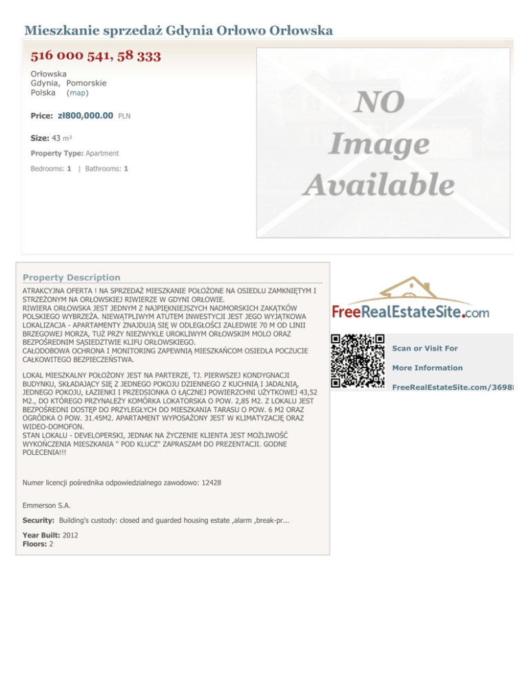Mieszkanie sprzedaż Gdynia Orłowo Orłowska 516 000 541, 58 333 Orłowska Gdynia, Pomorskie Polska (map) Price: zł800,000.00 PLN Size: 43 m² Property Type: Apartment Bedrooms: 1 | Bathrooms: 1 Property Description ATRAKCYJNA OFERTA ! NA SPRZEDAŻ MIESZKANIE POŁOŻONE NA OSIEDLU ZAMKNIĘTYM I STRZEŻONYM NA ORŁOWSKIEJ RIWIERZE W GDYNI ORŁOWIE. RIWIERA ORŁOWSKA JEST JEDNYM Z NAJPIĘKNIEJSZYCH NADMORSKICH ZAKĄTKÓW POLSKIEGO WYBRZEŻA. NIEWĄTPLIWYM ATUTEM INWESTYCJI JEST JEGO WYJĄTKOWA LOKALIZACJA - APARTAMENTY ZNAJDUJĄ SIĘ W ODLEGŁOŚCI ZALEDWIE 70 M OD LINII BRZEGOWEJ MORZA, TUŻ PRZY NIEZWYKLE UROKLIWYM ORŁOWSKIM MOLO ORAZ BEZPOŚREDNIM SĄSIEDZTWIE KLIFU ORŁOWSKIEGO. CAŁODOBOWA OCHRONA I MONITORING ZAPEWNIĄ MIESZKAŃCOM OSIEDLA POCZUCIE CAŁKOWITEGO BEZPIECZEŃSTWA. LOKAL MIESZKALNY POŁOŻONY JEST NA PARTERZE, TJ. PIERWSZEJ KONDYGNACJI BUDYNKU, SKŁADAJĄCY SIĘ Z JEDNEGO POKOJU DZIENNEGO Z KUCHNIĄ I JADALNIĄ, JEDNEGO POKOJU, ŁAZIENKI I PRZEDSIONKA O ŁĄCZNEJ POWIERZCHNI UŻYTKOWEJ 43,52 M2., DO KTÓREGO PRZYNALEŻY KOMÓRKA LOKATORSKA O POW. 2,85 M2. Z LOKALU JEST BEZPOŚREDNI DOSTĘP DO PRZYLEGŁYCH DO MIESZKANIA TARASU O POW. 6 M2 ORAZ OGRÓDKA O POW. 31.45M2. APARTAMENT WYPOSAŻONY JEST W KLIMATYZACJĘ ORAZ WIDEO-DOMOFON. STAN LOKALU - DEVELOPERSKI, JEDNAK NA ŻYCZENIE KLIENTA JEST MOŻLIWOŚĆ WYKOŃCZENIA MIESZKANIA " POD KLUCZ" ZAPRASZAM DO PREZENTACJI. GODNE POLECENIA!!! Numer licencji pośrednika odpowiedzialnego zawodowo: 12428 Emmerson S.A. Security: Building's custody: closed and guarded housing estate ,alarm ,break-pr... Year Built: 2012 Floors: 2 Scan or Visit For More Information FreeRealEstateSite.com/369888