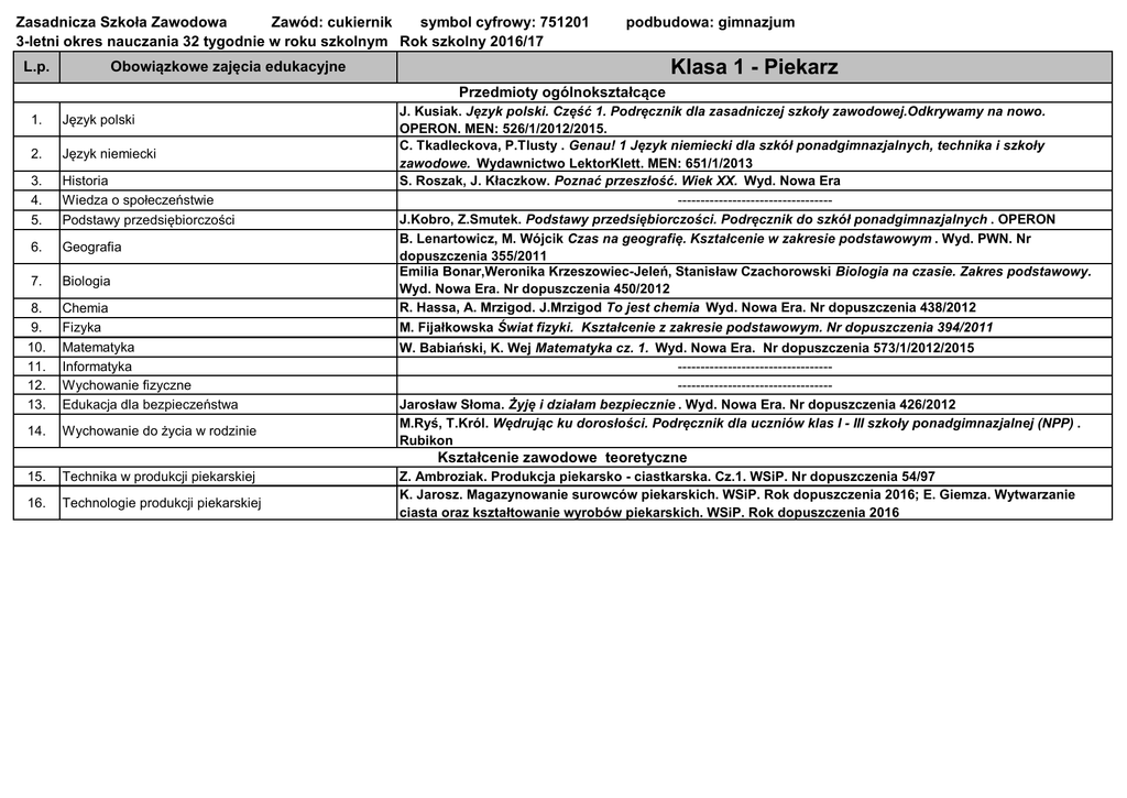 Zasadnicza Szkoła Zawodowa Zawód: cukiernik symbol cyfrowy: 751201 podbudowa: gimnazjum 3-letni okres nauczania 32 tygodnie w roku szkolnym Rok Rokszkolny szkolnyod 2016/17 2013/14 - 2015/16 L.p. Obowiązkowe zajęcia edukacyjne Klasa 1 - Piekarz Przedmioty ogólnokształcące 1. Język polski 2. Język niemiecki 3. 4. 5. Historia Wiedza o społeczeństwie Podstawy przedsiębiorczości 6. Geografia 7. Biologia 8. 9. 10. 11. 12. 13. Chemia Fizyka Matematyka Informatyka Wychowanie fizyczne Edukacja dla bezpieczeństwa 14. Wychowanie do życia w rodzinie 15. Technika w produkcji piekarskiej 16. Technologie produkcji piekarskiej J. Kusiak. Język polski. Część 1. Podręcznik dla zasadniczej szkoły zawodowej.Odkrywamy na nowo. OPERON. MEN: 526/1/2012/2015. C. Tkadleckova, P.Tlusty . Genau! 1 Język niemiecki dla szkół ponadgimnazjalnych, technika i szkoły zawodowe. Wydawnictwo LektorKlett. MEN: 651/1/2013 S. Roszak, J. Kłaczkow. Poznać przeszłość. Wiek XX. Wyd. Nowa Era ---------------------------------J.Kobro, Z.Smutek. Podstawy przedsiębiorczości. Podręcznik do szkół ponadgimnazjalnych . OPERON ( Uczniowie kupują podręcznik z nauczycielem ). B. Lenartowicz, M. Wójcik Czaspo na konsultacji geografię. Kształcenie w zakresie podstawowym . Wyd. PWN. Nr dopuszczenia 355/2011 Emilia Bonar,Weronika Krzeszowiec-Jeleń, Stanisław Czachorowski Biologia na czasie. Zakres podstawowy. Wyd. Nowa Era. Nr dopuszczenia 450/2012 R. Hassa, A. Mrzigod. J.Mrzigod To jest chemia Wyd. Nowa Era. Nr dopuszczenia 438/2012 M. Fijałkowska Świat fizyki. Kształcenie z zakresie podstawowym. Nr dopuszczenia 394/2011 W. Babiański, K. Wej Matematyka cz. 1. Wyd. Nowa Era. Nr dopuszczenia 573/1/2012/2015 ------------------------------------------------------------------Jarosław Słoma. Żyję i działam bezpiecznie . Wyd. Nowa Era. Nr dopuszczenia 426/2012 M.Ryś, T.Król. Wędrując ku dorosłości. Podręcznik dla uczniów klas I - III szkoły ponadgimnazjalnej (NPP) . Rubikon Kształcenie zawodowe teoretyczne Z. Ambroziak. Produkcja piekarsko - ciastkarska. Cz.1. WSiP. Nr dopuszczenia 54/97 K. Jarosz. Magazynowanie surowców piekarskich. WSiP. Rok dopuszczenia 2016; E. Giemza. Wytwarzanie ciasta oraz kształtowanie wyrobów piekarskich. WSiP. Rok dopuszczenia 2016