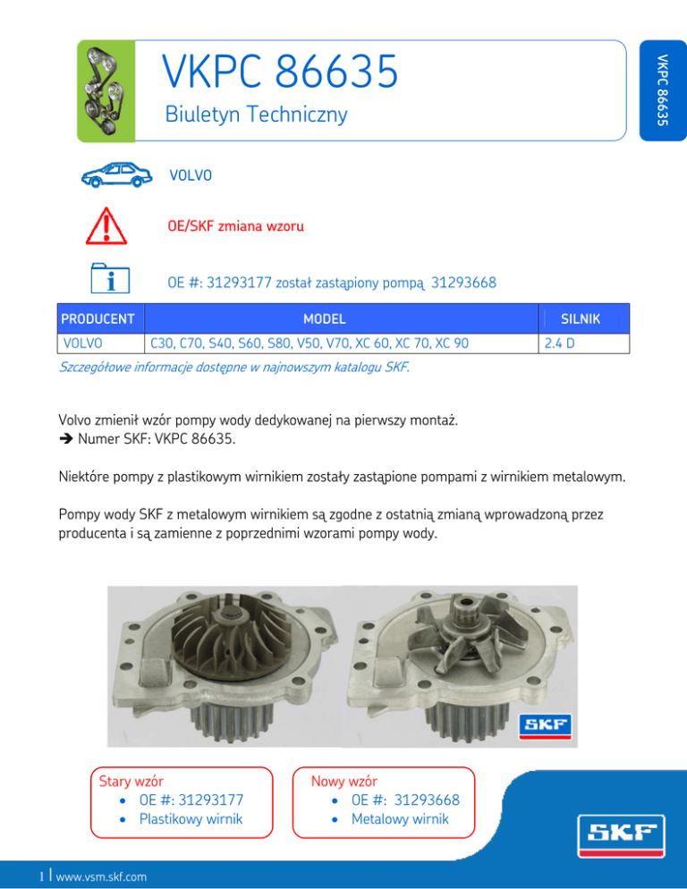 VKPC 86635 VKPC 86635 Biuletyn Techniczny VOLVO OE/SKF zmiana wzoru OE #: 31293177 został zastąpiony pompą 31293668 PRODUCENT VOLVO MODEL C30, C70, S40, S60, S80, V50, V70, XC 60, XC 70, XC 90 SILNIK 2.4 D Szczegółowe informacje dostępne w najnowszym katalogu SKF. Volvo zmienił wzór pompy wody dedykowanej na pierwszy montaż. Numer SKF: VKPC 86635. Niektóre pompy z plastikowym wirnikiem zostały zastąpione pompami z wirnikiem metalowym. Pompy wody SKF z metalowym wirnikiem są zgodne z ostatnią zmianą wprowadzoną przez producenta i są zamienne z poprzednimi wzorami pompy wody. 1 I www.vsm.skf.com Stary wzór OE #: 31293177 Plastikowy wirnik 1 I www.vsm.skf.com Nowy wzór OE #: 31293668 Metalowy wirnik