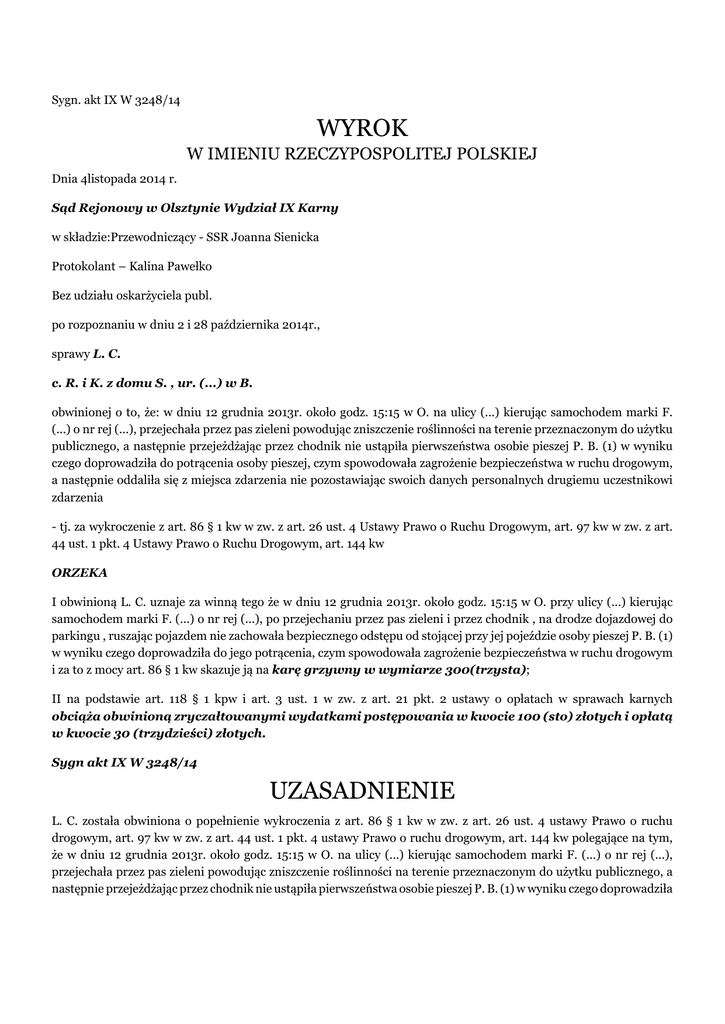 Sygn. akt IX W 3248/14 WYROK W IMIENIU RZECZYPOSPOLITEJ POLSKIEJ Dnia 4listopada 2014 r. Sąd Rejonowy w Olsztynie Wydział IX Karny w składzie:Przewodniczący - SSR Joanna Sienicka Protokolant – Kalina Pawełko Bez udziału oskarżyciela publ. po rozpoznaniu w dniu 2 i 28 października 2014r., sprawy L. C. c. R. i K. z domu S. , ur. (...) w B. obwinionej o to, że: w dniu 12 grudnia 2013r. około godz. 15:15 w O. na ulicy (...) kierując samochodem marki F. (...) o nr rej (...), przejechała przez pas zieleni powodując zniszczenie roślinności na terenie przeznaczonym do użytku publicznego, a następnie przejeżdżając przez chodnik nie ustąpiła pierwszeństwa osobie pieszej P. B. (1) w wyniku czego doprowadziła do potrącenia osoby pieszej, czym spowodowała zagrożenie bezpieczeństwa w ruchu drogowym, a następnie oddaliła się z miejsca zdarzenia nie pozostawiając swoich danych personalnych drugiemu uczestnikowi zdarzenia - tj. za wykroczenie z art. 86 § 1 kw w zw. z art. 26 ust. 4 Ustawy Prawo o Ruchu Drogowym, art. 97 kw w zw. z art. 44 ust. 1 pkt. 4 Ustawy Prawo o Ruchu Drogowym, art. 144 kw ORZEKA I obwinioną L. C. uznaje za winną tego że w dniu 12 grudnia 2013r. około godz. 15:15 w O. przy ulicy (...) kierując samochodem marki F. (...) o nr rej (...), po przejechaniu przez pas zieleni i przez chodnik , na drodze dojazdowej do parkingu , ruszając pojazdem nie zachowała bezpiecznego odstępu od stojącej przy jej pojeździe osoby pieszej P. B. (1) w wyniku czego doprowadziła do jego potrącenia, czym spowodowała zagrożenie bezpieczeństwa w ruchu drogowym i za to z mocy art. 86 § 1 kw skazuje ją na karę grzywny w wymiarze 300(trzysta); II na podstawie art. 118 § 1 kpw i art. 3 ust. 1 w zw. z art. 21 pkt. 2 ustawy o opłatach w sprawach karnych obciąża obwinioną zryczałtowanymi wydatkami postępowania w kwocie 100 (sto) złotych i opłatą w kwocie 30 (trzydzieści) złotych. Sygn akt IX W 3248/14 UZASADNIENIE L. C. została obwiniona o popełnienie wykroczenia z art. 86 § 1 kw w zw. z art. 26 ust. 4 ustawy Prawo o ruchu drogowym, art. 97 kw w zw. z art. 44 ust. 1 pkt. 4 ustawy Prawo o ruchu drogowym, art. 144 kw polegające na tym, że w dniu 12 grudnia 2013r. około godz. 15:15 w O. na ulicy (...) kierując samochodem marki F. (...) o nr rej (...), przejechała przez pas zieleni powodując zniszczenie roślinności na terenie przeznaczonym do użytku publicznego, a następnie przejeżdżając przez chodnik nie ustąpiła pierwszeństwa osobie pieszej P. B. (1) w wyniku czego doprowadziła do potrącenia osoby pieszej, czym spowodowała zagrożenie bezpieczeństwa w ruchu drogowym, a następnie oddaliła się z miejsca zdarzenia nie pozostawiając swoich danych personalnych drugiemu uczestnikowi zdarzenia. Obwiniona L. C. mieszka w O.. Pracuje w Wojewódzkim Zespole (...) w O., osiąga dochód około(...) złotych brutto. Jest mężatką, na utrzymaniu posiada dwoje dzieci. W dniu 12 grudnia 2013 r. około godz. 15:15 obwiniona, po odebraniu 5 letniej córki z przedszkola nr (...) w K. przy ul. (...), jechała pojazdem marki F. (...) o nr rej. (...) do miejsca swego zamieszkania przy ul. (...) w O. na Osiedlu (...). Córka poinformowała obwinioną, że musi skorzystać z toalety, miała problemy z pęcherzem moczowym. W tym okresie prowadzona była przebudowa ul. (...). Z uwagi na remont skrzyżowania ul. (...) z ul. (...) obwiniona korzystała z objazdu . Jechała ul. (...), następnie I. w kierunku ul. (...). Na skrzyżowaniu ul. (...) z ul. (...) obwiniona zjechała z jezdni i po przejechaniu pasa zieleni oraz chodnika wjechała na drogę stanowiącą dojazd do jednego z parkingów przy ul (...), unikając konieczności przejazdu przez remontowane skrzyżowanie. Chodnikiem przy ul. (...) przechodził w tym czasie wracający z pracy pokrzywdzony P. B. (1). Zauważył manewr obwinionej. Kilka dni wcześniej widział już jak kierowcy w podobny sposób przejeżdżali przez pas zieleni i chodnik skracając sobie drogę. Postanowił zwrócić uwagę obwinionej na niewłaściwy sposób jazdy. Pokrzywdzony zszedł z chodnika i wszedł na polbrukową drogę dojazdową do parkingu, stanął przed maską pojazdu obwinionej zmuszając ją do zatrzymania pojazdu. L. K.-C. wysiadła z samochodu . Pomiędzy uczestnikami wywiązała się nerwowa rozmowa. Obwiniona po chwili wsiadła do pojazdu , ruszając nie zachowała bezpiecznego odstępu od pokrzywdzonego P. B. stojącego nadal przy jej samochodzie i doprowadziła do jego potrącenia uderzając lewym narożnikiem pojazdu w lewe kolano pokrzywdzonego. Następnie R. B. kopnął w bok-lewe drzwi pojazdu obwinionej . Obwiniona zatrzymała się kilka metrów dalej wysiadła i obejrzała pojazd czy nie powstały w nim uszkodzenia, a następnie odjechała z miejsca zdarzenia w kierunku domu. P. B. zawiadomił o zdarzeniu Policję. W rozmowie opisał funkcjonariuszom okoliczności zdarzenia wskazując, iż obwiniona omijając go uderzyła go pojazdem w lewe kolano. W dniu 13.12.2013 r. pokrzywdzony udał się do szpitala celem przeprowadzenia obdukcji, gdyż zaczął odczuwać silny ból w kolanie lewej nogi. Stwierdzono stłuczenie lewego kolana bez zmian urazowych w układzie kostnym, staw stabilny. (dowód: notatka urzędowa k. 7, protokół badania stanu trzeźwości k. 8, k. 9, protokół oględzin pojazdu k. 10, szkic miejsca zdarzenia k. 11, karta informacyjna z pobytu w izbie przyjęć k. 14, płyta CD-R z nagraniem z miejsca zdarzenia k. 15, płyta CD-R ze zdjęciami z miejsca zdarzenia k. 21, zdjęcia miejsca zdarzenia k. 32, płyta CD-R ze zdjęciami z oględzin pojazdu obwinionej k. 102, mapa sytuacyjna k. 33-34, kopia notatników służbowych k. 49-59, wyjaśnienia obwinionej k. 36-36v., k. 103-103v., zeznania P. J. k. 37, k. 104-104v., zeznania P. K. k. 37v., k. 106-106v., zeznania P. B. k. 12, k. 37v.-38, k.104v.-105, ) Obwiniona nie przyznała się do popełnienia zarzucanych jej wykroczeń. Potwi