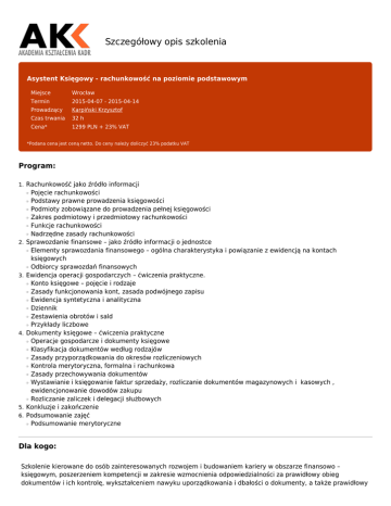 Szczegółowy opis szkolenia Asystent Księgowy - rachunkowość na poziomie podstawowym Miejsce Wrocław Termin 2015-04-07 - 2015-04-14 Prowadzący Karpiński Krzysztof Czas trwania 32 h Cena* 1299 PLN + 23% VAT *Podana cena jest ceną netto. Do ceny należy doliczyć 23% podatku VAT Program: 1. Rachunkowość jako źródło informacji Pojęcie rachunkowości Podstawy prawne prowadzenia księgowości Podmioty zobowiązane do prowadzenia pełnej księgowości Zakres podmiotowy i przedmiotowy rachunkowości Funkcje rachunkowości Nadrzędne zasady rachunkowości Sprawozdanie finansowe – jako źródło informacji o jednostce Elementy sprawozdania finansowego – ogólna charakterystyka i powiązanie z ewidencją na kontach księgowych Odbiorcy sprawozdań finansowych Ewidencja operacji gospodarczych – ćwiczenia praktyczne. Konto księgowe – pojęcie i rodzaje Zasady funkcjonowania kont, zasada podwójnego zapisu Ewidencja syntetyczna i analityczna Dziennik Zestawienia obrotów i sald Przykłady liczbowe Dokumenty księgowe – ćwiczenia praktyczne Operacje gospodarcze i dokumenty księgowe Klasyfikacja dokumentów według rodzajów Zasady przyporządkowania do okresów rozliczeniowych Kontrola merytoryczna, formalna i rachunkowa Zasady przechowywania dokumentów Wystawianie i księgowanie faktur sprzedaży, rozliczanie dokumentów magazynowych i kasowych , ewidencjonowanie dowodów zakupu Rozliczanie zaliczek i delegacji służbowych Konkluzje i zakończenie Podsumowanie zajęć Podsumowanie merytoryczne ❍ ❍ ❍ ❍ ❍ ❍ 2. ❍ ❍ 3. ❍ ❍ ❍ ❍ ❍ ❍ 4. ❍ ❍ ❍ ❍ ❍ ❍ ❍ 5. 6. ❍ Dla kogo: Szkolenie kierowane do osób zainteresowanych rozwojem i budowaniem kariery w obszarze finansowo – księgowym, poszerzeniem kompetencji w zakresie wzmocnienia odpowiedzialności za prawidłowy obieg dokumentów i ich kontrolę, wykształceniem nawyku uporządkowania i dbałości o dokumenty, a także prawidłowy proces komunikacyjny z tym związany. Cel: Celem kursu jest przygotowanie do pracy na stanowisku asystenta księgowego. Kurs ma charakter praktycznych zajęć. Korzyści: ● ● ● Zapoznanie się z podstawowymi zagadnieniami z zakresu regulacji prawnych dotyczących organizacji rachunkowości w jednostce, a także rodzajami zdarzeń gospodarczych, zasadami ich dokumentowania i ewidencji Wysoka wartość praktyczna. Zajęcia prowadzą trenerzy z bogatym doświadczeniem w prowadzeniu ksiąg rachunkowych i badaniu sprawozdań finansowych Prezentujemy liczne przykłady liczbowe i odwołujemy się do praktyki Wykładowca: Karpiński Krzysztof Krzysztof Karpiński jest wieloletnim specjalistą, wykładowcą i doradcą w zakresie rachunkowości i podatków. Autor artykułów prasowych. Od ponad 17 lat prowadzi szkolenia i kursy w zakresie podatków dochodowych, podatku od towarów i usług, rachunkowości oraz kursów kadrowo-płacowych. Wieloletni praktyk, od ponad 20 lat zajmuje się księgowością. Pracował na stanowiskach dyrektora finansowego oraz głównego księgowego. Prowadzi własne biuro rachunkowe. Posiada certyfikat Ministerstwa Finansów. Odbył aplikację na biegłego rewidenta. Pracował lub doradzał dla wielu firm z branży – budowlanej, transportowej, filmowej, stoczniowej, maszynowej, chemicznej, spożywczej, odzieżowej, sanitarnej, szkoleniowej, meblowej i handlowej. W trakcie pracy szkoleniowej zrealizował ok. 2000 dni szkoleniowych, szkoląc ponad 10000 osób, pracowników różnych szczebli służb finansowo księgowych. Szczegóły organizacyjne: Koszt uczestnictwa: • -jednej osoby 1299 plus 23% VAT, razem 1597.77 • -VAT- zw. –obowiązuje jednostki budżetowe składające oświadczenie o rodzaju środków finansowych. • -kolejnych osób - prosimy o kontakt Terminy spotkań: -7,8,13,14 kwietnia Cena obejmuje: • -uczestnictwo w szkoleniu • -serwis kawowy • -obiad • -materiały szkoleniowe • -certyfikat ukończenia Płatności: • Prosimy realizować na konto 81 1950 0001 2006 0677 2567 0002 po otrzymaniu zaproszenia. Miejsce szkolenia: • Szkolenie jest realizowane w centrum konferencyjnym zlokalizowanym w centrum miasta, • Nazwa i adres zostanie Państwu przekazana w zaproszeniu. Zaproszenie zawiera: • -temat szkolenia • -miejsce • -godziny realizacji Informacje: • Tel. 601-955-320 • Fax. (46)8332636 • e-mail. [email protected]; www.akkonline.pl