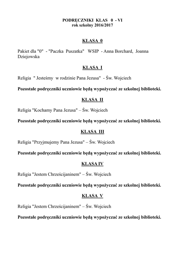 PODRĘCZNIKI KLAS 0 - VI rok szkolny 2016/2017 KLASA 0 Pakiet dla "0" - "Paczka Puszatka" WSIP - Anna Borchard, Joanna Dziejowska KLASA I Religia " Jesteśmy w rodzinie Pana Jezusa" - Św. Wojciech Pozostałe podręczniki uczniowie będą wypożyczać ze szkolnej biblioteki. KLASA II Religia "Kochamy Pana Jezusa" – Św. Wojciech Pozostałe podręczniki uczniowie będą wypożyczać ze szkolnej biblioteki. KLASA III Religia "Przyjmujemy Pana Jezusa" – Św. Wojciech Pozostałe podręczniki uczniowie będą wypożyczać ze szkolnej biblioteki. KLASA IV Religia "Jestem Chrześcijaninem" – Św. Wojciech Pozostałe podręczniki uczniowie będą wypożyczać ze szkolnej biblioteki. KLASA V Religia "Jestem Chrześcijaninem" – Św. Wojciech Pozostałe podręczniki uczniowie będą wypożyczać ze szkolnej biblioteki. KLASA VI Religia "Wierzę w Kościół" – Św. Wojciech Język polski "Między nami" - GWO Jęxzyk angielski LOOK 3- Pearson Muzyka "Muzyczny świat' – MAC edukacja Plastyka "Do dzieła " - Nowa Era Historia i społeczeństwo "Wczoraj i dziś" – Nowa Era Przyroda "Tajemnice przyrody" – Nowa Era Matematyka "matematyka z kluczem" – Nowa Era Zajęcia techniczne " Technika w kl. IV-VI – Nowa Era Zajęcia komputerowe "zajęcia komputerowe" grażyna Koba – Migra