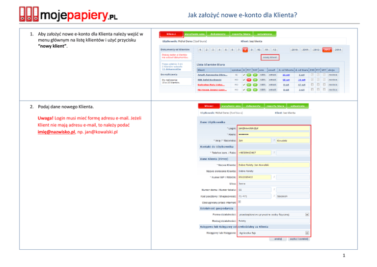 Jak założyć nowe e-konto dla Klienta? 1. Aby założyć nowe e-konto dla Klienta należy wejść w menu głównym na listę kllientów i użyć przycisku “nowy klient”. 2. Podaj dane nowego Klienta. Uwaga! Login musi mieć formę adresu e-mail. Jeżeli Klient nie mają adresu e-mail, to należy podać imię@nazwisko.pl, np. [email protected] 1 3. Na dole okna naciśnij “zapisz i zamknij”. 2 4. System założy nowe e-konto Klienta i login dostępowy dla właściciela firmy. Uwaga! System nie wysyła do Klienta żadnego powiadomienia o rejestracji w systemie. Login i hasło przekaż Klientowi osobiście. 3