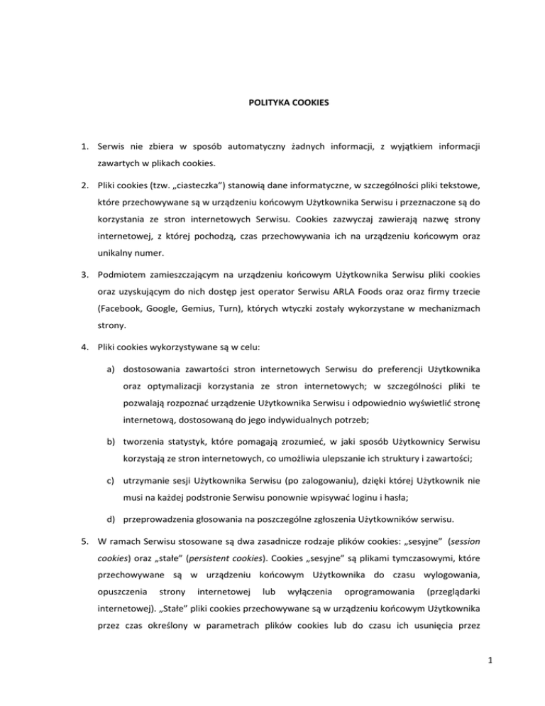 POLITYKA COOKIES 1. Serwis nie zbiera w sposób automatyczny żadnych informacji, z wyjątkiem informacji zawartych w plikach cookies. 2. Pliki cookies (tzw. „ciasteczka”) stanowią dane informatyczne, w szczególności pliki tekstowe, które przechowywane są w urządzeniu końcowym Użytkownika Serwisu i przeznaczone są do korzystania ze stron internetowych Serwisu. Cookies zazwyczaj zawierają nazwę strony internetowej, z której pochodzą, czas przechowywania ich na urządzeniu końcowym oraz unikalny numer. 3. Podmiotem zamieszczającym na urządzeniu końcowym Użytkownika Serwisu pliki cookies oraz uzyskującym do nich dostęp jest operator Serwisu ARLA Foods oraz oraz firmy trzecie (Facebook, Google, Gemius, Turn), których wtyczki zostały wykorzystane w mechanizmach strony. 4. Pliki cookies wykorzystywane są w celu: a) dostosowania zawartości stron internetowych Serwisu do preferencji Użytkownika oraz optymalizacji korzystania ze stron internetowych; w szczególności pliki te pozwalają rozpoznać urządzenie Użytkownika Serwisu i odpowiednio wyświetlić stronę internetową, dostosowaną do jego indywidualnych potrzeb; b) tworzenia statystyk, które pomagają zrozumieć, w jaki sposób Użytkownicy Serwisu korzystają ze stron internetowych, co umożliwia ulepszanie ich struktury i zawartości; c) utrzymanie sesji Użytkownika Serwisu (po zalogowaniu), dzięki której Użytkownik nie musi na każdej podstronie Serwisu ponownie wpisywać loginu i hasła; d) przeprowadzenia głosowania na poszczególne zgłoszenia Użytkowników serwisu. 5. W ramach Serwisu stosowane są dwa zasadnicze rodzaje plików cookies: „sesyjne” (session cookies) oraz „stałe” (persistent cookies). Cookies „sesyjne” są plikami tymczasowymi, które przechowywane są w urządzeniu końcowym Użytkownika do czasu wylogowania, opuszczenia strony internetowej lub wyłączenia oprogramowania (przeglądarki internetowej). „Stałe” pliki cookies przechowywane są w urządzeniu końcowym Użytkownika przez czas określony w parametrach plików cookies lub do czasu ich usunięcia przez 1 Użytkownika. 6. W ramach Serwisu stosowane są następujące rodzaje plików cookies: a) „niezbędne” pliki cookies, umożliwiające korzystanie z usług dostępnych w ramach Serwisu, np. uwierzytelniające pliki cookies wykorzystywane do usług wymagających uwierzytelniania w ramach Serwisu; b) pliki cookies służące do zapewnienia bezpieczeństwa, np. wykorzystywane do wykrywania nadużyć w zakresie uwierzytelniania w ramach Serwisu; c) „wydajnościowe” pliki cookies, umożliwiające zbieranie informacji o sposobie korzystania ze stron internetowych Serwisu; d) „funkcjonalne” pliki cookies, umożliwiające „zapamiętanie” wybranych przez Użytkownika ustawień i personalizację interfejsu Użytkownika, np. w zakresie wybranego języka lub regionu, z którego pochodzi Użytkownik, rozmiaru czcionki, wyglądu strony internetowej itp.; e) „reklamowe” pliki cookies, umożliwiające dostarczanie Użytkownikom treści reklamowych bardziej dostosowanych do ich zainteresowań. f) pliki cookies umożliwiające przeprowadzenie głosowania na zgłoszenia dodawane przez Użytkowników Serwisu. 7. W wielu przypadkach oprogramowanie służące do przeglądania stron internetowych (przeglądarka internetowa) domyślnie dopuszcza przechowywanie plików cookies w urządzeniu końcowym Użytkownika. Użytkownicy Serwisu mogą dokonać w każdym czasie zmiany ustawień dotyczących plików cookies. Ustawienia te mogą zostać zmienione w szczególności w taki sposób, aby blokować automatyczną obsługę plików cookies w ustawieniach przeglądarki internetowej bądź informować o ich każdorazowym zamieszczeniu w urządzeniu Użytkownika Serwisu. Szczegółowe informacje o możliwości i sposobach obsługi plików cookies dostępne są w ustawieniach oprogramowania (przeglądarki internetowej). 8. Operator Serwisu informuje, że ograniczenia stosowania plików cookies mogą wpłynąć na niektóre funkcjonalności dostępne na stronach internetowych Serwisu. 9. Pliki cookies zamieszczane w urządzeniu końcowym Użytkownika Serwisu i wykorzystywane mogą być również przez współpracujących z operatorem Serwisu reklamodawców oraz 2 partnerów. 10. Więcej informacji na temat plików cookies dostępnych jest w sekcji „Pomoc” w menu przeglądarki internetowej. 3