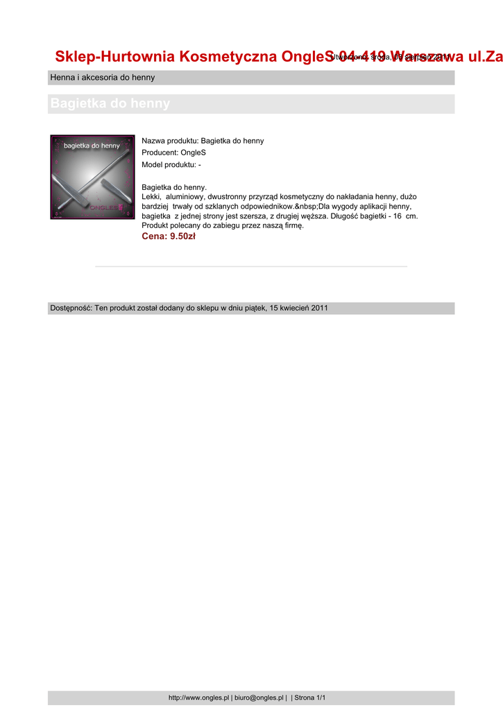 środa,Warszawa 03 sierpień 2011 Sklep-Hurtownia Kosmetyczna OngleSUtworzono: 04-419 ul.Za Henna i akcesoria do henny Bagietka do henny Nazwa produktu: Bagietka do henny Producent: OngleS Model produktu: Bagietka do henny. Lekki, aluminiowy, dwustronny przyrząd kosmetyczny do nakładania henny, dużo bardziej trwały od szklanych odpowiednikow. Dla wygody aplikacji henny, bagietka z jednej strony jest szersza, z drugiej węższa. Długość bagietki - 16 cm. Produkt polecany do zabiegu przez naszą firmę. Cena: 9.50zł Dostępność: Ten produkt został dodany do sklepu w dniu piątek, 15 kwiecień 2011 http://www.ongles.pl | [email protected] | | Strona 1/1