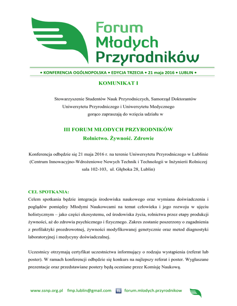 • KONFERENCJA OGÓLNOPOLSKA • EDYCJA TRZECIA • 21 maja 2016 • LUBLIN • KOMUNIKAT I Stowarzyszenie Studentów Nauk Przyrodniczych, Samorząd Doktorantów Uniwersytetu Przyrodniczego i Uniwersytetu Medycznego gorąco zapraszają do wzięcia udziału w III FORUM MŁODYCH PRZYRODNIKÓW Rolnictwo. Żywność. Zdrowie Konferencja odbędzie się 21 maja 2016 r. na terenie Uniwersytetu Przyrodniczego w Lublinie (Centrum Innowacyjno-Wdrożeniowe Nowych Technik i Technologii w Inżynierii Rolniczej sala 102-103, ul. Głęboka 28, Lublin) CEL SPOTKANIA: Celem spotkania będzie integracja środowiska naukowego oraz wymiana doświadczenia i poglądów pomiędzy Młodymi Naukowcami na temat człowieka i jego rozwoju w ujęciu holistycznym – jako części ekosystemu, od środowiska życia, rolnictwa przez etapy produkcji żywności, aż do zdrowia psychicznego i fizycznego. Zakres zostanie poszerzony o zagadnienia z profilaktyki prozdrowotnej, żywności modyfikowanej genetycznie oraz metod diagnostyki laboratoryjnej i medycyny doświadczalnej. Uczestnicy otrzymają certyfikat uczestnictwa informujący o rodzaju wystąpienia (referat lub poster). W ramach konferencji odbędzie się konkurs na najlepszy referat i poster. Wygłaszane prezentacje oraz przedstawiane postery będą oceniane przez Komisję Naukową. www.ssnp.org.pl [email protected] forum.mlodych.przyrodnikow • KONFERENCJA OGÓLNOPOLSKA • EDYCJA TRZECIA • 21 maja 2016 • LUBLIN • ZASADY UCZESTNICTWA I PREZENTOWANIA PRAC: 1. Uczestnikami wygłaszającymi prace podczas konferencji mogą być studenci i doktoranci kierunków przyrodniczych oraz medycznych. 2. Prace przeglądowe lub badawcze mogą być prezentowane w formie: a. referatu (maksymalnie jeden, czas prezentacji: 10 minut) lub b. posteru (format 70cm x 90cm, orientacja pionowa). 3. Prace mogą być prezentowane zarówno w języku polskim jak i w języku angielskim. 4. W przypadku referatów przewidziana jest ograniczona liczba miejsc. Komitet organizacyjny zastrzega sobie prawo wyboru najlepszych streszczeń spośród wszystkich nadesłanych prac. Prace badawcze będą miały pierwszeństwo w wyborze spośród nadesłanych abstraktów. 5. Pierwsze wystąpienie (referat/poster) jest bezpłatne za kolejne należy uiścić opłatę w wysokości 70zł. 6. Istnieje możliwość publikacji artykułu w czasopiśmie „Nauki Przyrodnicze” (numer ISSN 2353-13-71, lista B, 2 pkt. w wykazie MNiSW). www.ssnp.org.pl [email protected] forum.mlodych.przyrodnikow • KONFERENCJA OGÓLNOPOLSKA • EDYCJA TRZECIA • 21 maja 2016 • LUBLIN • TERMINY: 06.05.2016r. – zgłoszenia udziału: https://docs.google.com/forms/d/1AXFIZZpdnc1LlbMMxfSyrAQKCYoLquMIIUOf 8lKbacM/viewform 06.05.2016r. – przesłanie zgodnego ze wzorem streszczenia referatu i/lub posteru na adres email: [email protected] 06.05.2016r. – wniesienie opłaty za dodatkowy poster/wystąpienie na numer (w tytule przelewu należy podać imię, nazwisko, formę wystąpienia) Stowarzyszenie Studentów Nauk Przyrodniczych ul. Akademicka 13 20-950 Lublin nr konta 44 1540 1144 2114 6408 0848 0001 15.05.2016r. – przesłanie prezentacji w formacie PowerPoint 29.05.2016r. – przesłanie przygotowanego zgodnie z wymogami artykułu (http://www.naukiprzyrodnicze.ssnp.org.pl) na adres email: [email protected] www.ssnp.org.pl [email protected] forum.mlodych.przyrodnikow