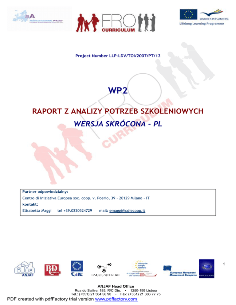 Project Number LLP-LDV/TOI/2007/PT/12 WP2 RAPORT Z ANALIZY POTRZEB SZKOLENIOWYCH WERSJA SKRÓCONA - PL Partner odpowiedzialny: Centro di Iniziativa Europea soc. coop. v. Poerio, 39 – 20129 Milano - IT kontakt: Elisabetta Maggi tel +39.0220524729 mail: [email protected] 1 ANJAF Head Office Rua do Salitre, 185, R/C Dto. • 1250-199 Lisboa Tel.: (+351) 21 384 56 90 • Fax: (+351) 21 386 77 75 PDF created with pdfFactory trial version www.pdffactory.com INDEX WPROWADZENIE................................................................................................................3 ANALIZA RAPORTU .............................................................................................................4 WYWIADY........................................................................................................................6 GRUPY DOCELOWE........................................................................................................... 10 WNIOSKI KOŃCOWE .......................................................................................................... 11 SŁABE STRONY............................................................................................................. 13 PROPOZYCJE KOŃCOWE ................................................................................................. 13 2 ANJAF Head Office Rua do Salitre, 185, R/C Dto. • 1250-199 Lisboa Tel.: (+351) 21 384 56 90 • Fax: (+351) 21 386 77 75 PDF created with pdfFactory trial version www.pdffactory.com WPRWADZENIE Międzynarodowy projekt “FRO Curriculum” oraz raport końcowy są współfinansowane przez Unię Europejską w ramach Programu Działań w dziedzinie Uczenie się przez całe życie- Lifelong Learning programme LEONARDO DA VINCI. W skład partnerstwa utworzonego dla potrzeb realizacji projektu wchodzi 7 przedstawicieli reprezentujących organizacje typu NGO, MŚP oraz Izby Handlowe pochodzące z 5 różnych krajów: ANJAF (PT), European Movement International (BE), Centro di Iniziativa Europea (IT), European Association of Women Resource Centres (SV), Regional Association of Veneto Chambers of Commerce (IT), Business and Development Center (PL), Encounter AB (SV) Zawiązane partnerstwo posiada rozległą wiedzę w dziedzinach niezbędnych dla sprawnej realizacji projektu: VET, równe szanse, równość płci, systemy zarządzania, współpraca na rzecz odpowiedzialności społecznej, rozwój MŚP oraz procesy innowacyjne. Poniższy raport jest pierwszym krokiem uczynionym w celu zdefiniowania i określenia jasnego i zrozumiałego profile profesjonalnego i jednocześnie służy stworzeniu i opracowaniu nowego programu szkoleniowego dla nauczycieli i trenerów. Aby osiągnąć założone cele w stopniu maksymalnym posłużyliśmy się wieloma narzędziami takimi jak: analiza potrzeb, raporty oraz wywiady z przedstawicielami grup docelowych. Definicja wszechstronnego profilu profesjonalnego oraz stworzenie nowego programu szkoleniowego są rzeczywistym wynikiem końcowym projektu FRO curriculum . FRO Curriculum odpowiada na potrzeby zwiększenia profesjonalnych kwalifikacji wśród nauczycieli i szkoleniowców w zakresie równych szans oraz polityki zgodności we Włoszech, Polsce, Portugalii i Szwecji. Wyższe kwalifikacje umożliwią nauczycielom i szkoleniowcom oferowanie odpowiednich szkoleń dla przedsiębiorców skoncentrowanych na systemach zarządzania polityką równych szans i organizacjami zajmującymi się rodzinami- Family Responsible Organisations (FRO). Europejskie firmy, a zwłaszcza MSP, zmagają się z wzrastającą globalną konkurencją wymuszającą nową wiedzę, umiejętności i nowe rozwiązania polityczne. Badania pokazują korelację pomiędzy równymi szansami, polityką sprzyjającą rodzinie a zyskownością w przedsiębiorstwach. Równość szans jest uznawana jako “konieczny warunek do osiągnięcia celów EU w zakresie wzrostu zatrudnienia i spójności społecznej”. VET jest ważnym narzędziem umacniającym wdrażanie systemu zarządzania równych szans, ale brak ofert szkoleniowych w tej dziedzinie dla MŚP, ich zarządców i menadżerów. Częściowo możne to tłumaczyć fakt, że niewielu nauczycieli i szkoleniowców posiada odpowiednią wiedzę i świadomość jak równowaga życia zawodowego wpływa na równość szans. 3 ANJAF Head Office Rua do Salitre, 185, R/C Dto. • 1250-199 Lisboa Tel.: (+351) 21 384 56 90 • Fax: (+351) 21 386 77 75 PDF created with pdfFactory trial version www.pdffactory.com ANALIZA RAOPRTU Raport ten potwierdza, iż w Europie istnieje wiele ścieżek rozwojowych I szkoleniowych dla menadżerów zarządzających zasobami ludzkimi. W rzeczywistości, w firmach we Włoszech jest ciągły brak szkoleń I kursów, nie tylko na poziomie podstawowym I średnim, ale również pośród osób które są odpowiedzialne za kierowanie zasobami ludzkimi. Takie same potrzeby szkoleniowe można zaobserwować w innych pozostałych krajach biorących udział w projekcie (Polska, Portugalia I Szwecja), nawet gdy w tym samym przypadku wątpliwości wzbudza jakość oferowanych ścieżek rozwoju (np. Polska) lub ogólny poziom edukacji jest dość niski (Portugalia). Pomimo tego tylko niektóre z tych kursów szkoleniowych naprawdę odnoszą się do zagadnień związanych z równością szans oraz równowagi pomiędzy pracą zawodową a życiem prywatnych. Chociaż ostatnio zaobserwować można wzrastającą liczbę proponowanych kursów i osób prowadzących takie szklenia w sposób profesjonalny w tej kwestii. Niemniej jednak wciąż tylko niektórzy nauczyciele i trenerzy, który prowadzą takie szkolenia posiadają niezbędną wiedzę i świadomość jak równowaga życia zawodowego i prywatnego wpływa na problem równych szans. O ile z jednej strony istnieje duże zróżnicowanie kursów szkoleniowych w zagadnieniu równości ze względu na płeć oferowanych przez różnorodne instytucje takie jak: uniwersytety, pry