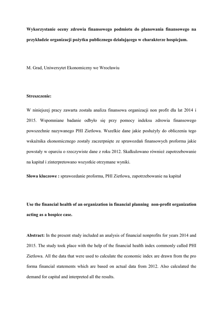 Wykorzystanie oceny zdrowia finansowego podmiotu do planowania finansowego na przykładzie organizacji pożytku publicznego działającego w charakterze hospicjum. M. Grad, Uniwersytet Ekonomiczny we Wrocławiu Streszczenie: W niniejszej pracy zawarta została analiza finansowa organizacji non profit dla lat 2014 i 2015. Wspomniane badanie odbyło się przy pomocy indeksu zdrowia finansowego powszechnie nazywanego PHI Zietlowa. Wszelkie dane jakie posłużyły do obliczenia tego wskaźnika ekonomicznego zostały zaczerpnięte ze sprawozdań finansowych proforma jakie powstały w oparciu o rzeczywiste dane z roku 2012. Skalkulowano również zapotrzebowanie na kapitał i zinterpretowano wszystkie otrzymane wyniki. Słowa kluczowe : sprawozdanie proforma, PHI Zietlowa, zapotrzebowanie na kapitał Use the financial health of an organization in financial planning non-profit organization acting as a hospice case. Abstract: In the present study included an analysis of financial nonprofits for years 2014 and 2015. The study took place with the help of the financial health index commonly called PHI Zietlowa. All the data that were used to calculate the economic index are drawn from the pro forma financial statements which are based on actual data from 2012. Also calculated the demand for capital and interpreted all the results. Key words: report proforma PHI Zietlowa, the demand for capital JEL : D92, L29, L31, M21 Recenzent 1 T. Tomczyk https://eportal.ue.wroc.pl/blog/index.php?entryid=228 Recenzent 2 D. Placek https://eportal.ue.wroc.pl/blog/index.php?entryid=229 Wstęp Rozwój wiedzy w zakresie ekonomi (a w szczególności analizy finansowej) na przestrzeni ostatnich kilkudziesięciu lat spowodował pojawienie się licznych modeli i wskaźników ekonomicznych pozwalających ocenić kondycję finansową podmiotów gospodarczych a nawet wykorzystać zdobytą w ten sposób wiedzę dla celów planowania finansowego. Wspomniany postęp naukowy umożliwił nie tylko obiektywne spojrzenie na aktualny stan finansowy badanych jednostek ale również na trafne przewidzenie ich przyszłości. Wszystko to pozytywnie oddziałuje na firmy i pomaga im osiągnąć stabilny rozwój. Jednym z najbardziej cenionych i najczęściej stosowanych wskaźników ekonomicznych jest wskaźnik zdrowia finansowego powszechnie znanym pod nazwą PHI Zietlowa lub FHI Zietlowa którego zbyt wysoka lub zbyt niska wartość jest sygnałem występowania określonych zjawisk. Z racji tego, iż został on stworzony z myślą o badaniu organizacji non profit ,do niniejszego raportu wykorzystującego indeks zdrowia finansowego dla celów planowania finansowego wybrano organizację pożytku publicznego działającą w charakterze hospicjum1. Skalkulowanie wartości PHI Zietlowa dla lat 2014 i 2015 było możliwe jedynie dzięki sporządzeniu sprawozdań finansowych proforma2 badanej jednostki za wspomniany okres. Tworząc sprawozdania proforma przyjęto założenie o corocznym wzroście przychodów organizacji non profit. Wspomniane założenie wynika z racji ciągłego wzrastania wartości funduszy jakie są przekazywane fundacjom i organizacjom pożytku publicznego w ramach akcji „1% podatku dochodowego” które to na przykład w roku 20123 były o 5 procent wyższe niż w roku 20114. Przewidując zwiększenie się wpływu darowizn na rzecz badanego podmiotu kierowano się również prognozowanym (dla Polski) przez Komisję Europejską wzrostem gospodarczym na lata 2014 i 20155 a ponad to coraz to większą świadomością społeczną i chęcią udziału w programie przekazywania jednego procenta podatku na szczytne cele. Dodatkową korzyścią płynącą z utworzenia sprawozdań przyszłych okresów jest możliwość oszacowania wielkości zapotrzebowania na kapitał dla danej jednostki. 1 http://www.mpips.gov.pl/bip/wykaz-organizacji-pozytku-publicznego/#akapit1 Pluta Wiesław, Planowanie finansowe w przedsiębiorstwie, strona 143 3 http://www.jedenprocentpodatku.pl/index.php?p=statystyki&a=1proc_2012 4 http://www.jedenprocentpodatku.pl/index.php?p=statystyki&a=1proc_2011 5 http://wyborcza.biz/biznes/1,101562,14896558,Bruksela_prognozuje_w_Polsce_wzrost_PKB_o_2_3_proc_.ht ml 2 Indeks zdrowia finansowego pozwalający zidentyfikować słabe i mocne strony przedsiębiorstwa obliczany jest ze wzoru : Równanie 1 Wskaźnik zdrowia finansowego ϕ= (0,10 x kategorie ogólne) + (0,40 x kategorie natychmiastowe) + (0,30 x kategorie krótkoterminowe) + (0,20 x kategorie średnioterminowe) źródło: Zietlow J., A Financial Health Index for Achieving Nonprofit Financial Sustainability gdzie: ϕ oznacza wartość indeksu zdrowia finansowego. Jak wynika z powyższego wzoru wartość wskaźnika PHI Zietlowa uzależniona jest od czterech kategorii : ogólnej, natychmiastowej, krótkoterminowej i średnioterminowej. Natomiast na wspomniane kategorie składa się piętnaście wskaźników i odpowiednio im przypisane wagi. Kategoria pierwsza zwana ogólną zawiera w sobie trzy wskaźniki : wskaźnik logarytmu naturalnego wieku, wskaźnik logarytmu naturalnego rozmiaru i wskaźnik niestabilności aktywów. W przypadku pierwszej wartości ekonomicznej pożądane są jak największe jej wartości. Dzieje się tak z racji tego, iż im starsza jest jednostka tym większe doświadczenie posiada ponad to osiąga lepszą pozycję na rynku a także jest szybciej rozpoznawana przez konsumentów i bardziej przez nich szanowana. Natomiast wskaźnik logarytmu naturalnego rozmiaru informuje o poziomie stabilności i elastyczności finansowej badanego przedsiębiorstwa. Wart podkreślenia jest fakt, iż tak jak w przypadku wcześniej omawianego wskaźnika wartości logarytmu naturalnego rozmiaru powinna być jak największa. Trzecią składową kategorii ogólnej jest wskaźnik niestabilności aktywów. który to jest miarą elastyczności finansowej podmiotu gospodarczego. Duża nieprzewidywalność aktywów czyni podejmowanie (przez osoby zarządzające fir