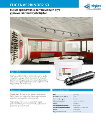 FUGENVERBINDER 63 klej do spoinowania perforowanych płyt gipsowo-kartonowych Rigiton Opis produktu Klej Fugenverbinder 63 ma postać jednorodnej, gęstej masy koloru szarego. Składa się z wodnych dyspersji polimerowych i wypełniaczy mineralnych. Dostarczany jest w postaci gotowej do stosowania, w opakowaniach 7kg (wiadro) i 600 ml (kartusz). Zastosowanie Produkt służy do klejenia płyt gipsowo-kartonowych Rigips Rigiton pomiędzy sobą. Najczęściej stosuje się do wykonywania sufitów podwieszanych. Klej może być stosowany we wszystkich typach pomieszczeń budynków mieszkalnych, użyteczności publicznej i przemysłowych. Właściwości produktu Kolor jasnoszary Pozostałość na sicie 200 µm < 1% Klasa reakcji na ogień B-s2, d0 Odporność na wilgoć większa niż 70% RH Gęstość 1600 g/dm3 Czas wstępnego twardnienia ok. 30 minut Czas ostatecznego twardnienia 24 godziny (+20°C, 65% RH) Zużycie ok. 0,1 kg/m2 Temperatura stosowania minimum +5°C FUGENVERBINDER 63 klej do spoinowania perforowanych płyt gipsowo-kartonowych Rigiton Przygotowanie podłoża Przed nanoszeniem kleju krawędzie płyt gipsowokartonowych należy oczyścić z kurzu i zwilżyć wodą przy pomocy pędzla lub gąbki. Sposób użycia Klej Fugenverbinder 63 jest dostarczany w postaci gotowej do użycia. Klej nanosimy na oczyszczone i zwilżone krawędzie płyt szpachelką lub pistoletem do wyciskania. Po sklejeniu płyt należy odczekać około 30 minut do „zaskórkowania” w celu ewentualnego usunięcia nadmiaru kleju wyciśniętego ze spoin. Pełną wytrzymałość klej uzyskuje po 24 godzinach w typowych warunkach klimatycznych (+20°C i 65% wilgotności względnej powietrza). Klej należy stosować tylko w temperaturach dodatnich, powyżej +5°C. Ważne informacje Produkt zgodny z Aprobatą Techniczną ITB AT-15-8497/2012. Bezpieczeństwo Produkt jest nietoksyczny w trakcie użycia i podczas eksploatacji, mimo to należy stosować odpowiednie środki ochronne: okulary, maski. Produkt nie zawiera substancji klasyfikowanych jako niebezpieczne. W przypadku dostania się mieszanki do oczu należy przemyć je czystą wodą. Przechowywanie Przechowywać w oryginalnych i zamkniętych opakowaniach, chronić przed przemarzaniem. Okres przechowywania 24 miesiące od daty produkcji. Klej z otwartych i napoczętych pojemników można wykorzystywać przez 3 miesiące pod warunkiem szczelnego zamknięcia. Saint-Gobain Construction Products Polska Sp. z o.o. Biuro Rigips w Warszawie ul. Cybernetyki 9 02-677 Warszawa Tel. +48 22 457 14 57 lub 8 Fax +48 22 457 14 55 Dział techniczny 801 328 788 www.rigips.pl Dane zawarte w niniejszej ulotce stanowią wyłącznie opis produktu. Są to ogólne wskazówki oparte na naszej wiedzy i doświadczeniach i nie odnoszą się do konkretnych zastosowań. Stale ulepszając i rozwijając oferowane przez naszą firmę produkty, zastrzegamy sobie prawo do zmiany parametrów bez uprzedniego informowania. Prezentowane dane nie mogą stanowić podstawy do jakichkolwiek roszczeń. W razie potrzeby prosimy zwrócić się do Działu Technicznego Rigips. sierpień 2014 produkt: FUGENVERBINDER 63 – klej do spoinowania perforowanych płyt gipsowo-kartonowych Rigiton – str. 2/2