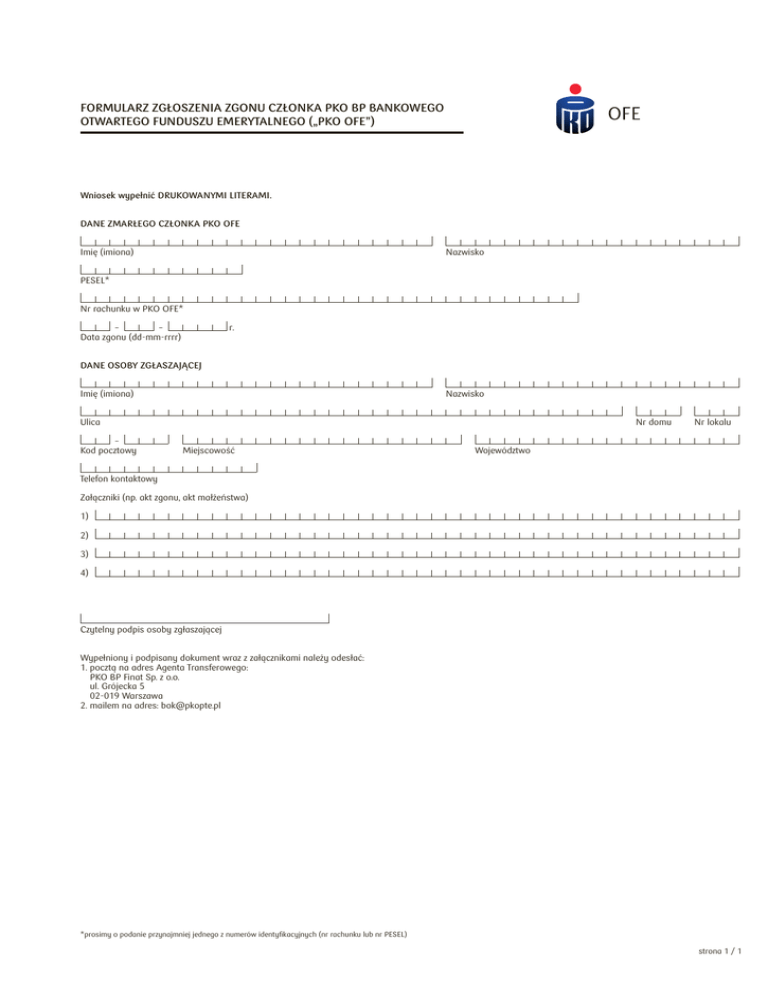FORMULARZ ZGŁOSZENIA ZGONU CZŁONKA PKO BP BANKOWEGO OTWARTEGO FUNDUSZU EMERYTALNEGO („PKO OFE”) Wniosek wypełnić DRUKOWANYMI LITERAMI. DANE ZMARŁEGO CZŁONKA PKO OFE Imię (imiona)Nazwisko PESEL* Nr rachunku w PKO OFE* – – Data zgonu (dd-mm-rrrr) r. DANE OSOBY ZGŁASZAJĄCEJ Imię (imiona)Nazwisko UlicaNr domuNr lokalu – Kod pocztowyMiejscowośćWojewództwo Telefon kontaktowy Załączniki (np. akt zgonu, akt małżeństwa) 1) 2) 3) 4) Czytelny podpis osoby zgłaszającej Wypełniony i podpisany dokument wraz z załącznikami należy odesłać: 1. p ocztą na adres Agenta Transferowego: PKO BP Finat Sp. z o.o. ul. Grójecka 5 02-019 Warszawa 2. mailem na adres: [email protected] *prosimy o podanie przynajmniej jednego z numerów identyfikacyjnych (nr rachunku lub nr PESEL) strona 1 / 1